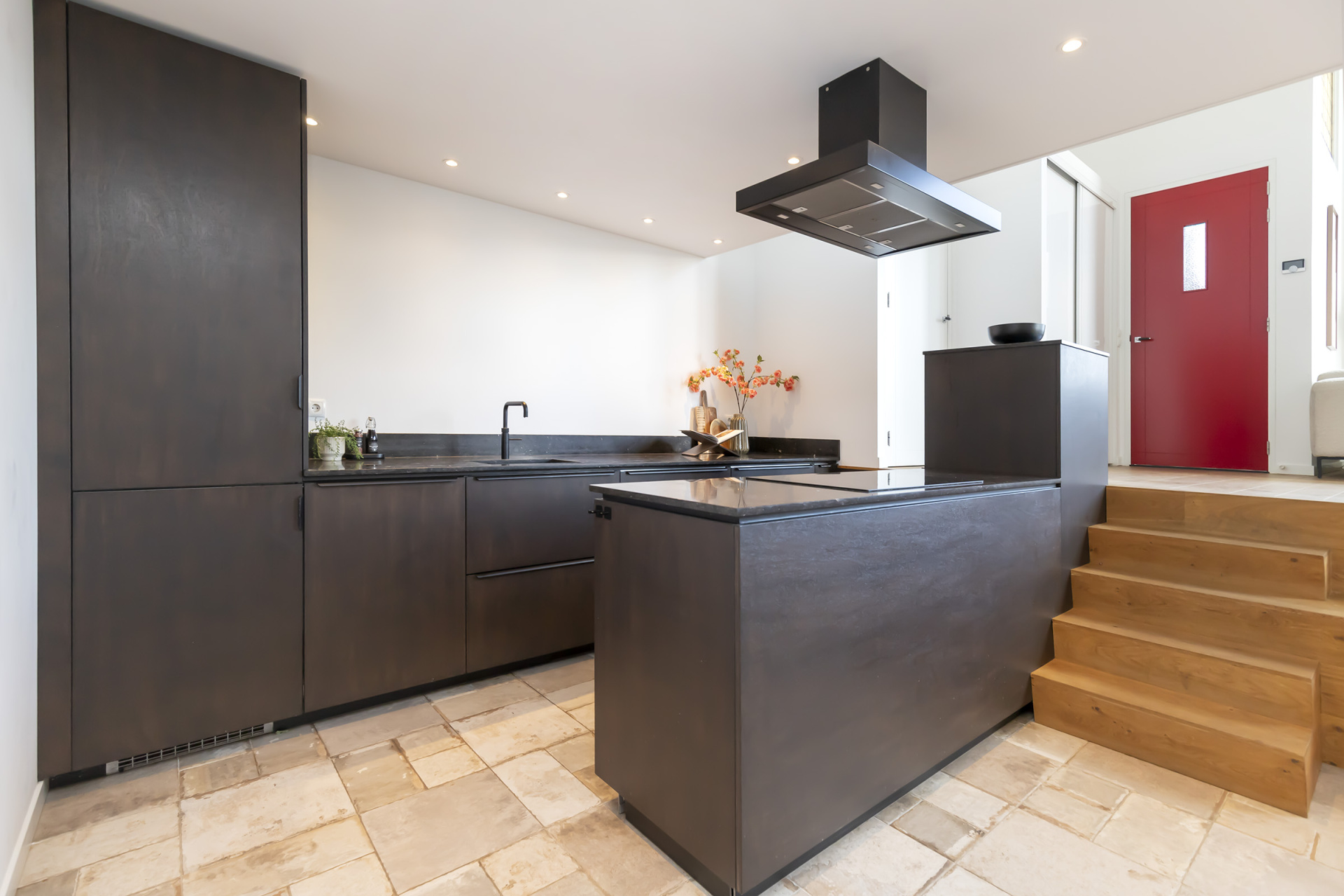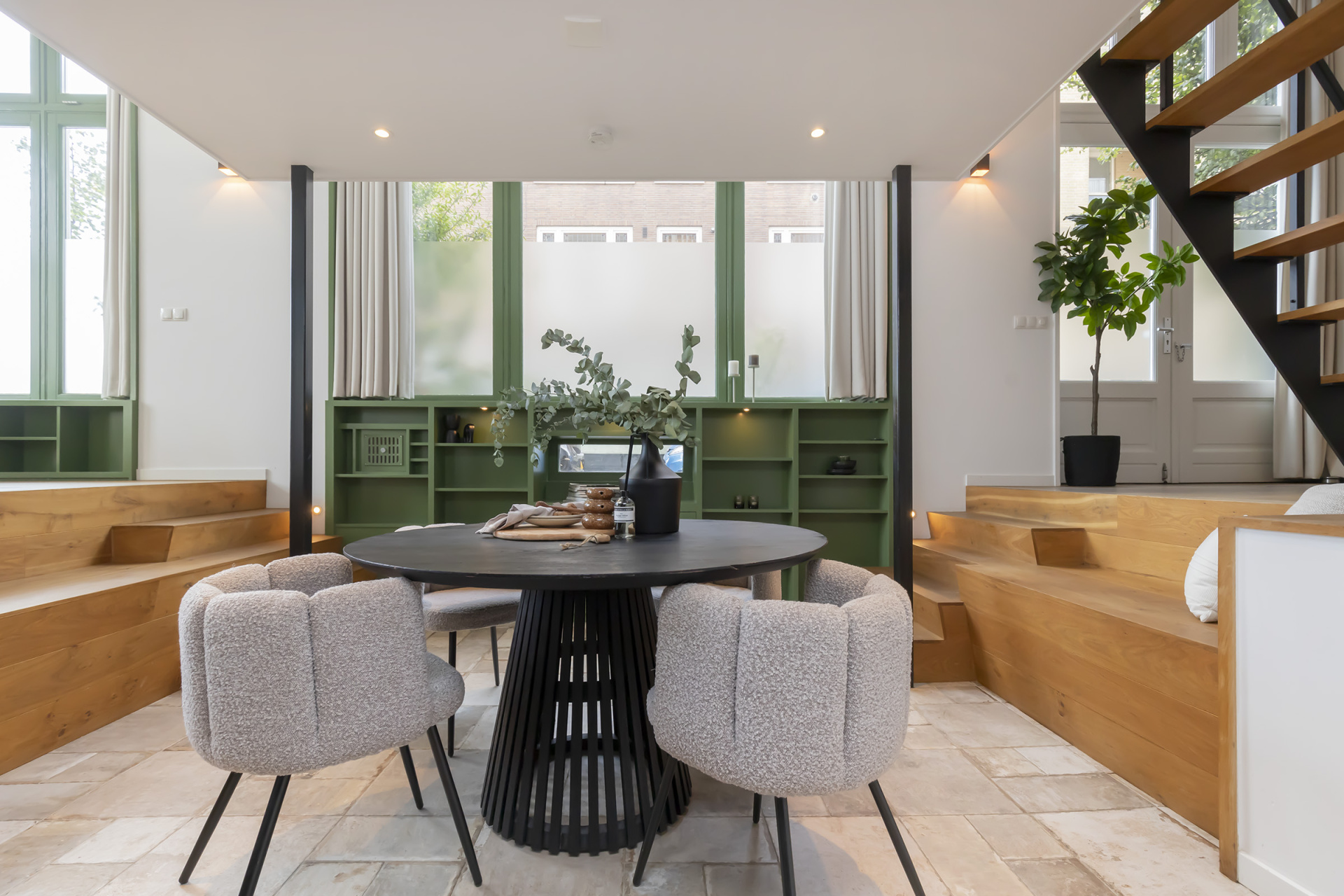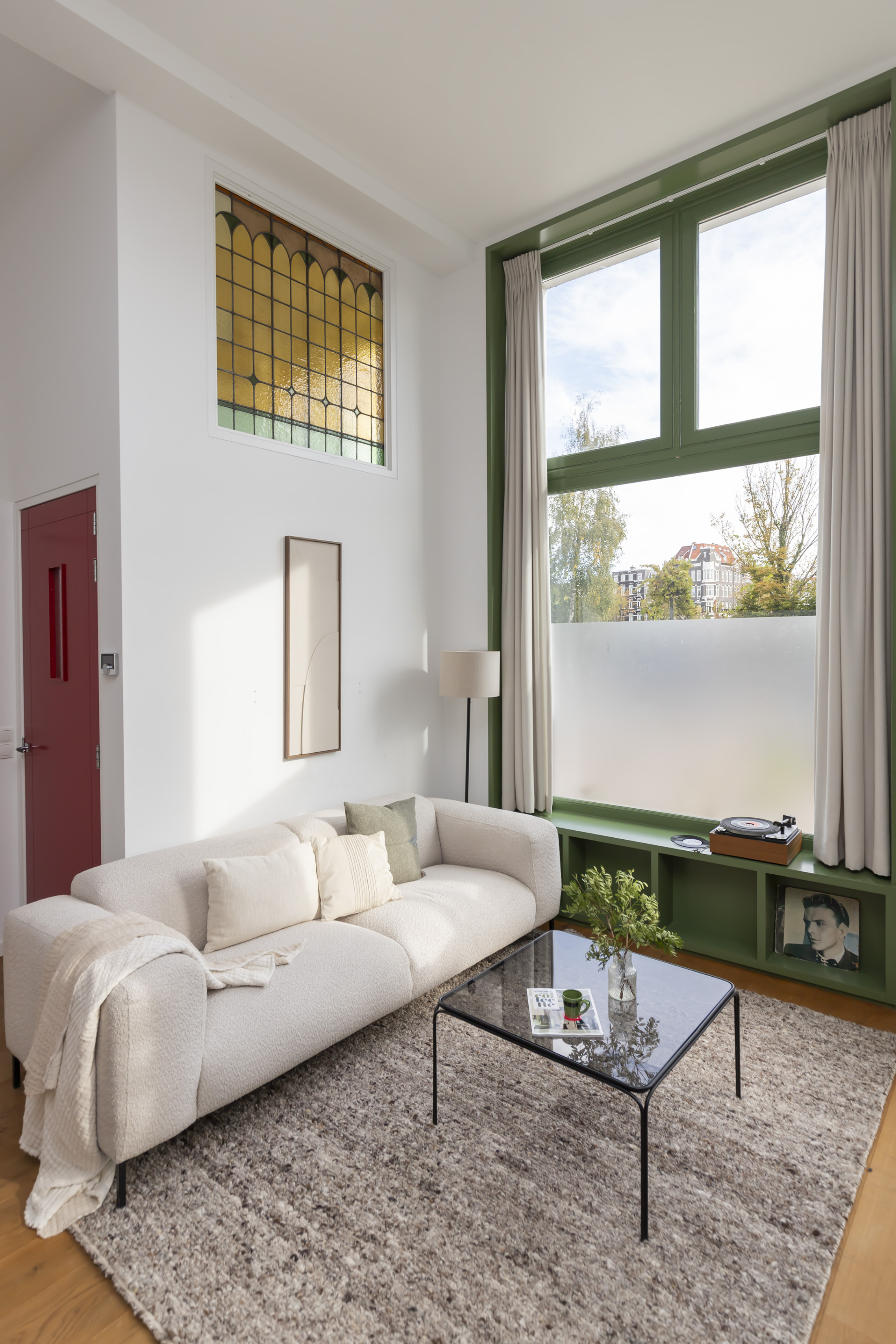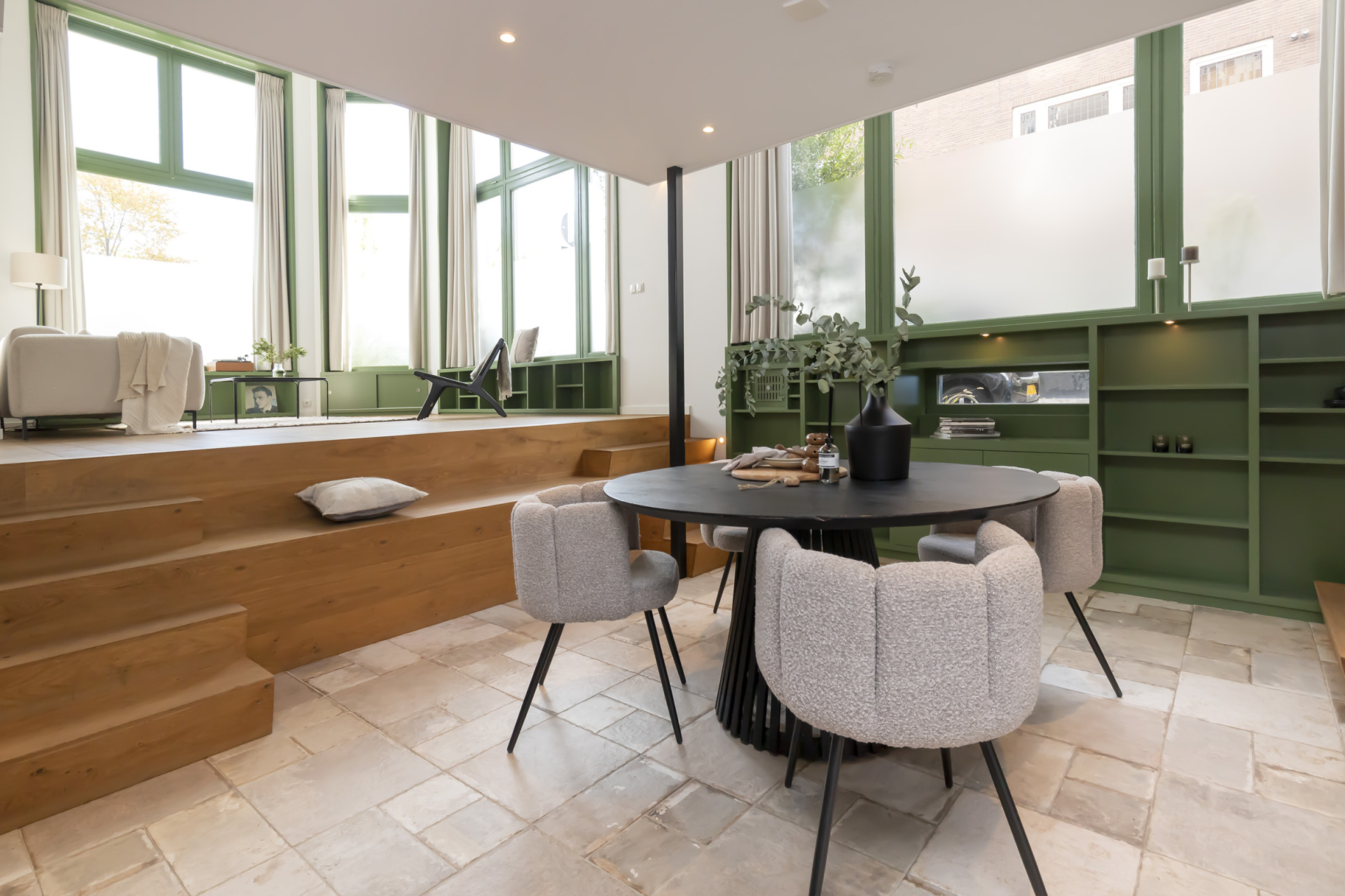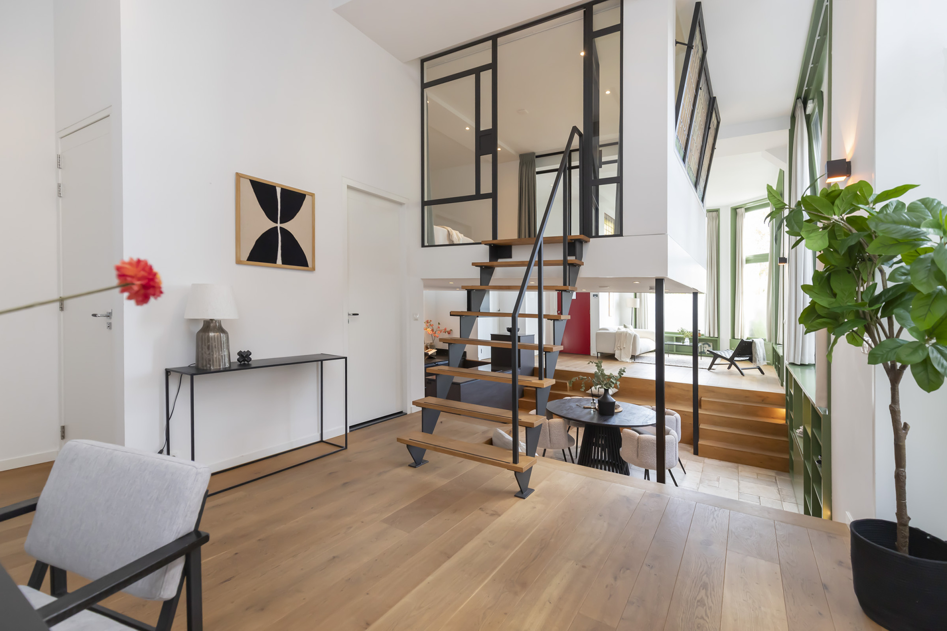 Een woning die zich onderscheidt door zijn speelse indeling, hoge plafonds en industriële details, gecombineerd met een warme en stijlvolle afwerking.