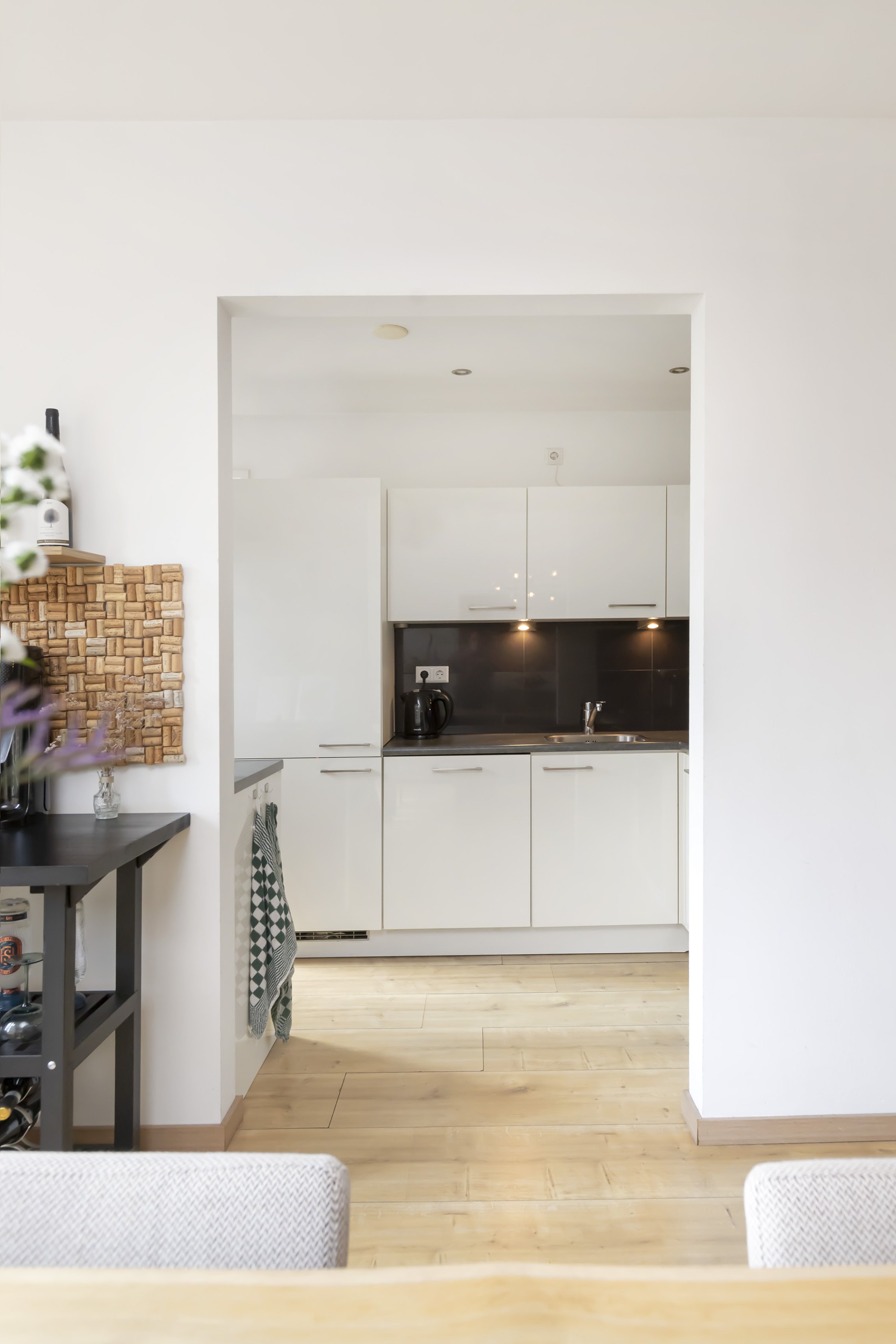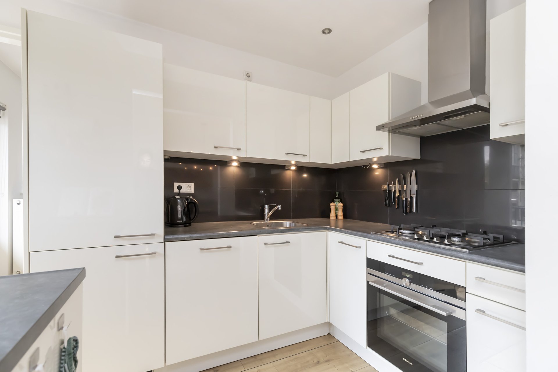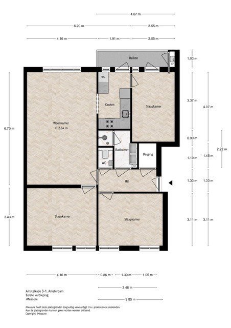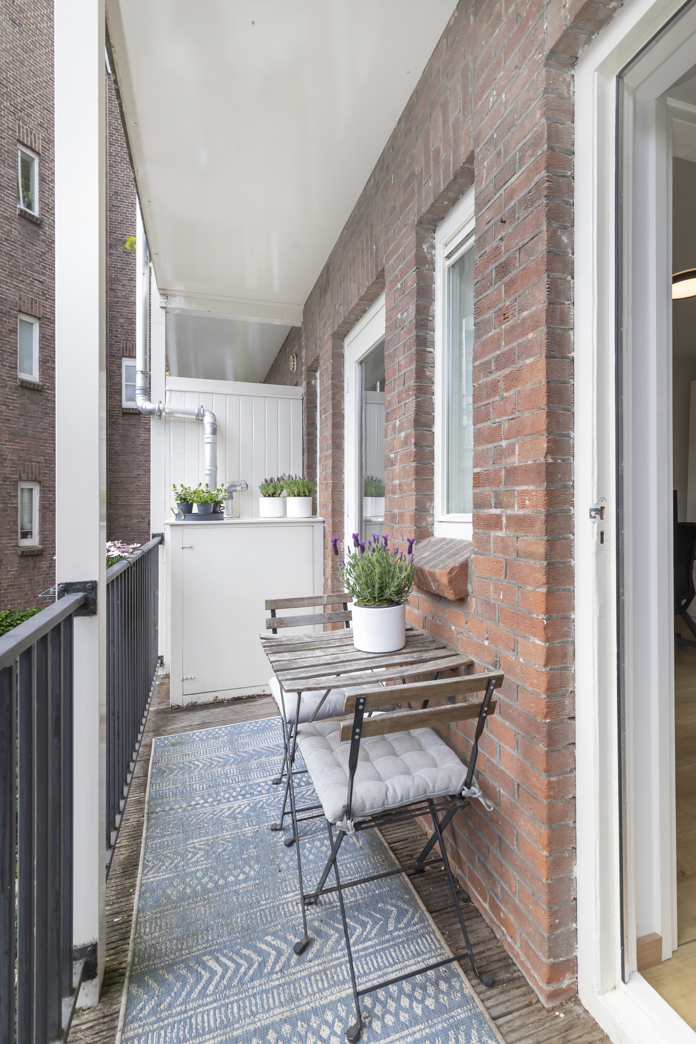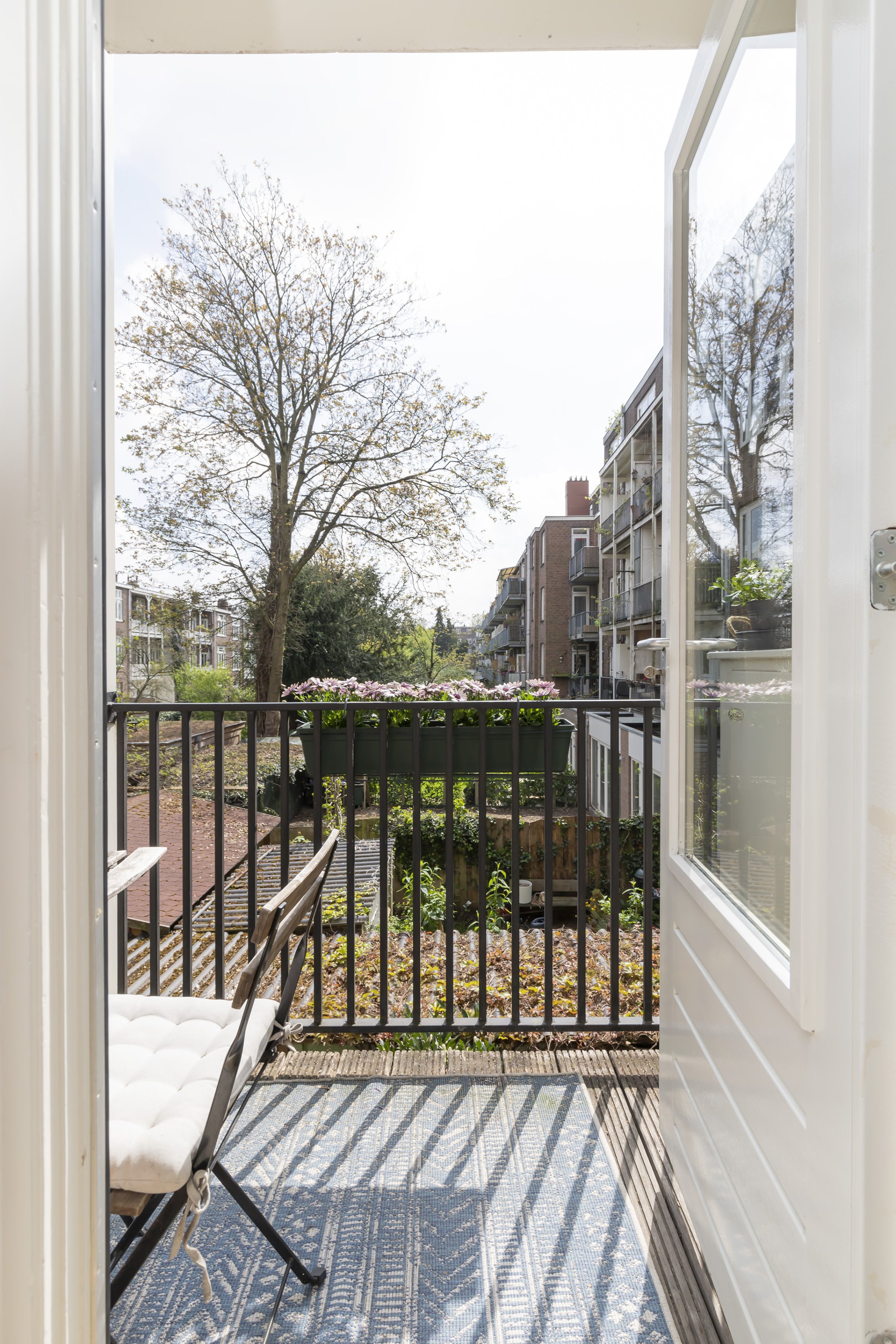 Aan de voorzijde (4 ramen breed) zijn 2 slaapkamers; De woonkamer met toegang tot de semi open keuken is aan de achterzijde met vrij uitzicht over de binnentuinen. De keuken is voorzien van koel-vries-combinatie, oven, kookplaat en vaatwasser en heeft toegang tot het balkon op het zuiden; De laatste slaapkamer is aan de achterzijde en heeft ook toegang tot het balkon.