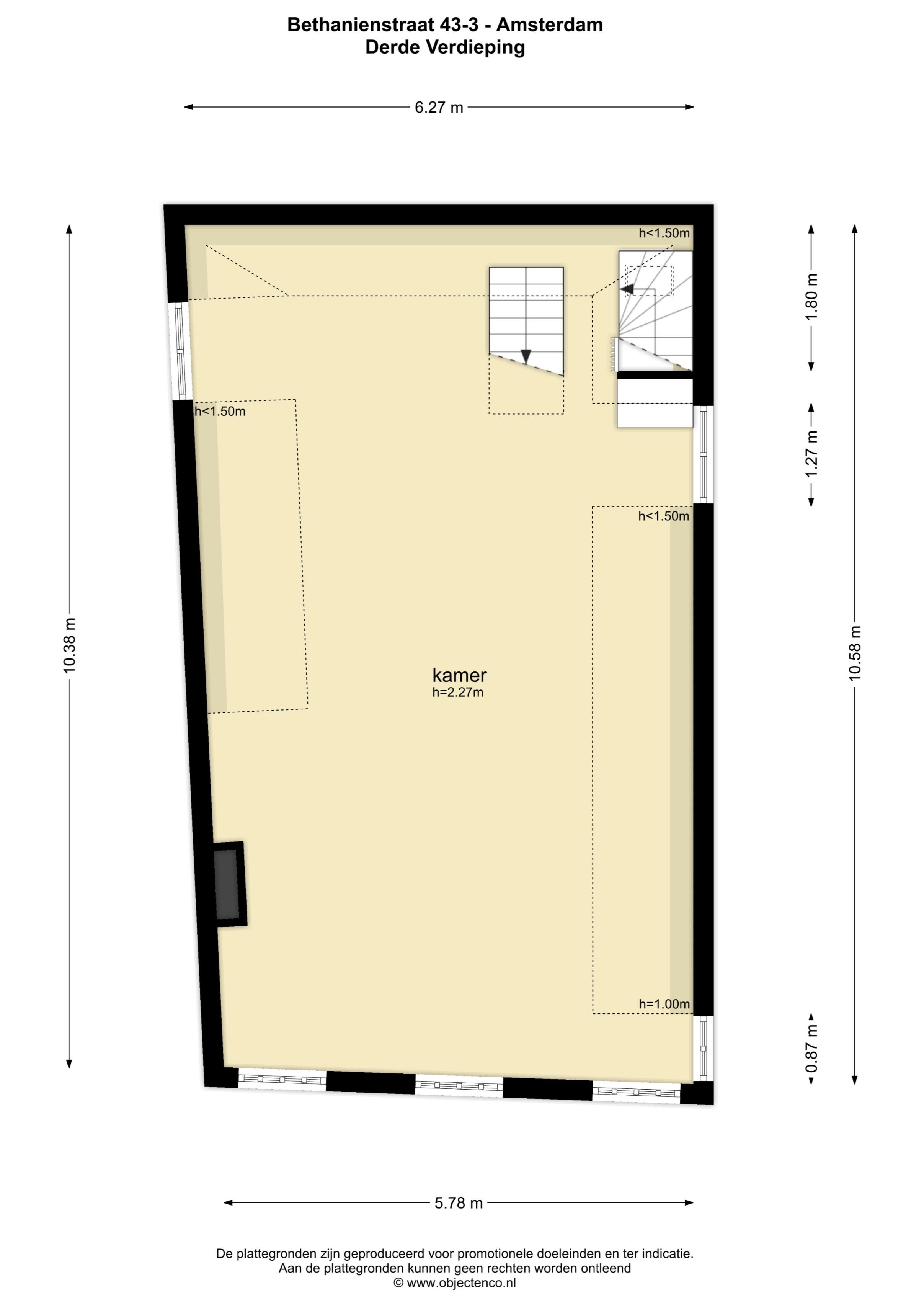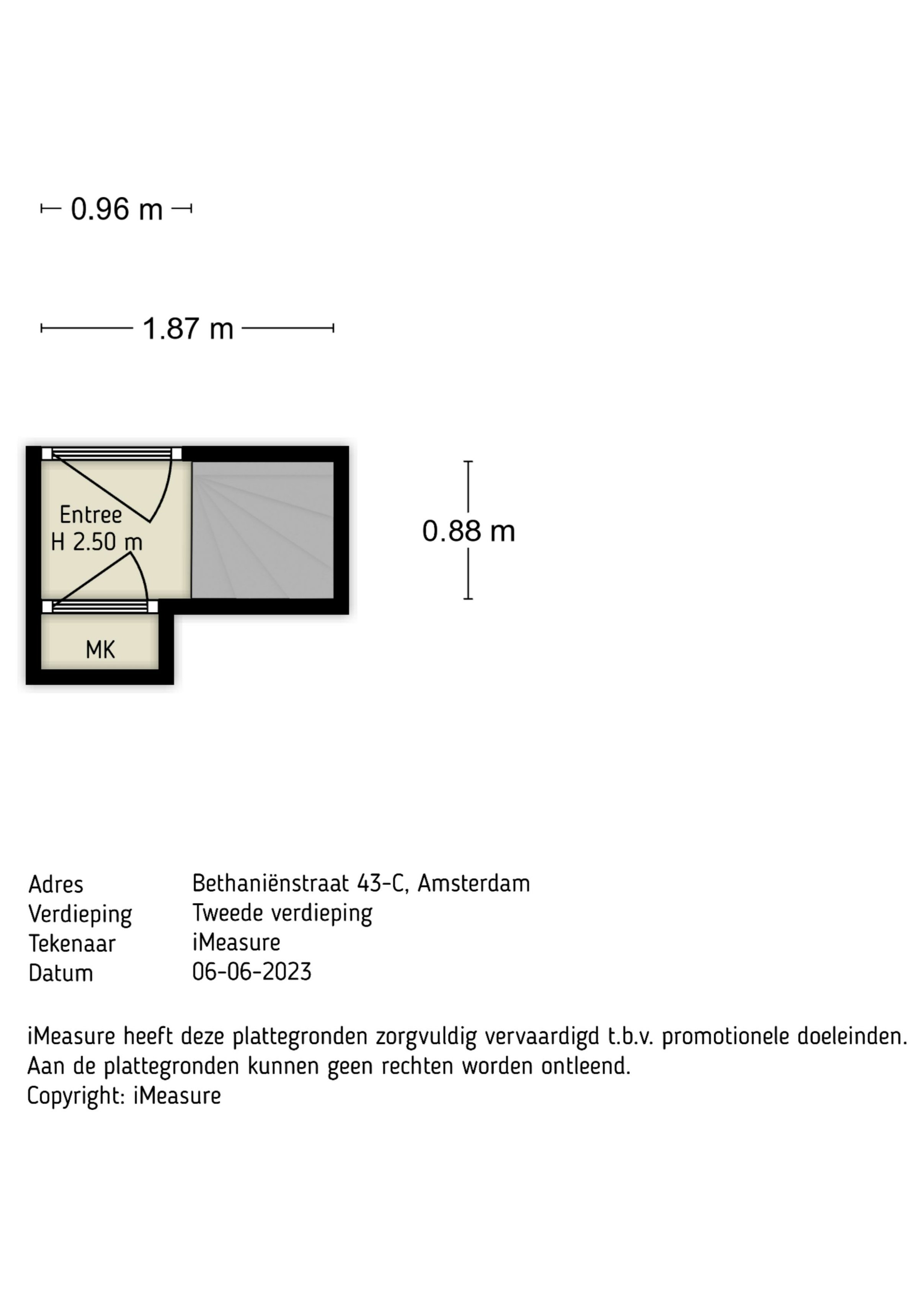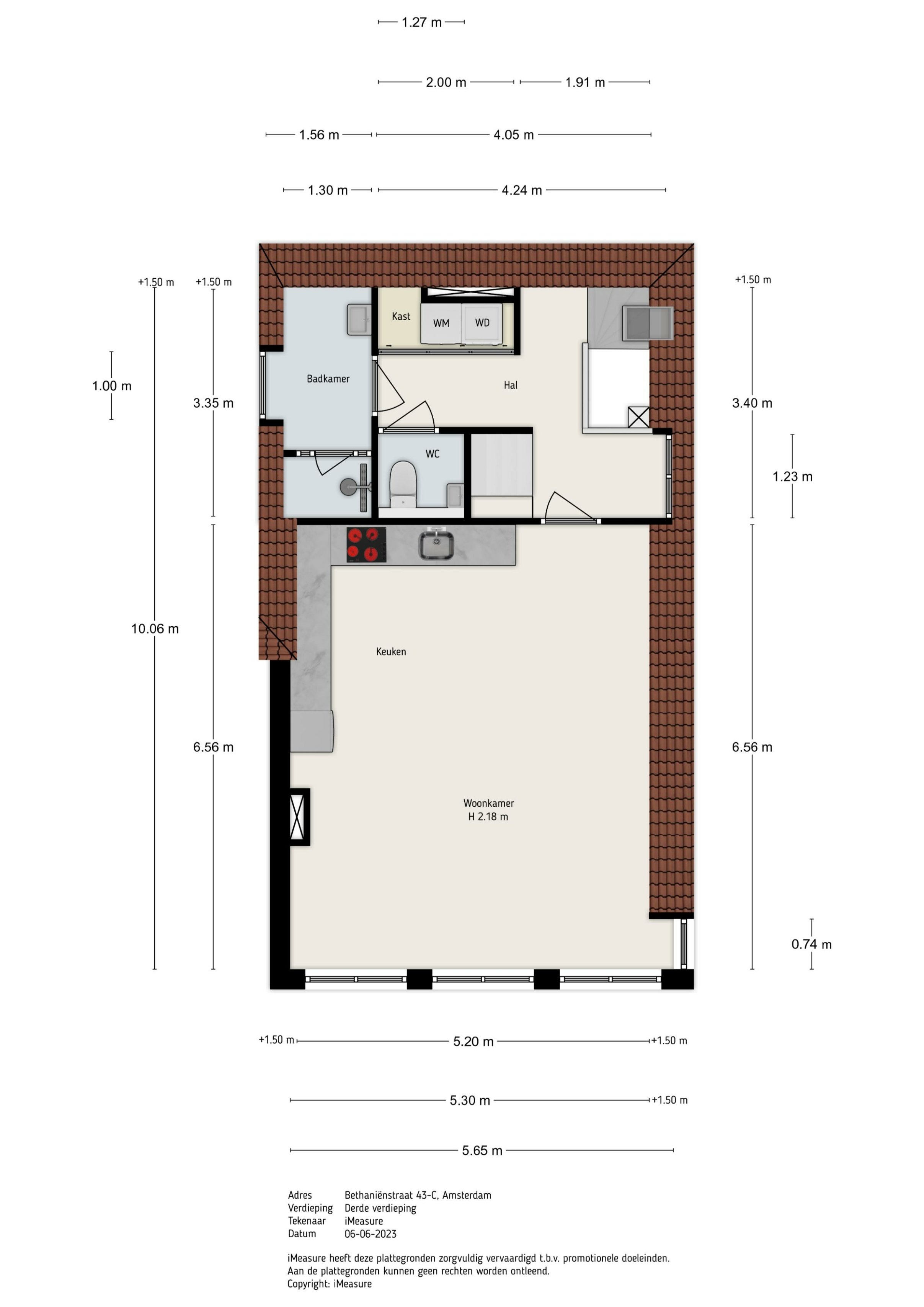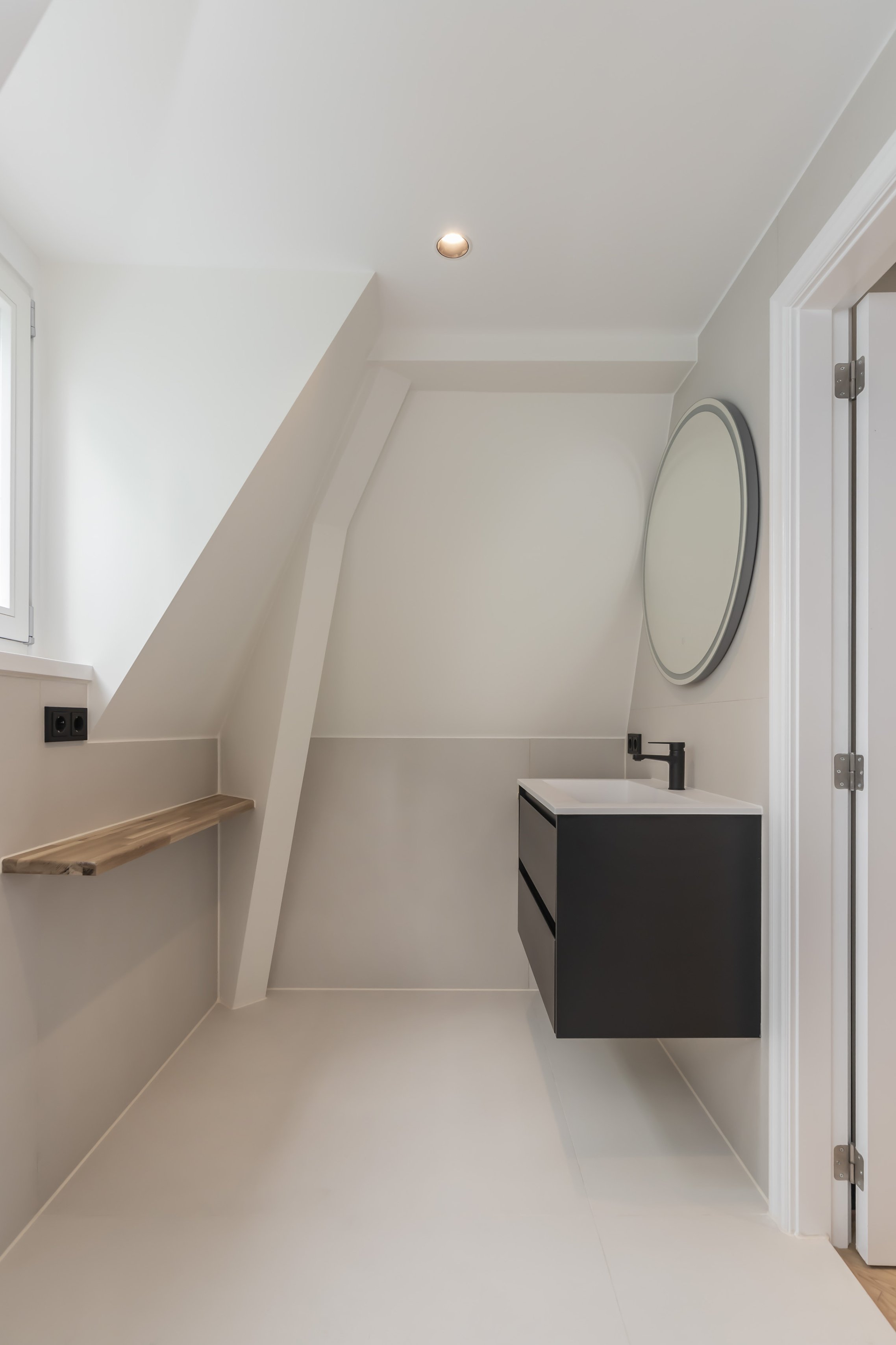 Het entree is op de tweede verdieping vanwaar een trap is naar hal met wc en fonteintje. De zitkamer met een mooi Amsterdams uitzicht op monumentale gebouwen en de gracht is 3 ramen breed en heeft veel lichtinval door o.a. ook ramen aan de zijgevels. Er is een open keuken, voorzien van luxe inbouwapparatuur. In de gang naar de badkamer en wc is een grote kast met schuifdeuren die voorzien is van de wasmachine aansluiting. De fraaie sfeervolle badkamer met wastafelmeubel, inloopdouche en design radiator is aan de achterzijde op de 3e verdieping.