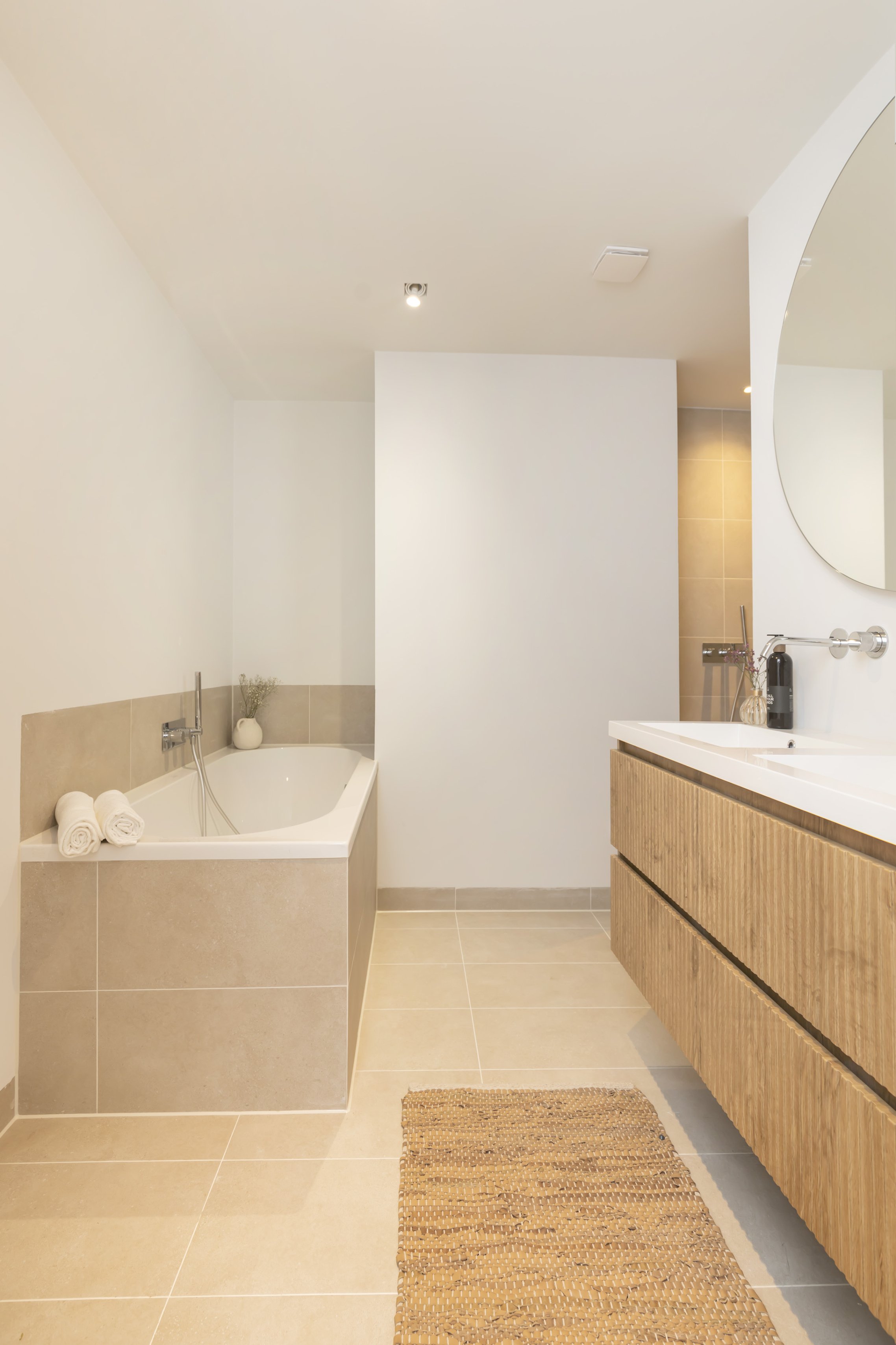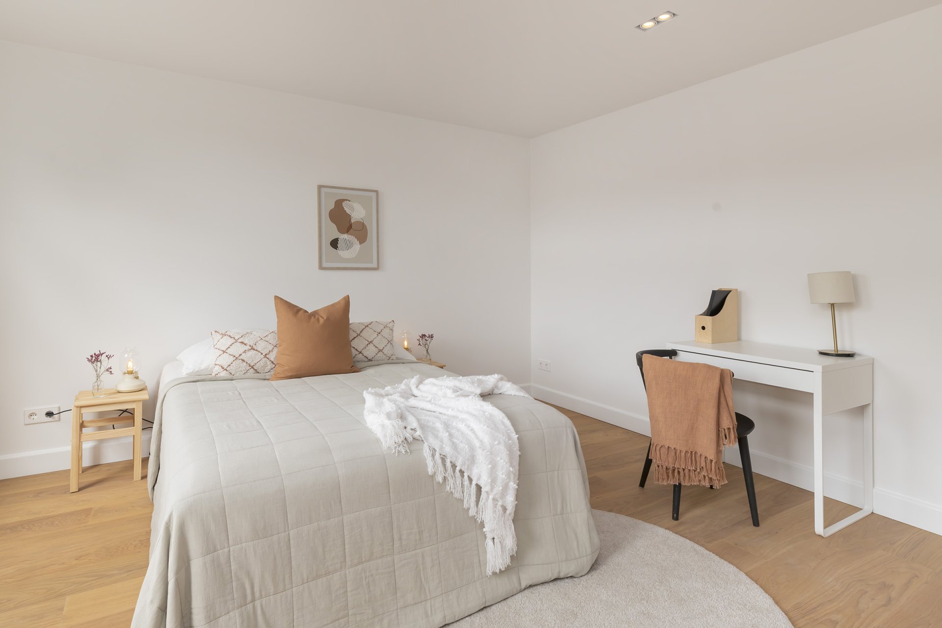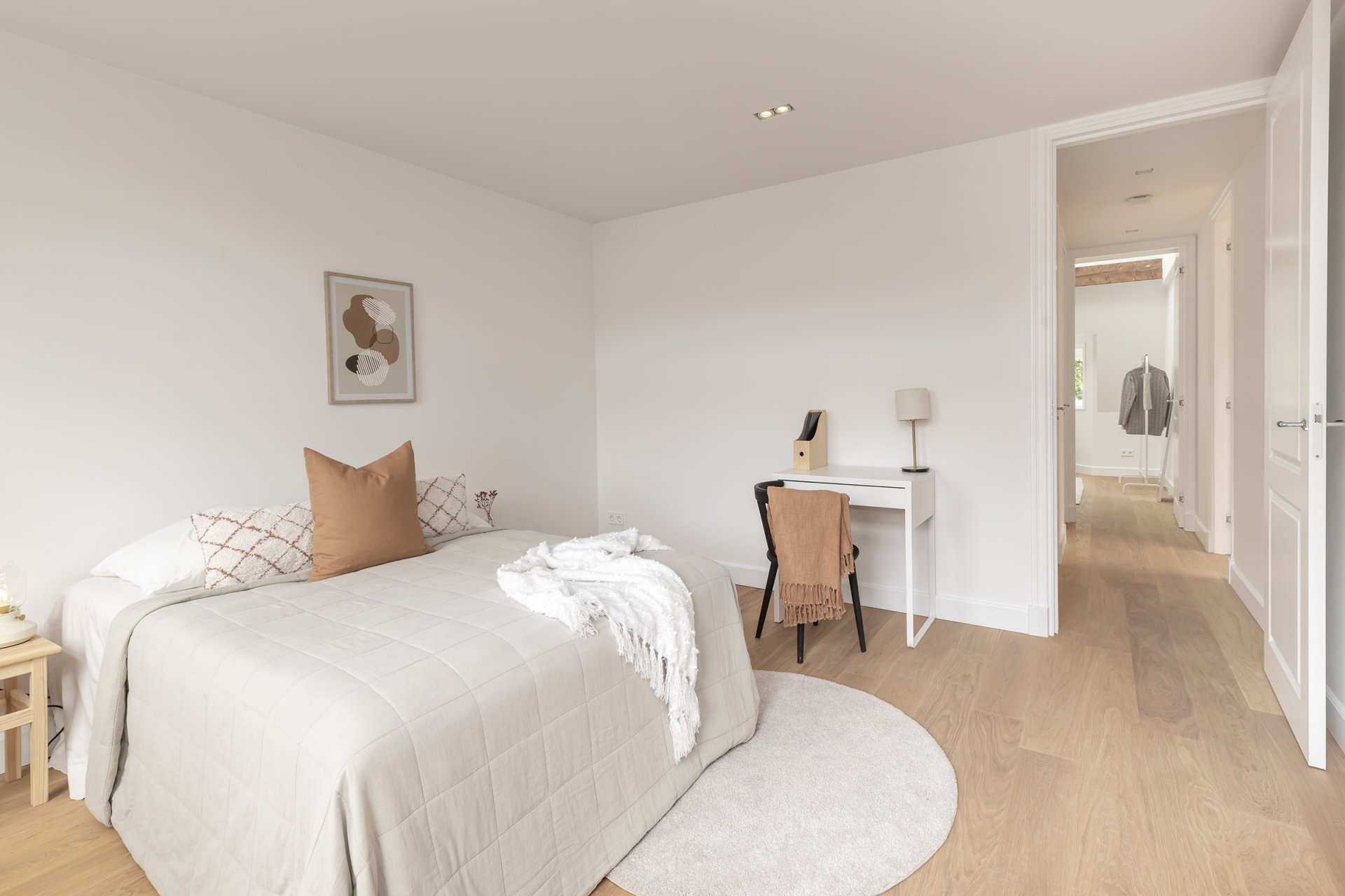 De ruime slaapkamer is een oase van rust en biedt alle ruimte voor een groot bed en garderobekast. Ook hier zorgen de dakramen voor veel lichtinval en een gevoel van lucht en ruimte. De moderne badkamer is voorzien van een ligbad, inloopdouche, dubbel wastafelmeubel en een stijlvol tegelwerk in neutrale tinten. Separaat vind je een toilet.
