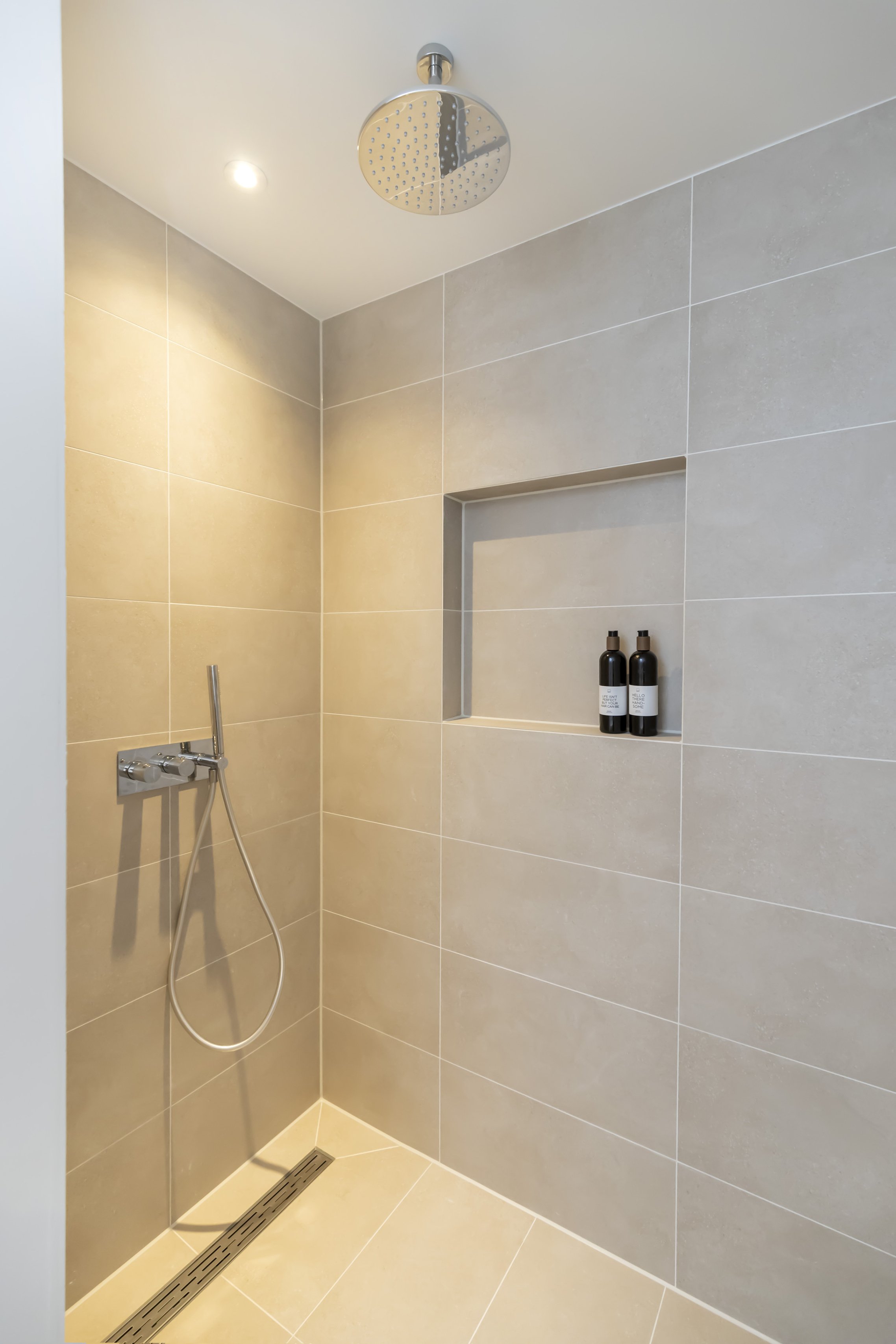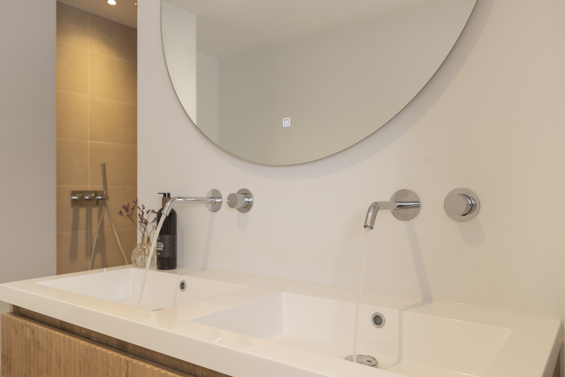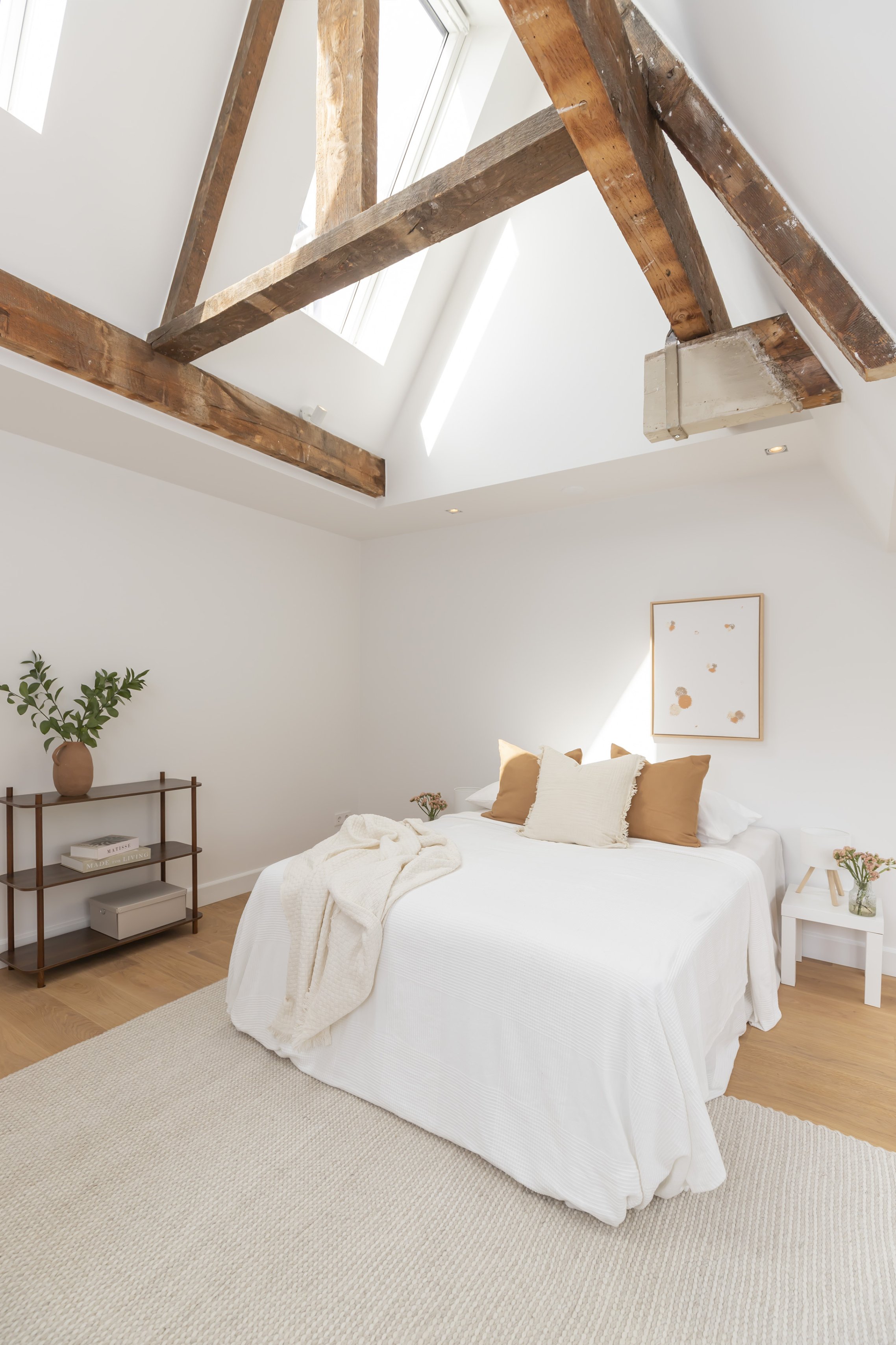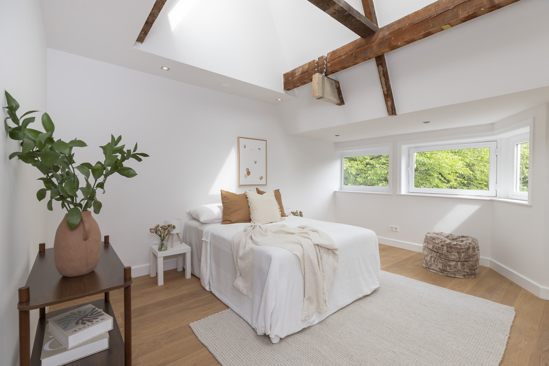 De ruime slaapkamer is een oase van rust en biedt alle ruimte voor een groot bed en garderobekast. Ook hier zorgen de dakramen voor veel lichtinval en een gevoel van lucht en ruimte. De moderne badkamer is voorzien van een ligbad, inloopdouche, dubbel wastafelmeubel en een stijlvol tegelwerk in neutrale tinten. Separaat vind je een toilet.