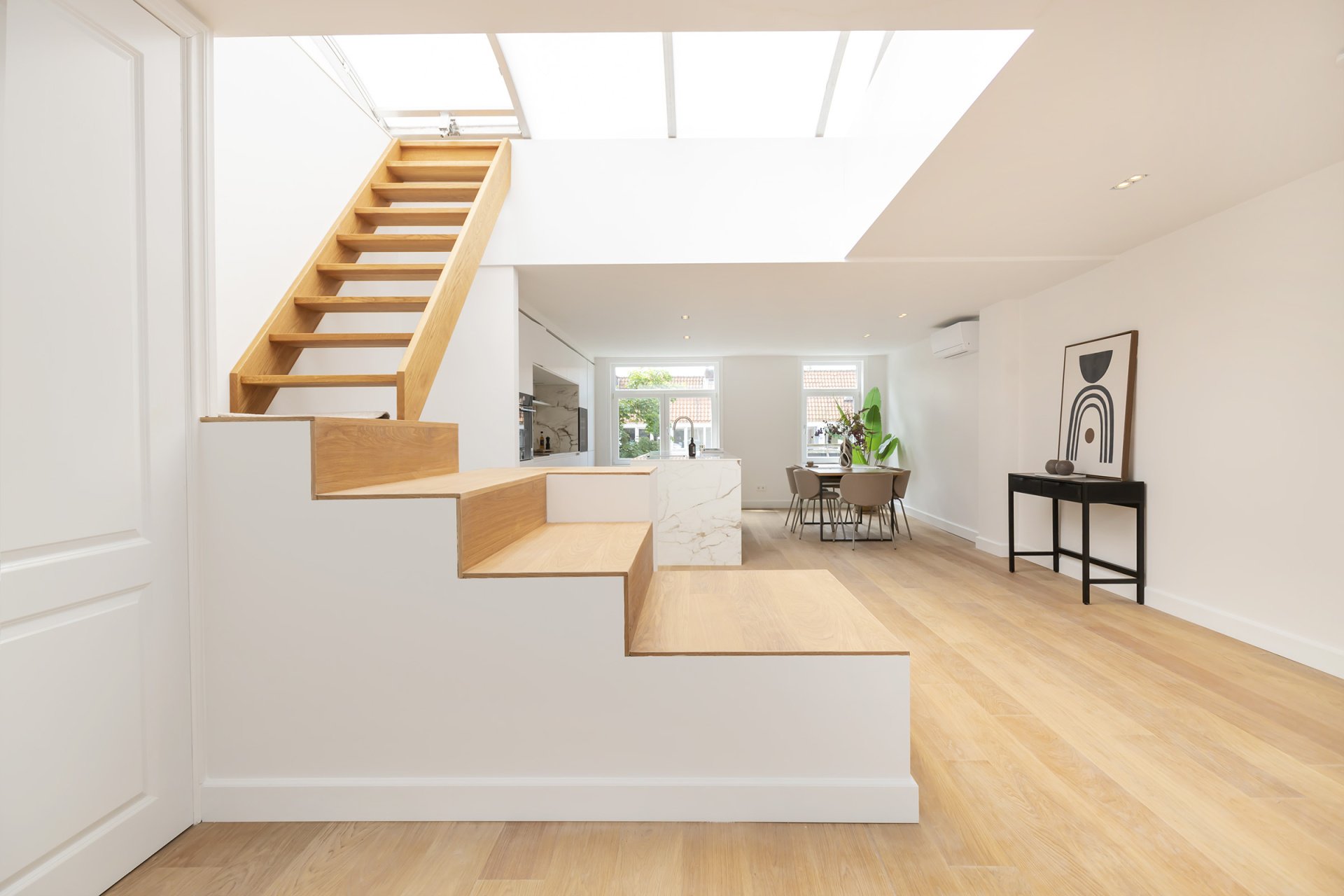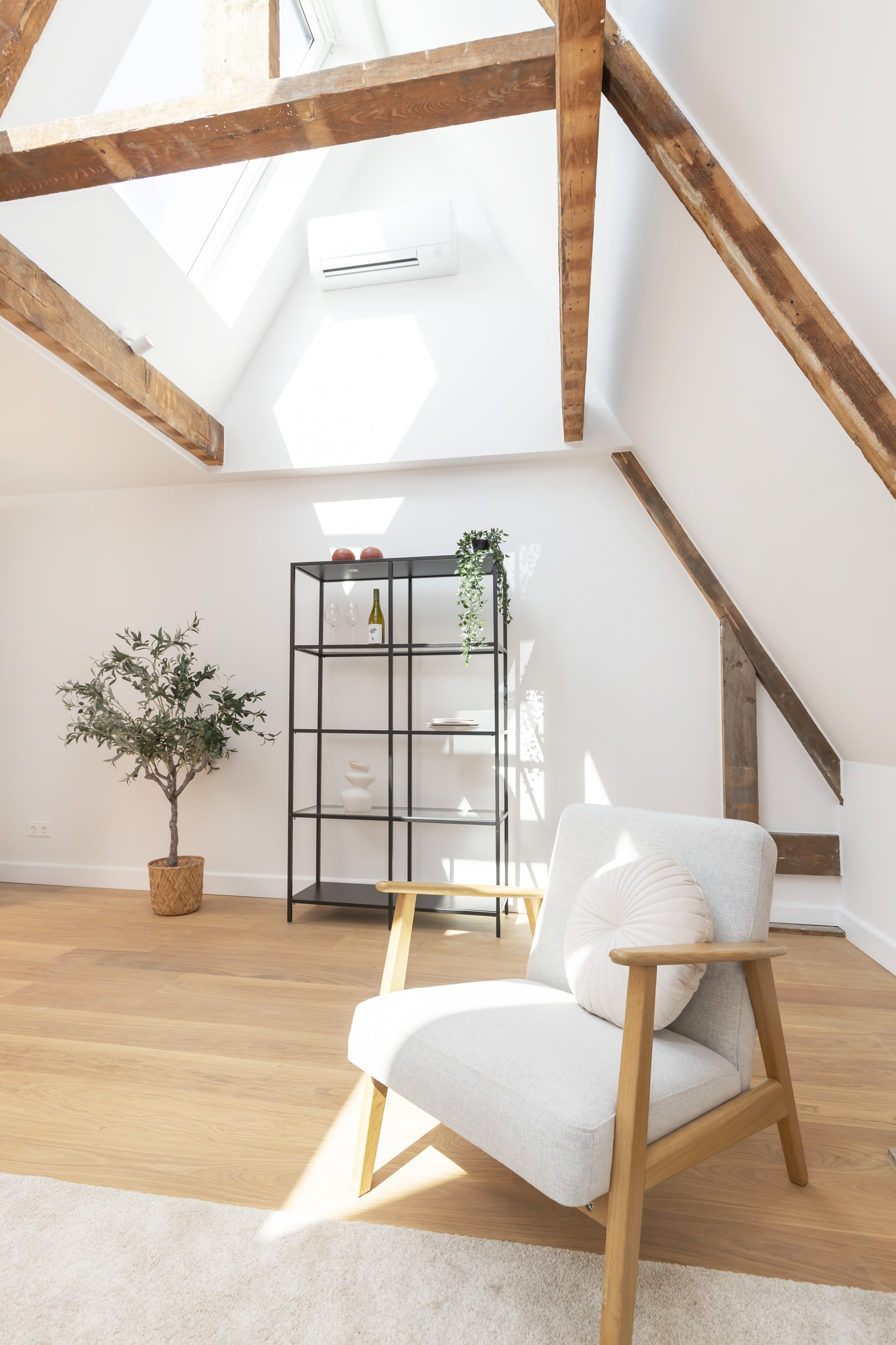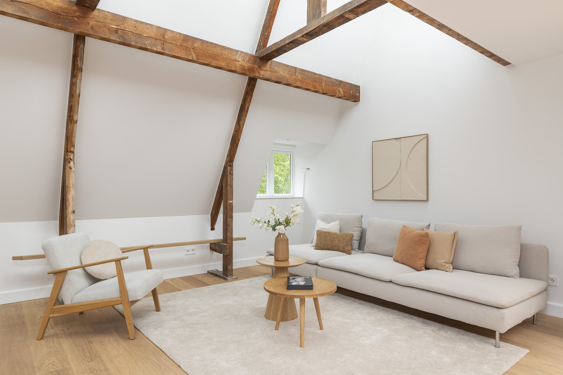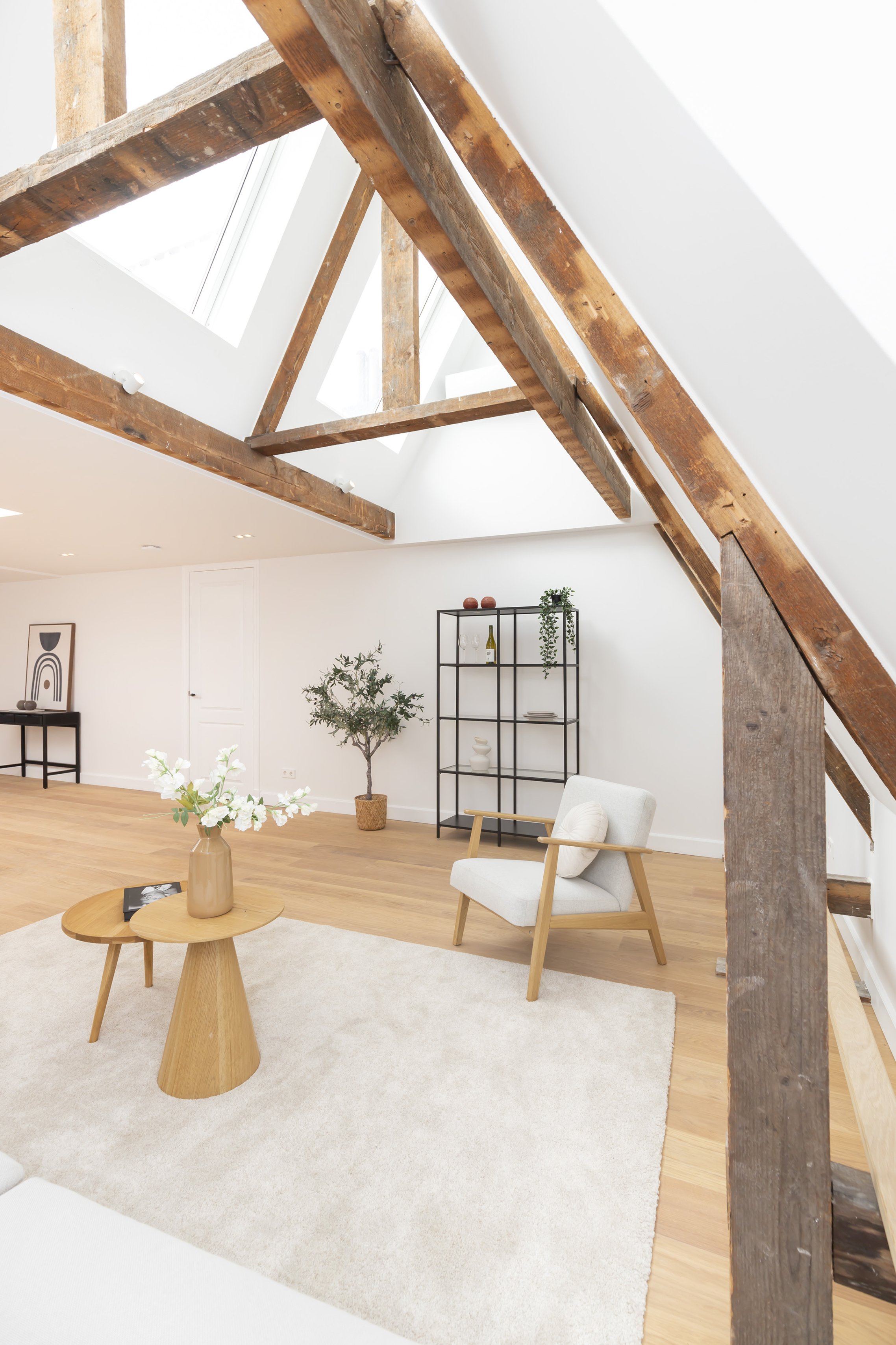 Via het nette trappenhuis bereik je de woning op de vierde verdieping. Wat direct opvalt is de ruimtelijkheid, de lichtinval door de diverse dakramen en de strakke afwerking in combinatie met de authentieke balkenconstructie.