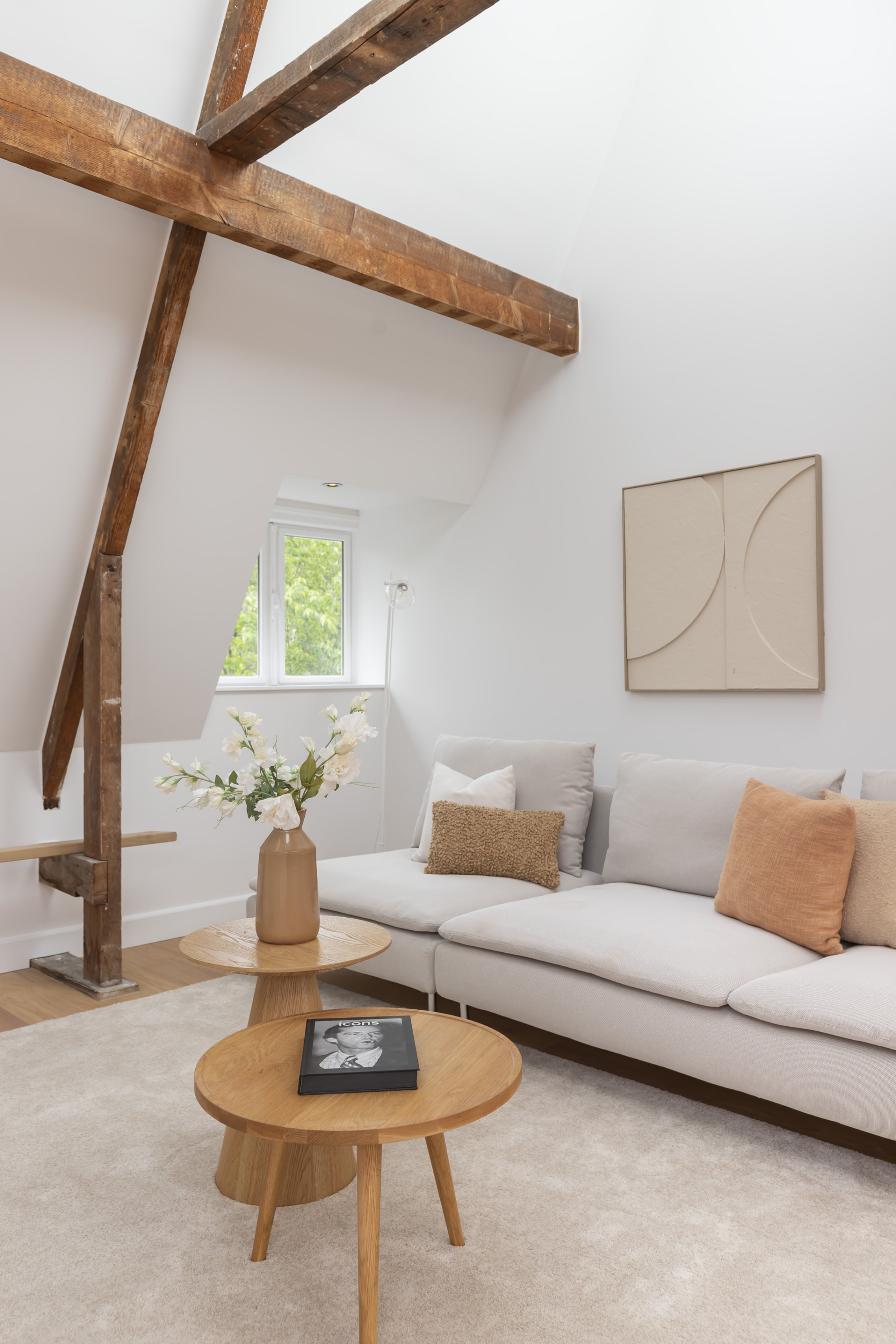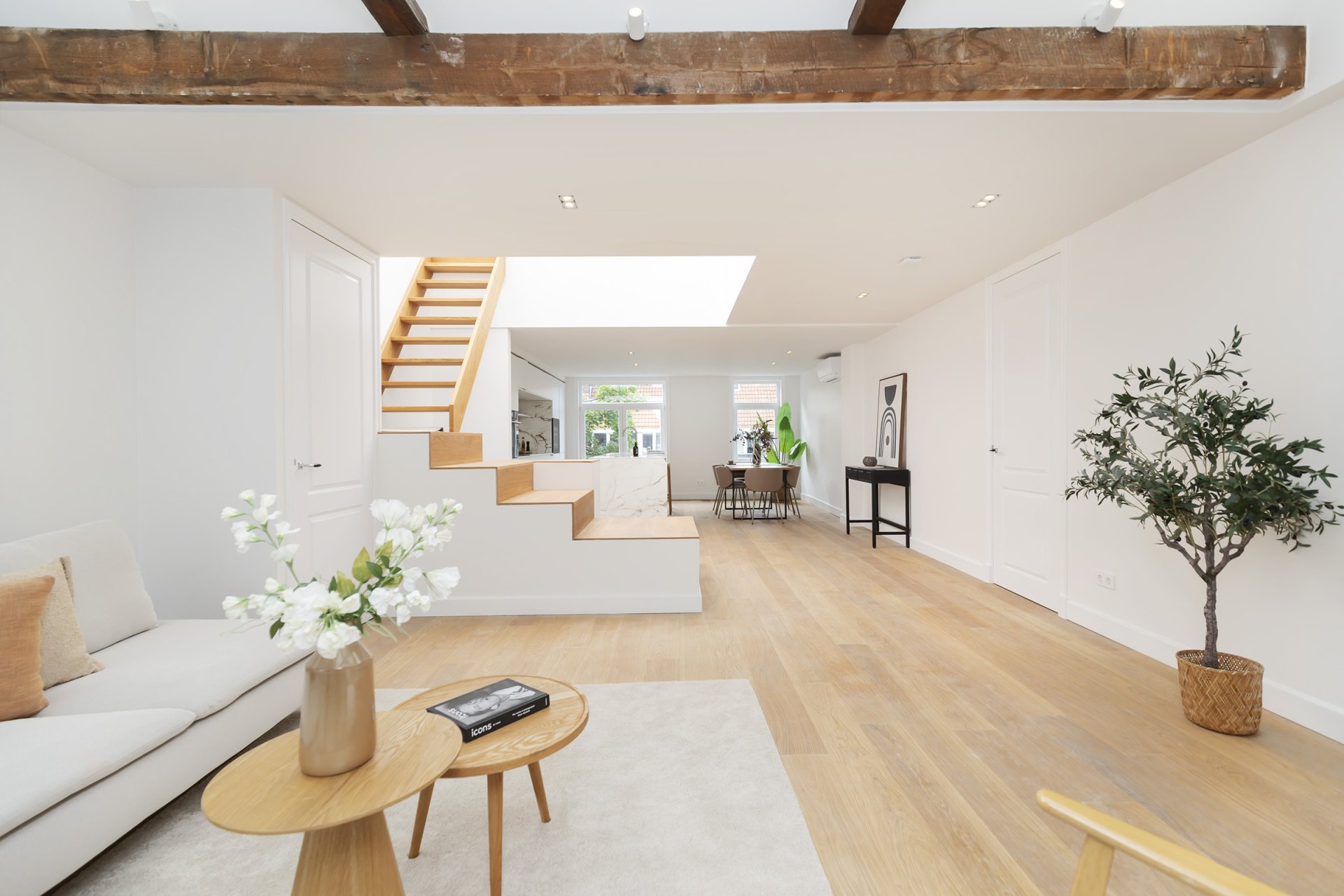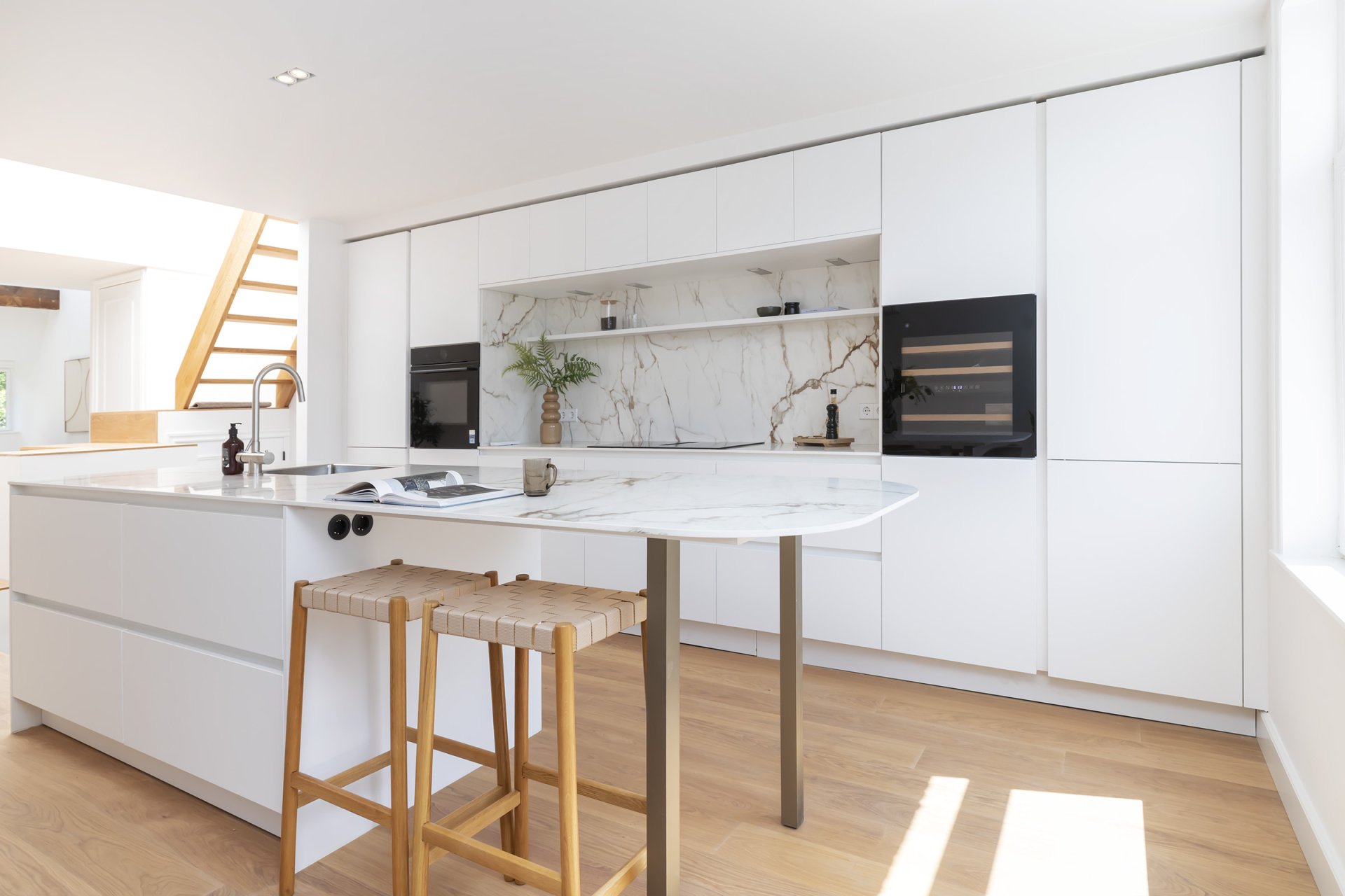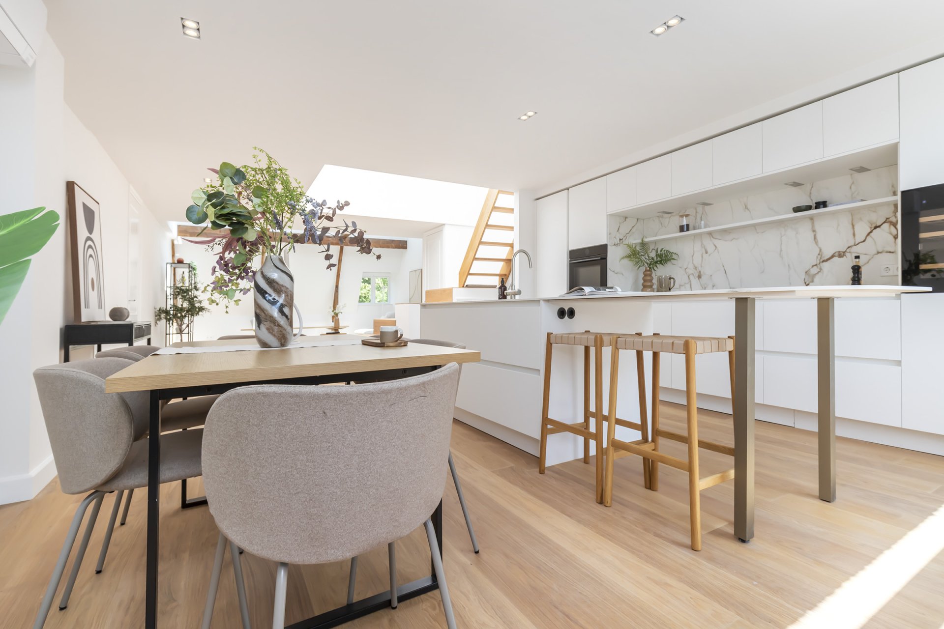 De moderne open keuken is volledig uitgerust met inbouwapparatuur, waaronder een inductiekookplaat, combi-oven, vaatwasser, koelkast en wijnklimaatkast. Het kookeiland met bar biedt een fijne plek voor een snel ontbijt of een goed glas wijn tijdens het koken. Aansluitend vind je de eethoek en de sfeervolle woonkamer, waar het licht van meerdere kanten binnenvalt en de zichtbare spanten zorgen voor een unieke sfeer.