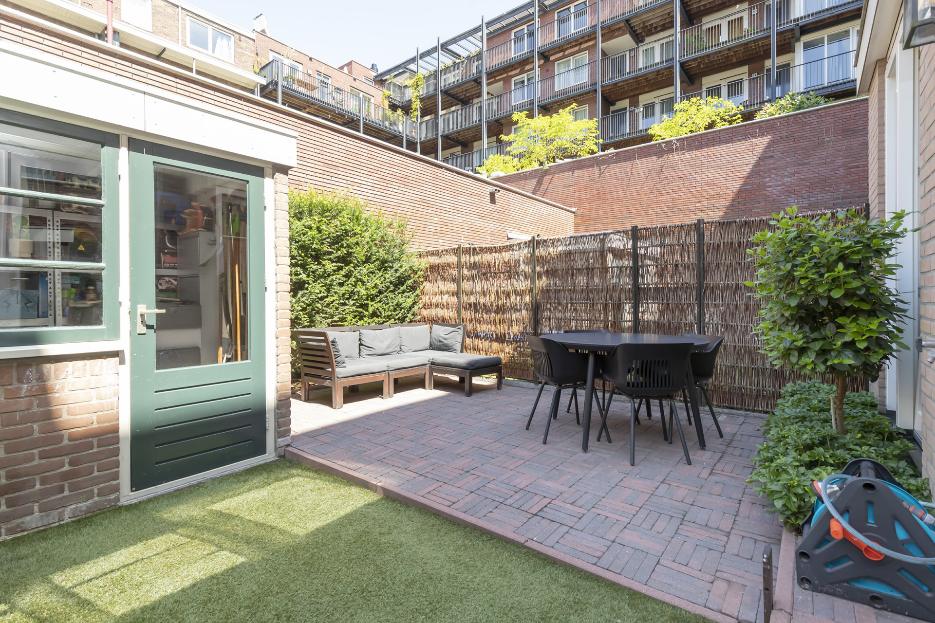 De tuin van ca. 32 m² ligt op het noordwesten en is verzorgd aangelegd. Dankzij de ligging geniet je in de middag en avond van de zon – perfect voor een borrel of diner buiten. De vrijstaande stenen berging biedt plek voor fietsen en extra opslag.