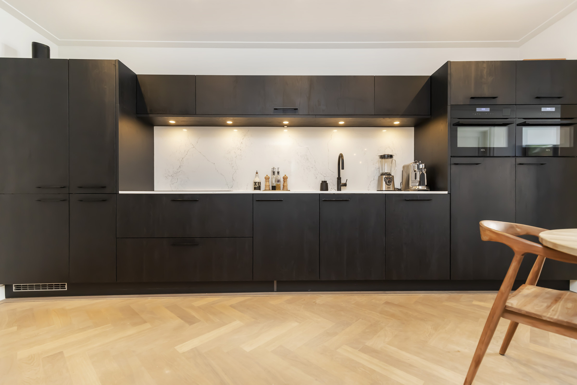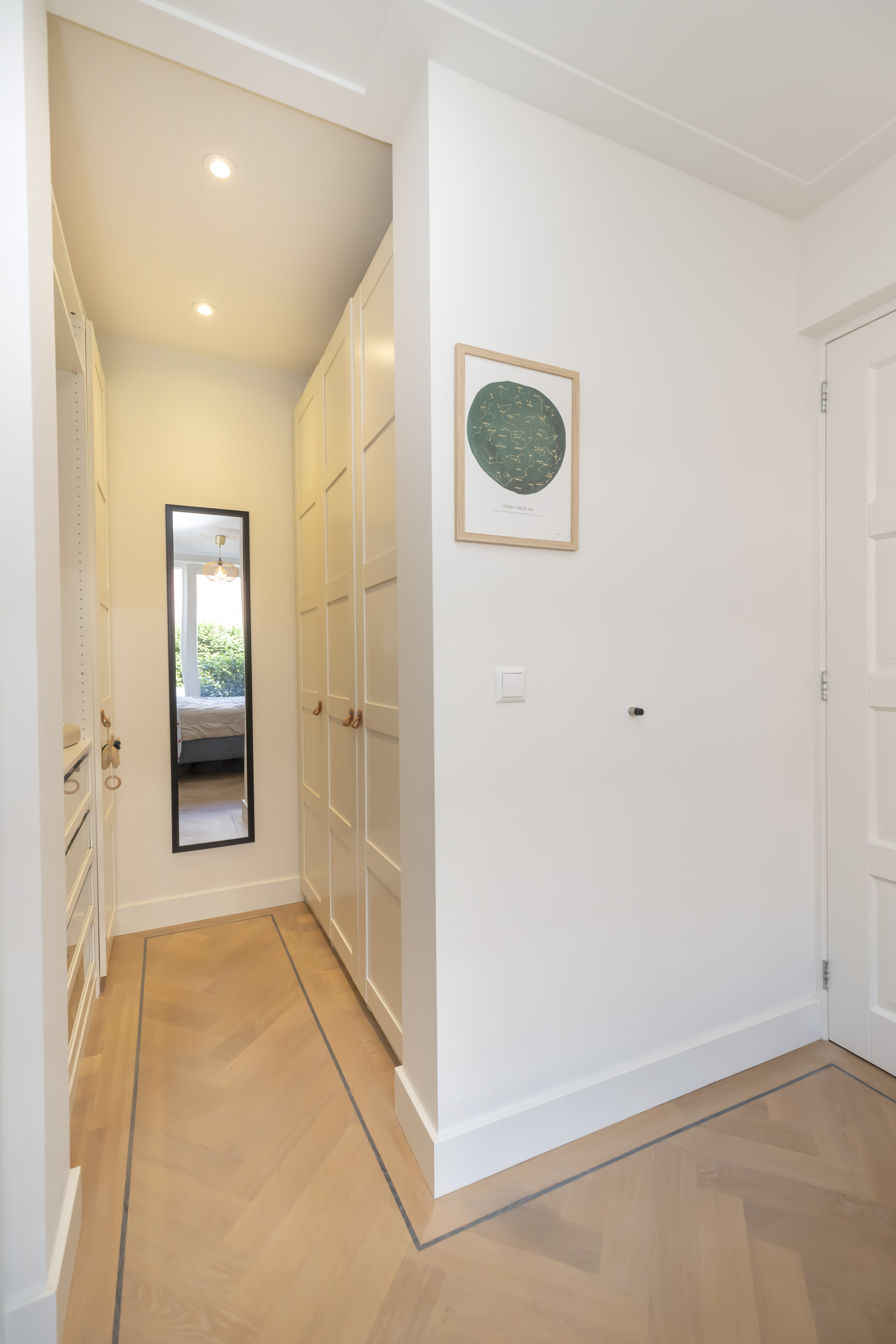 De lichte woonkamer is voorzien van een stijlvolle visgraat parketvloer, een daklicht met driedubbel glas en openslaande deuren naar de tuin. De moderne keuken is een echte eyecatcher en uitgerust met hoogwaardige inbouwapparatuur: een 4-pits inductiekookplaat, Quooker, twee ovens (een stoomoven en een combimagnetron), een grote koelkast en een separate vriezer.
