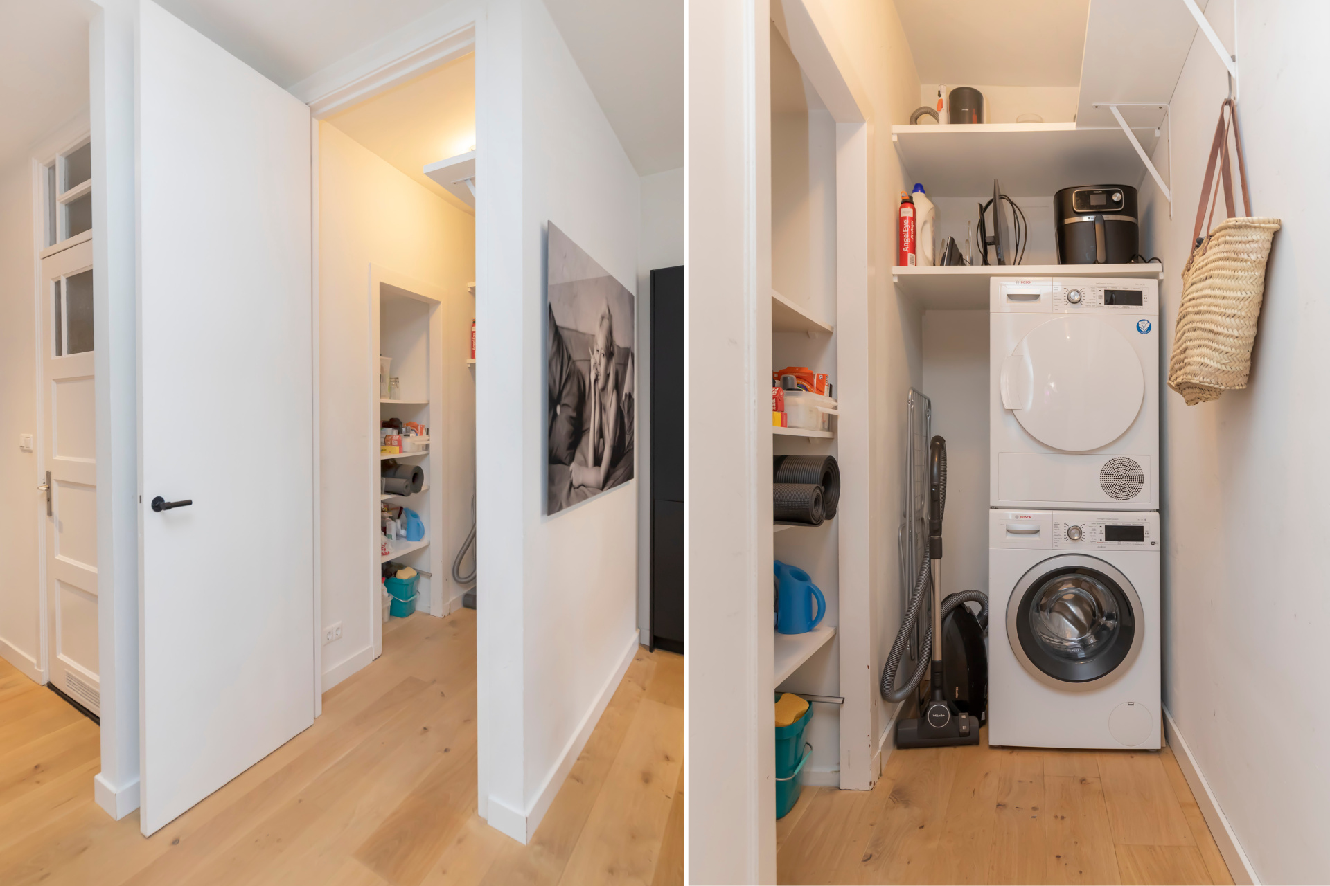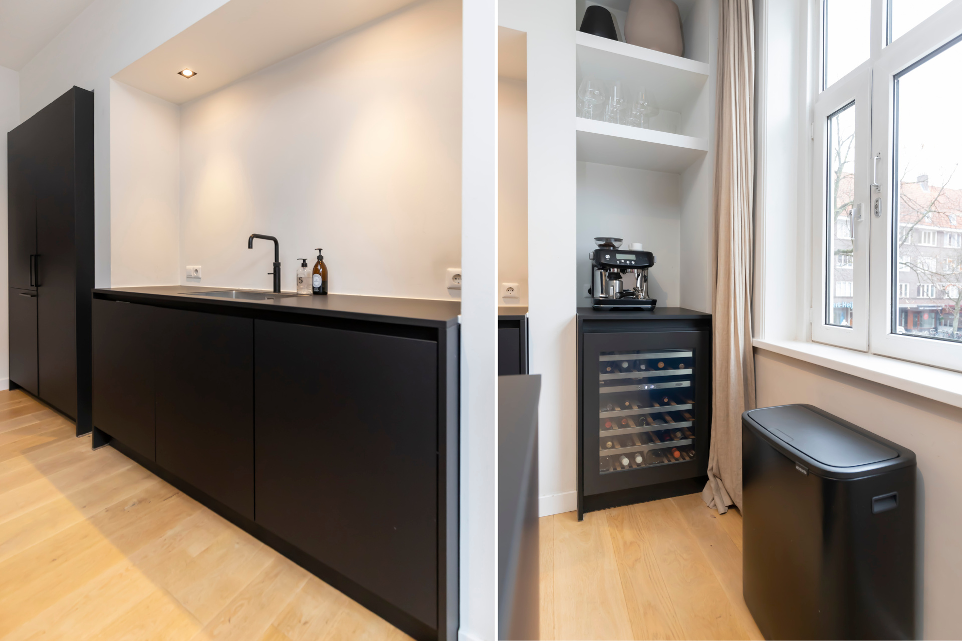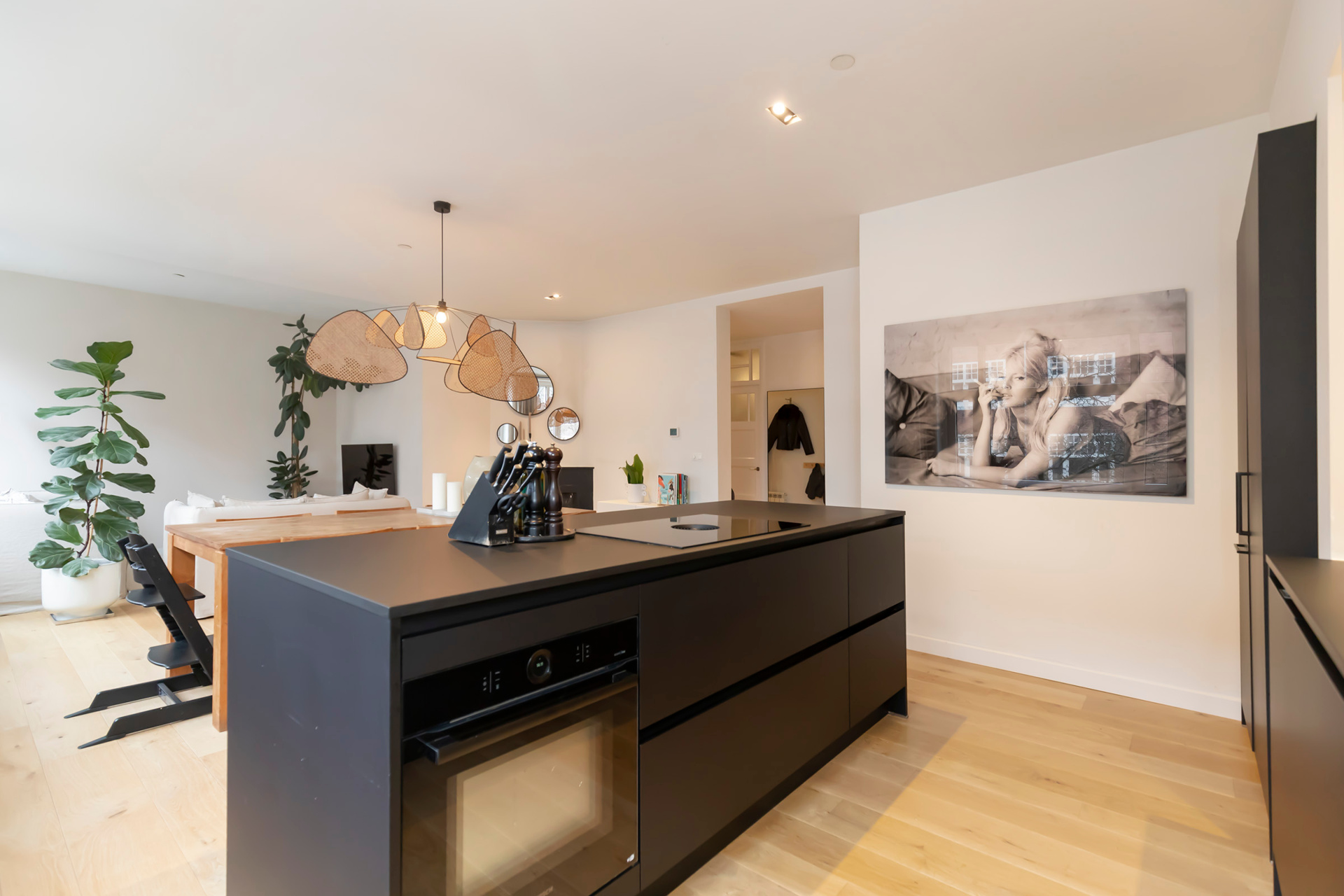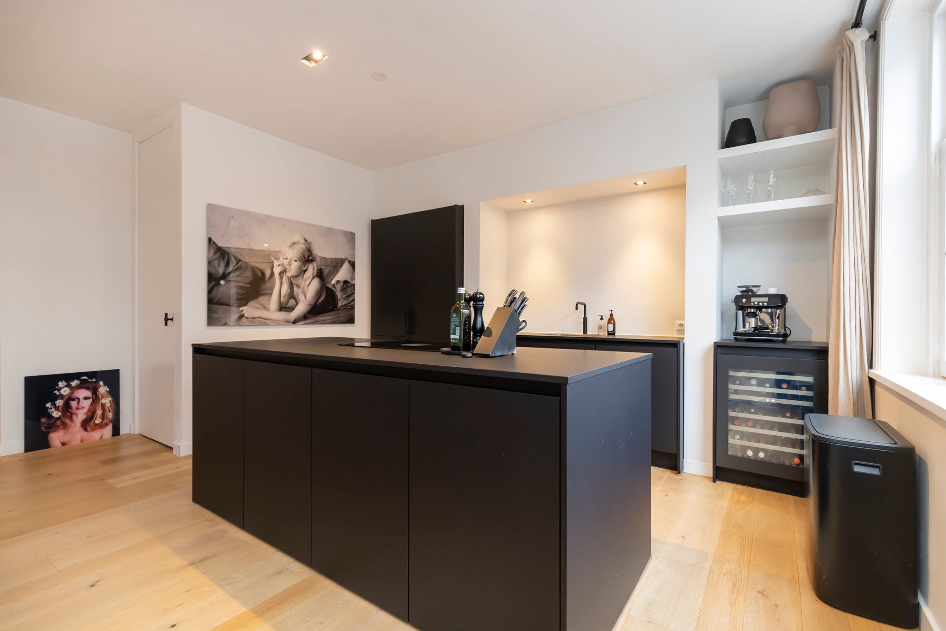 De keuken is uitgevoerd met een op maat gemaakt kookeiland, kastenwand en wijnklimaatkast. De keuken is voorzien van BOSCH-inbouwapparatuur, BORA kookplaat en een Quooker Combi+, en grenst aan een ruim opgezette bijkeuken met aansluiting voor de wasmachine.