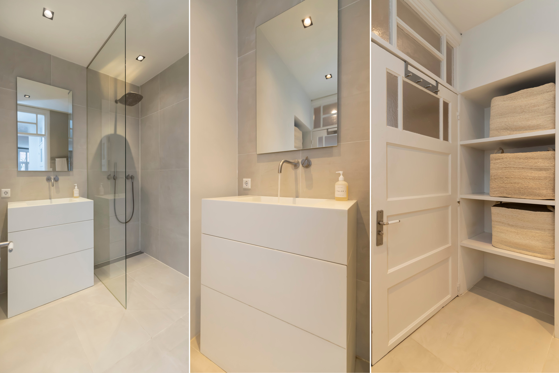 De moderne badkamer en het separate toilet zijn ontworpen door Piet Boon en uitgevoerd met hoogwaardige materialen en designkranen uit de By Cocoon-collectie. De badkamer beschikt over een op maat gemaakt wastafelmeubel, een ruime inloopdouche en een inbouwkast.