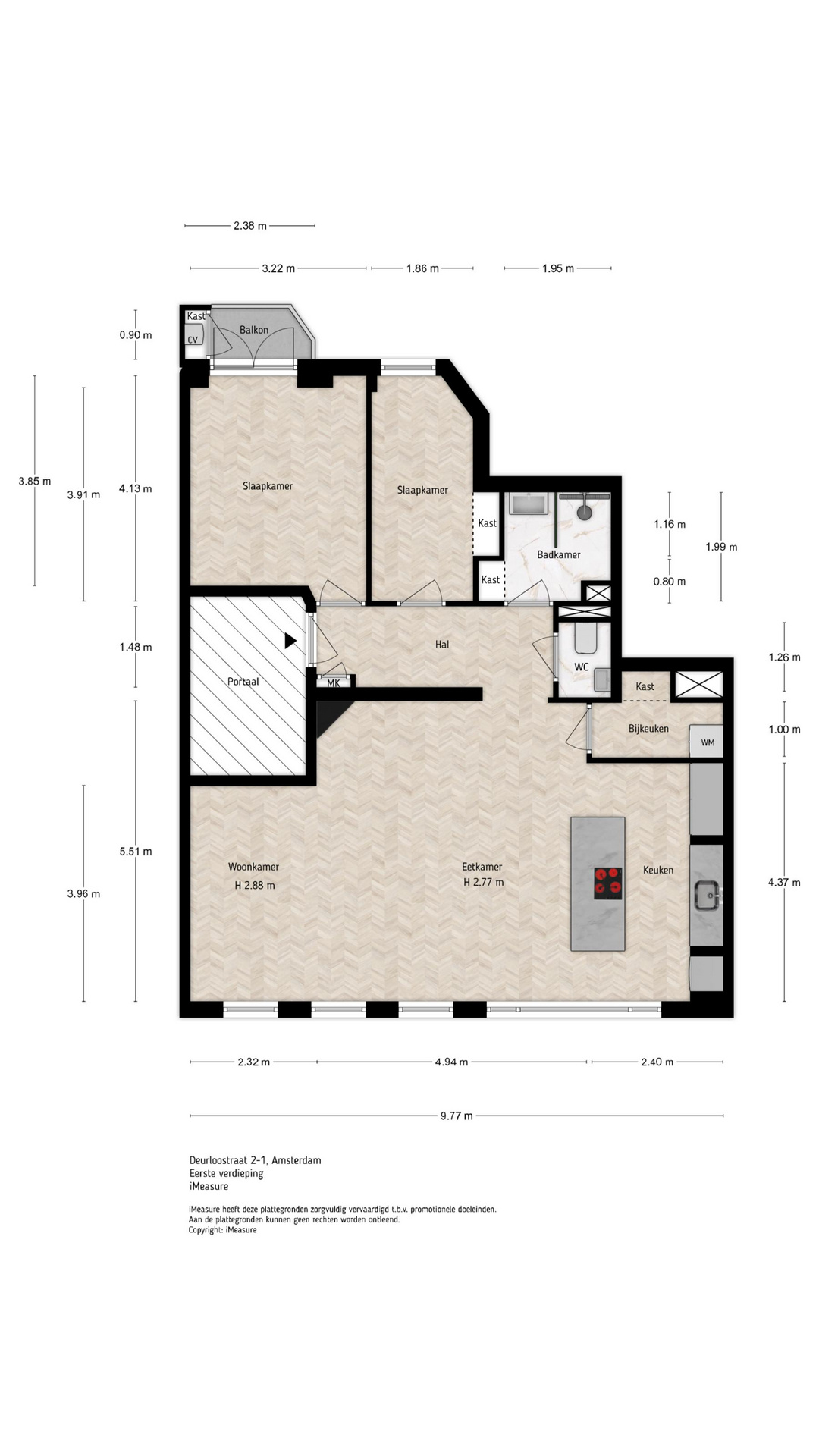 Via de voordeur op de eerste verdieping betreed je de ruime hal met garderobe en meterkast. Aan de voorzijde bevindt zich de royale zitkamer met open keuken, met een breedte van bijna 10 meter. Door de vier grote raampartijen is deze ruimte uitzonderlijk licht en heeft vrij uitzicht op de gezellige Maasstraat.