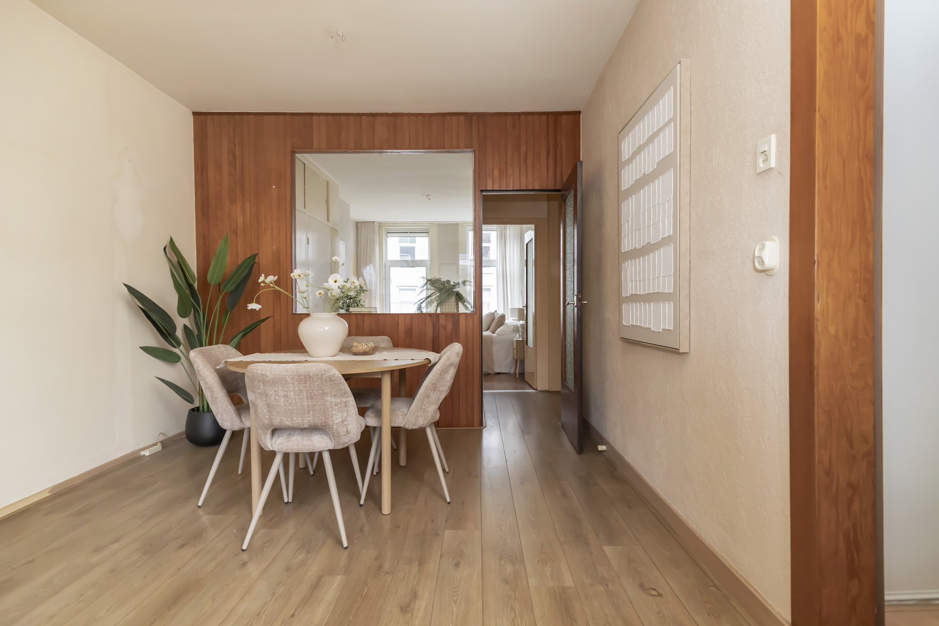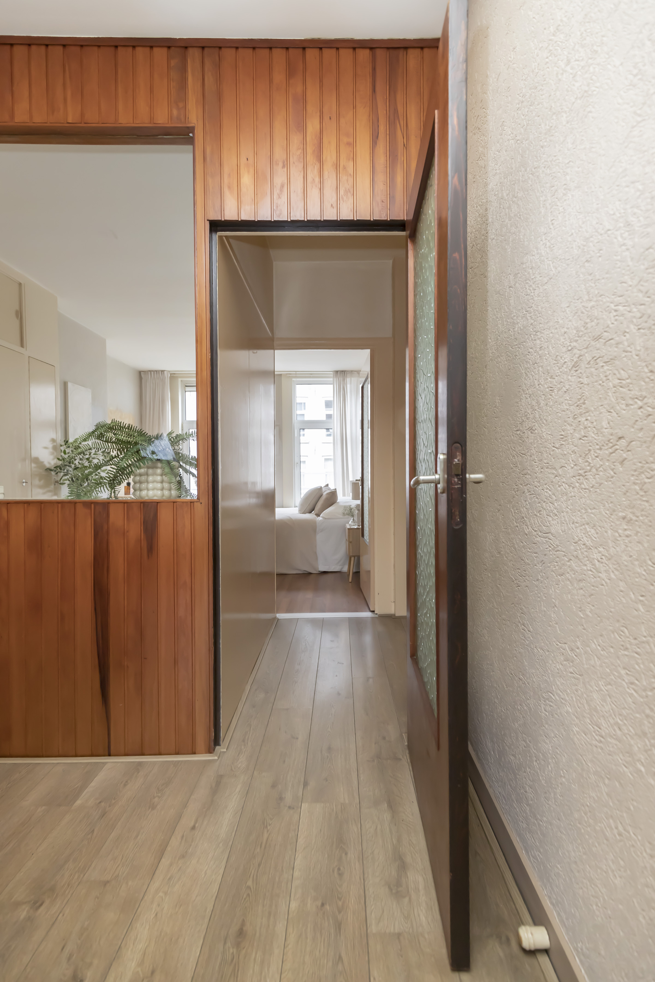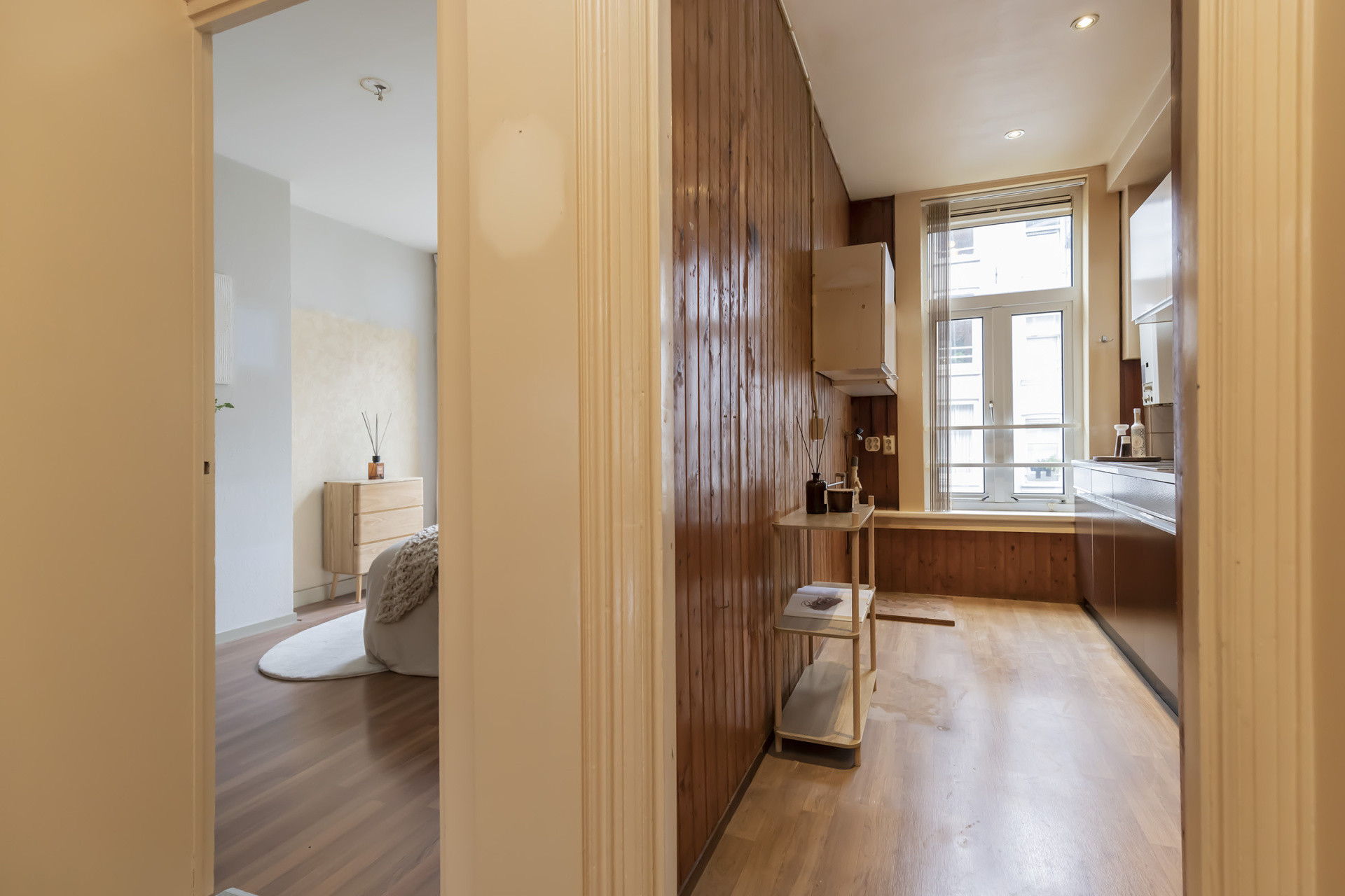 Via de entree op de eerste etage kom je in de hal waar vanuit de badkamer met toilet, de aan de achterzijde gelegen grote slaapkamer, de keuken en de zitkamer met het uitzicht op het Jacob van Lennepkanaal te bereiken zijn. De slaap / werkkamer aan de voorzijde is te bereiken vanuit de zitkamer.