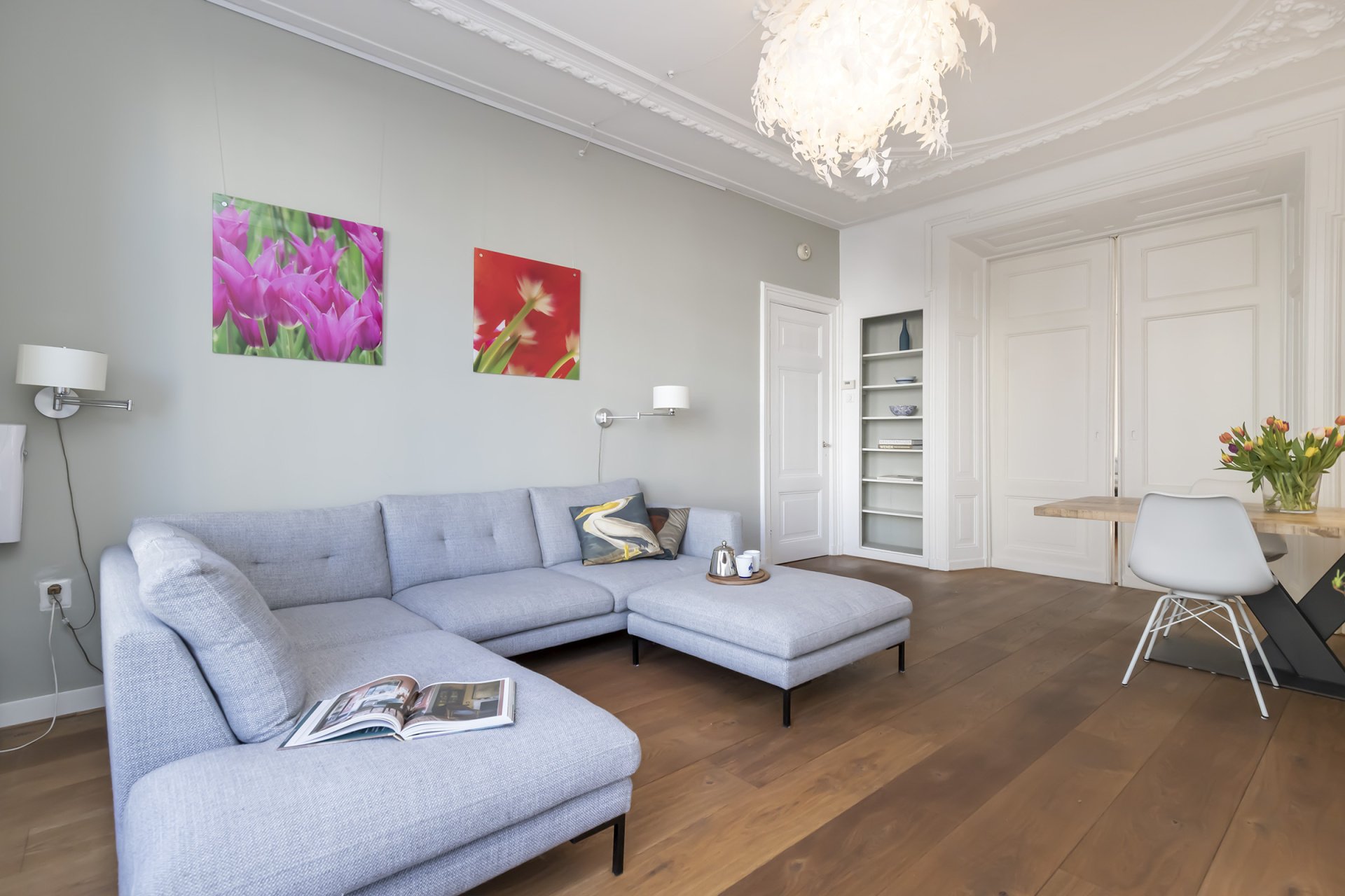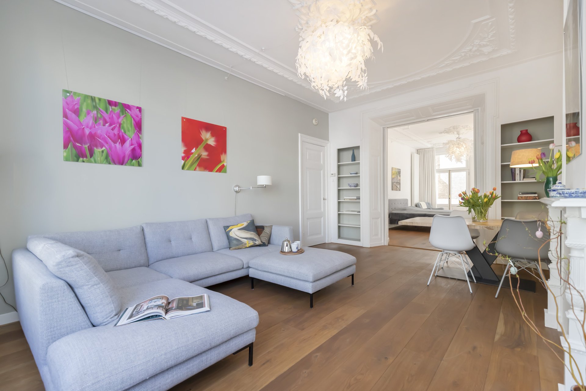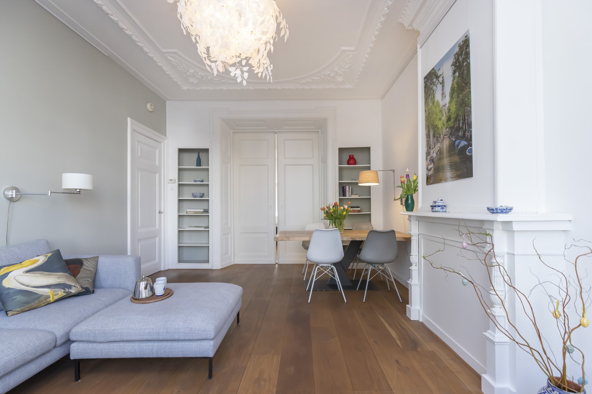 Via de eigen stijlvolle entree met originele voordeur en fraai glas-in-lood kom je in de hal, van waaruit je toegang hebt tot alle vertrekken. Aan de voorzijde ligt de ruime woonkamer met hoge ramen en uitzicht over de gracht. De kamer is licht en voelt bijzonder royaal aan dankzij het plafond van ruim drie meter hoog en de klassieke details, zoals de sierlijsten en en-suite kasten.