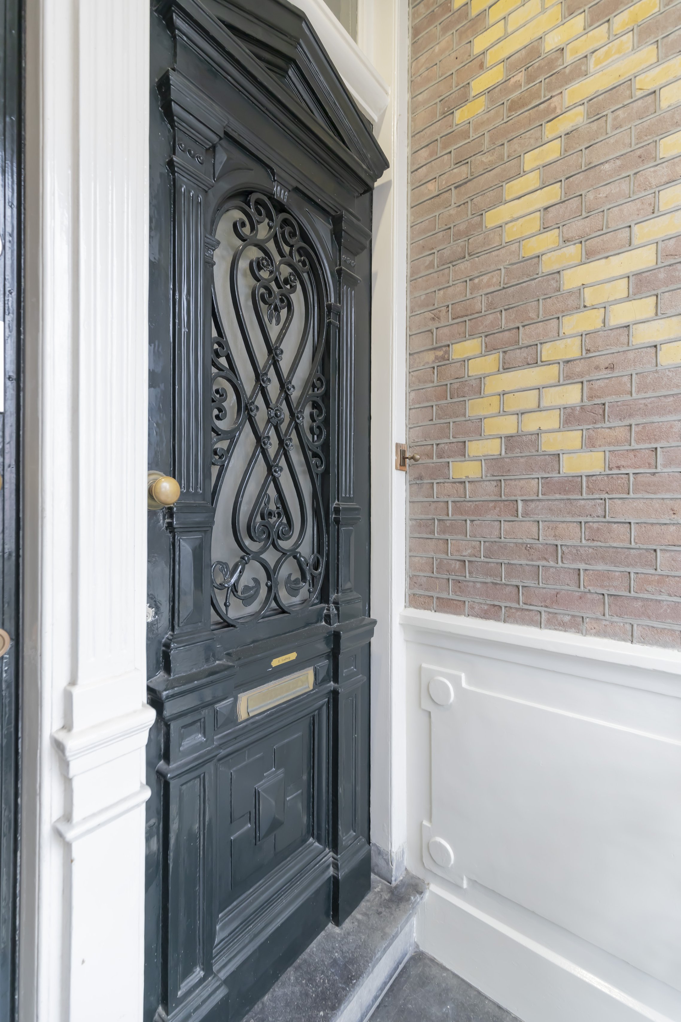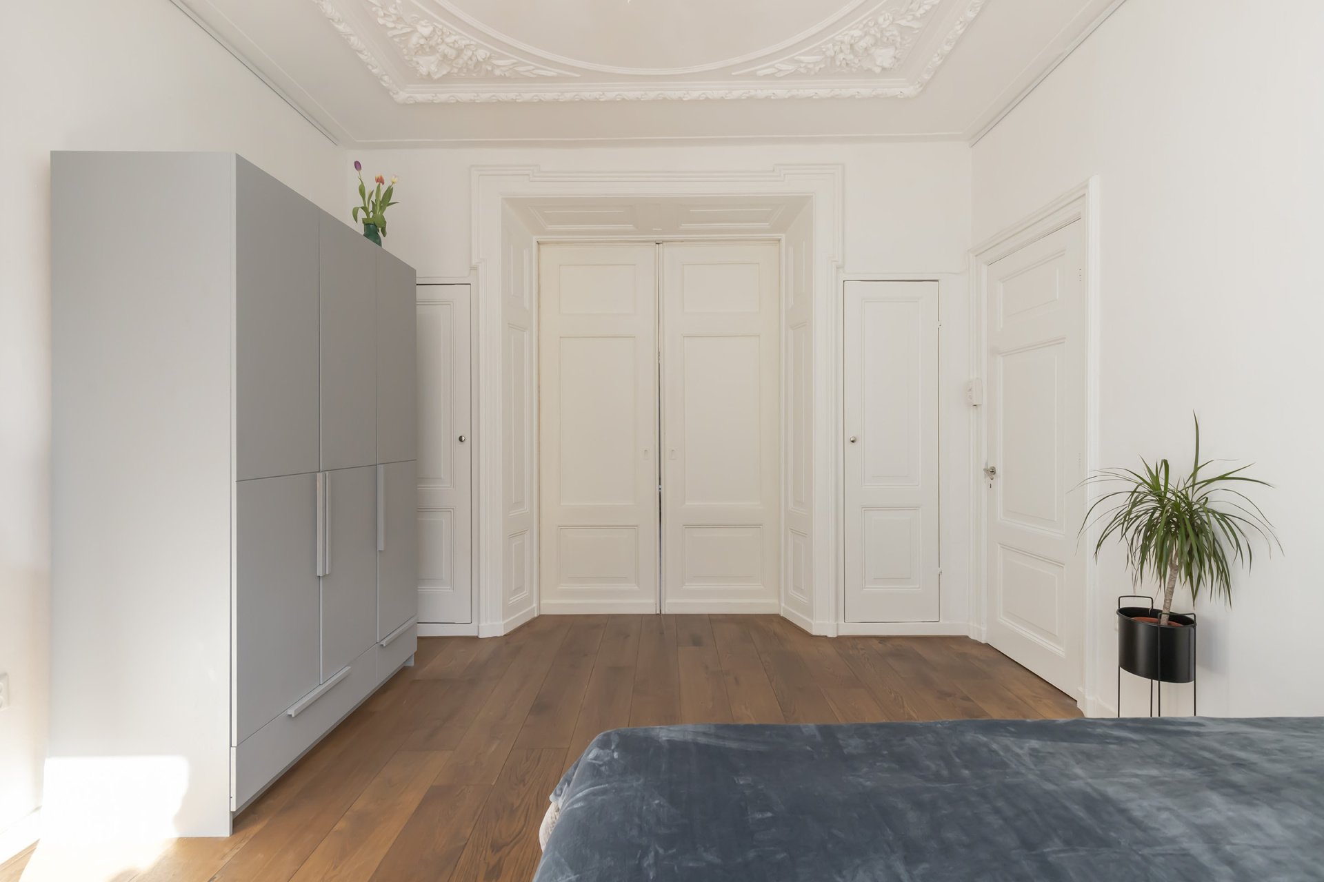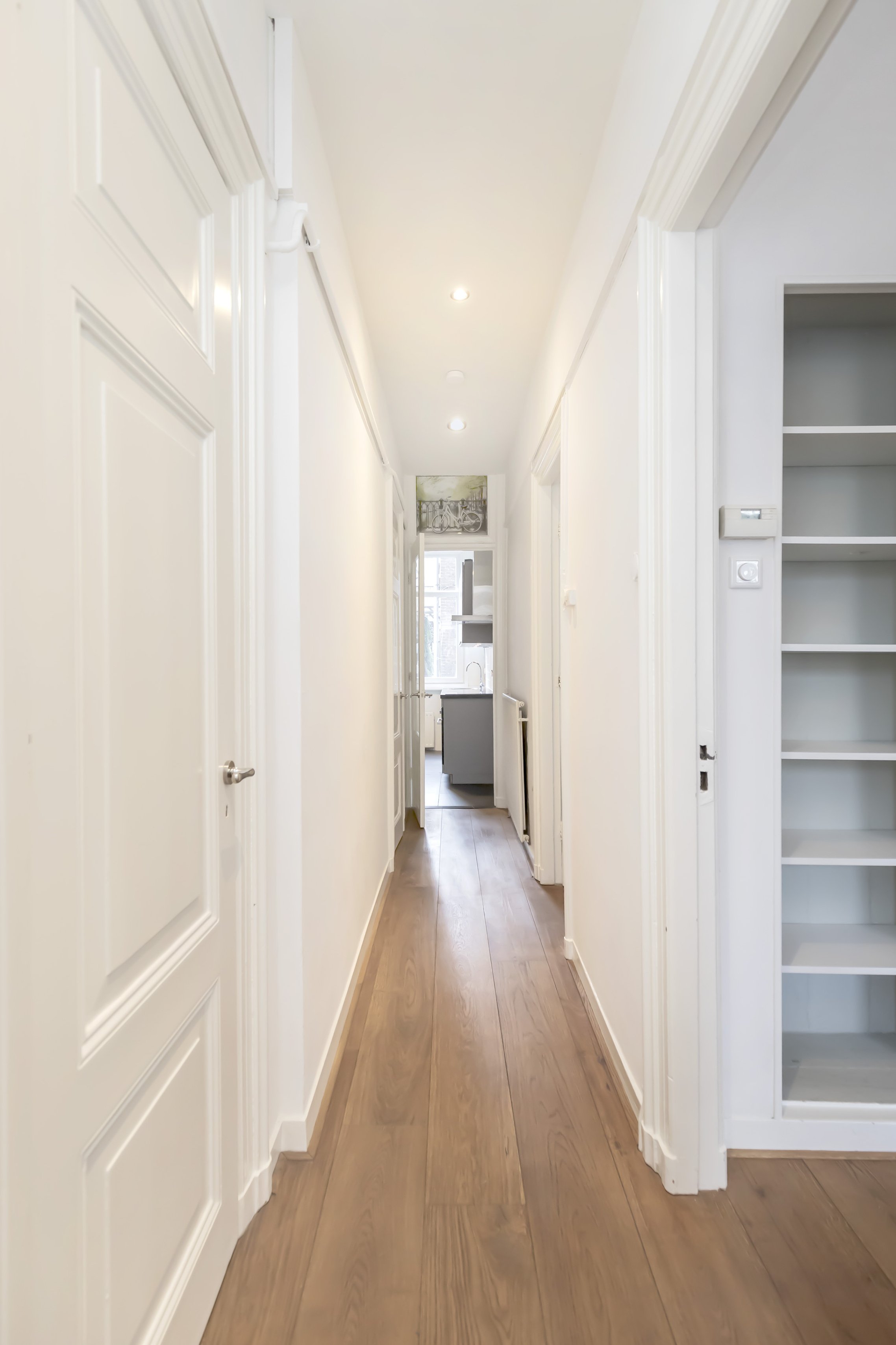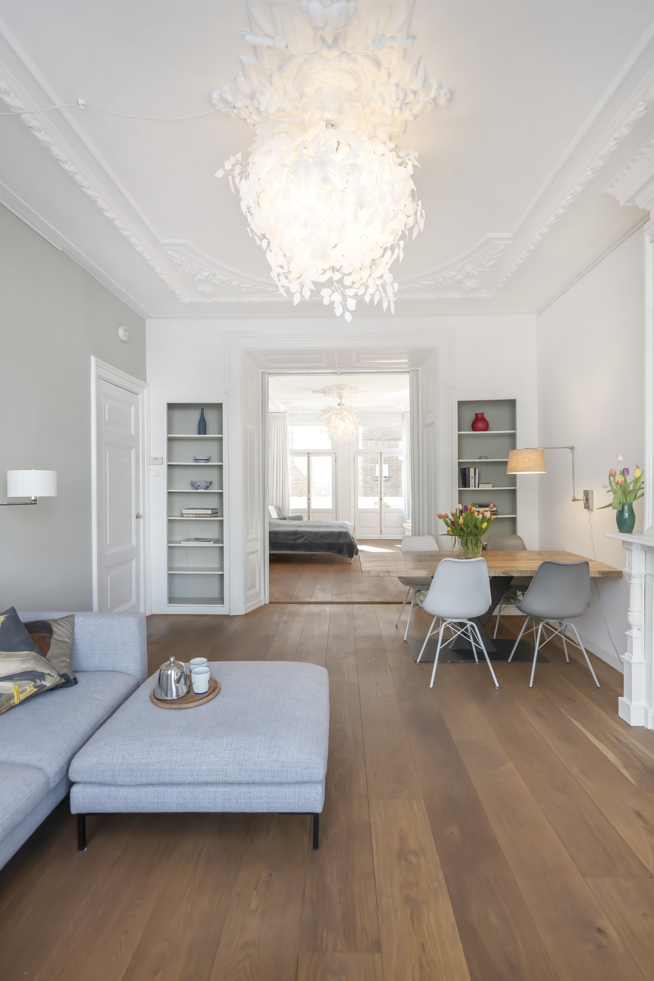 Via de eigen stijlvolle entree met originele voordeur en fraai glas-in-lood kom je in de hal, van waaruit je toegang hebt tot alle vertrekken. Aan de voorzijde ligt de ruime woonkamer met hoge ramen en uitzicht over de gracht. De kamer is licht en voelt bijzonder royaal aan dankzij het plafond van ruim drie meter hoog en de klassieke details, zoals de sierlijsten en en-suite kasten.