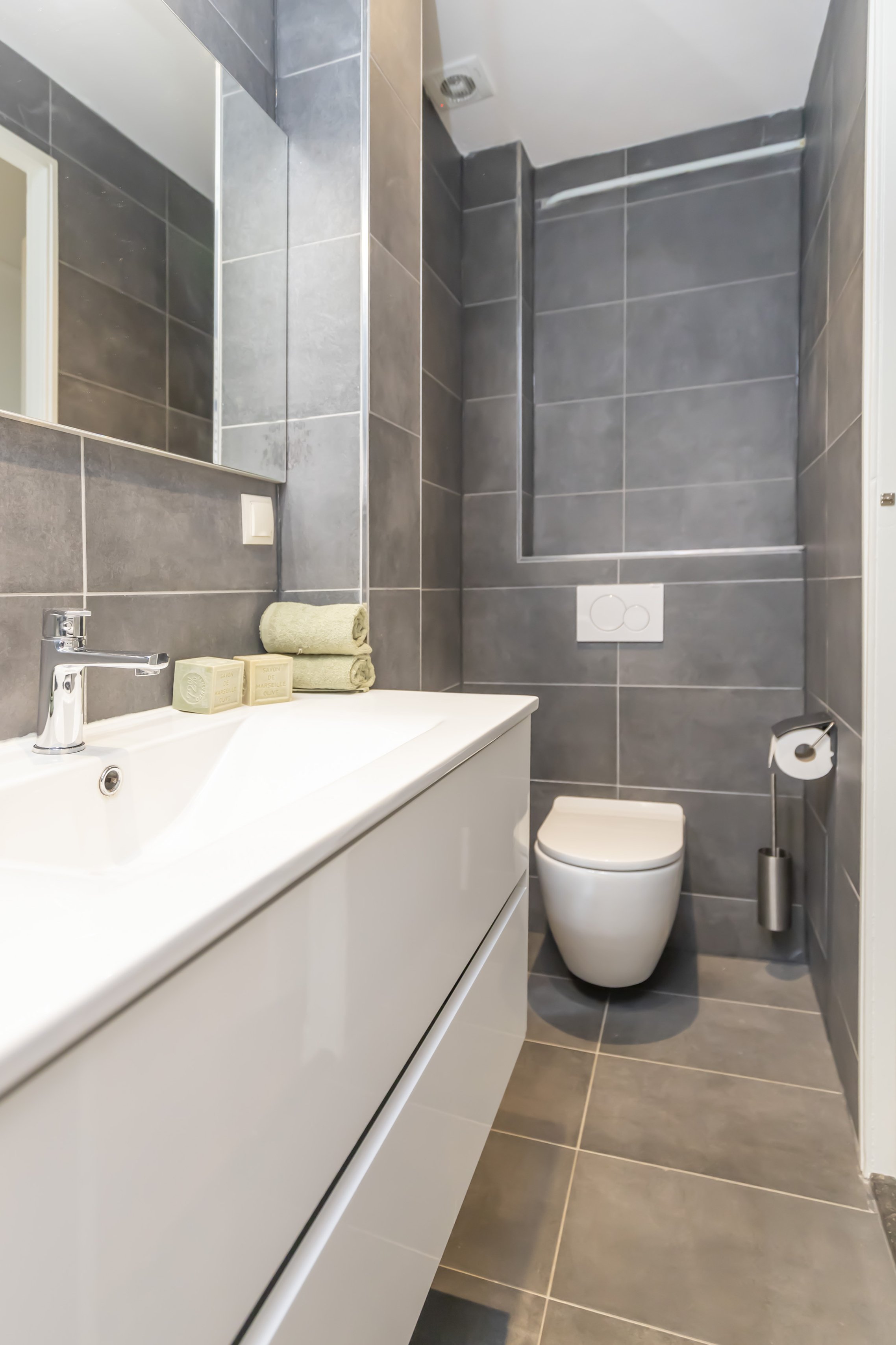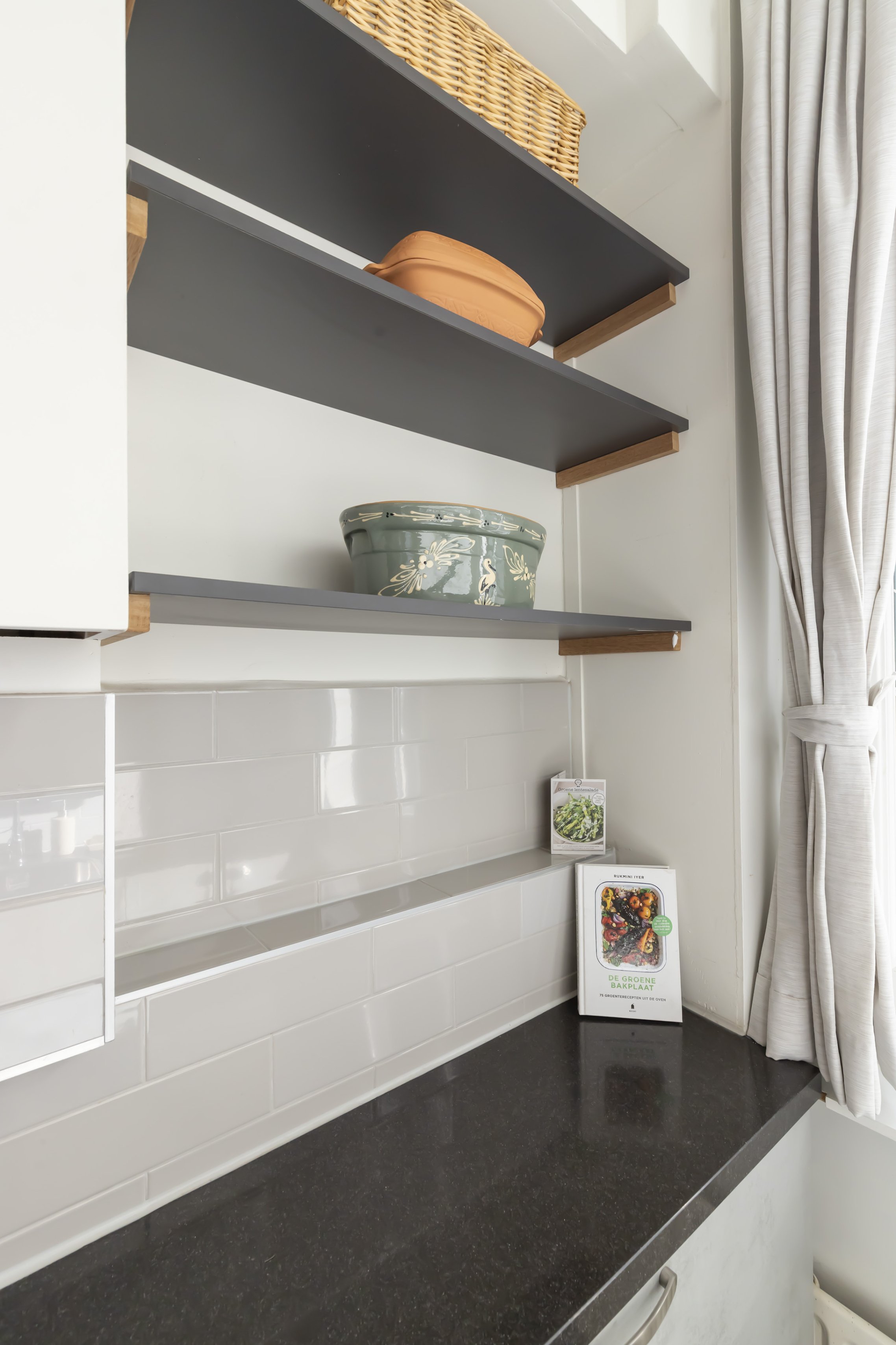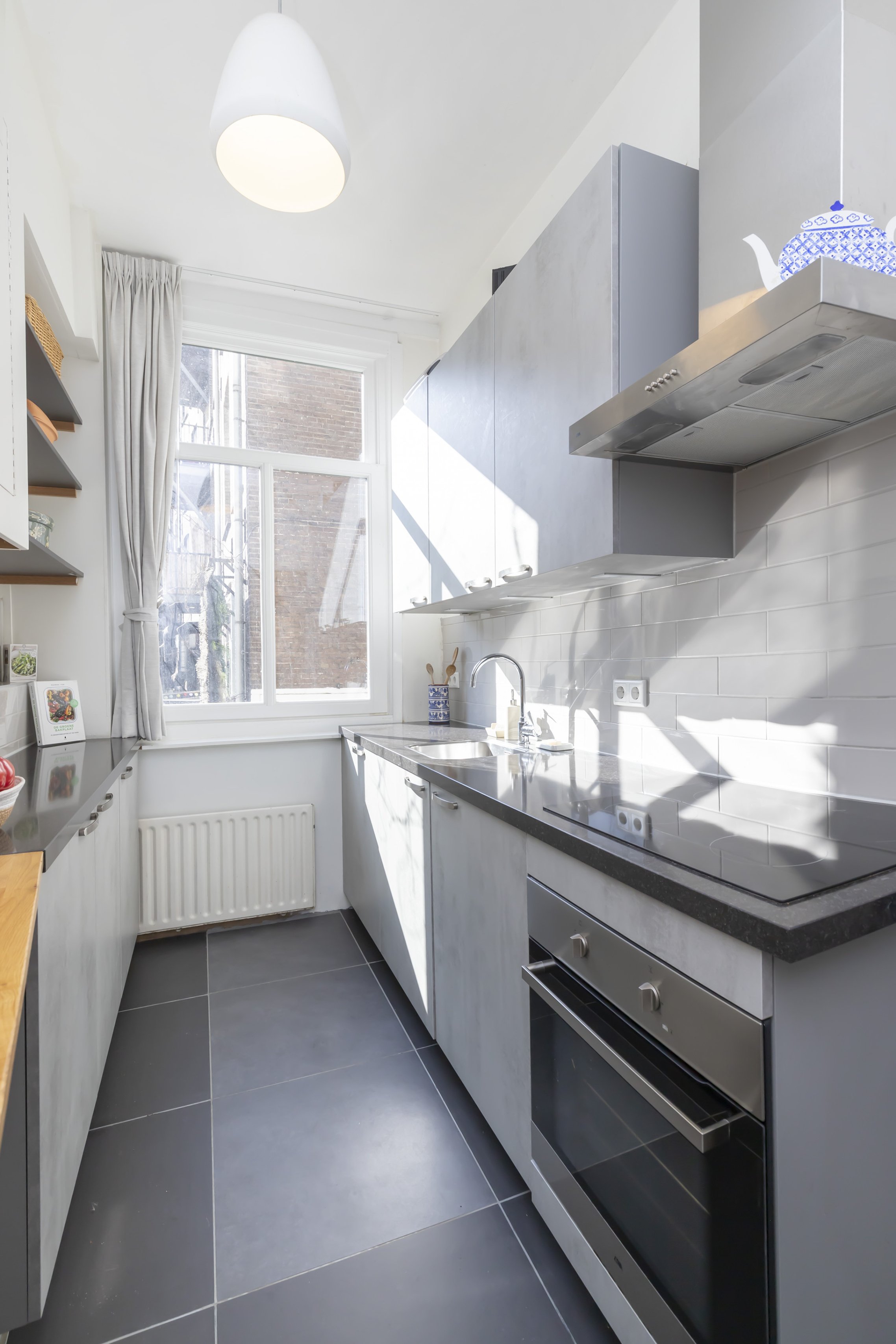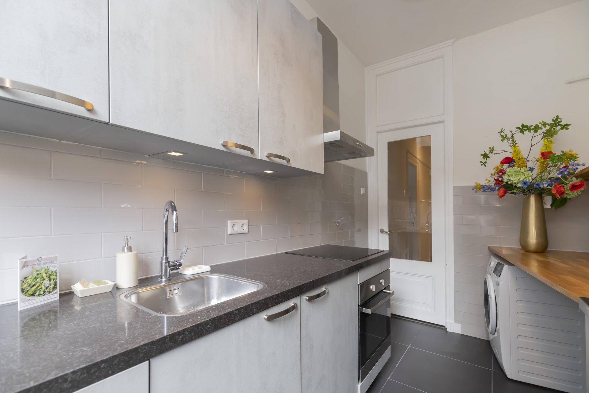 Aan de achterzijde bevindt zich de grote slaapkamer met openslaande deuren naar een balkon op het zuiden. Hier geniet je van een rustig moment met uitzicht op het binnenterrein en veel privacy. De keuken is strak en modern, voorzien van inbouwapparatuur en een wasmachine-aansluiting. De badkamer is smaakvol betegeld en uitgerust met inloopdouche, WC, wastafelmeubel en designradiator.