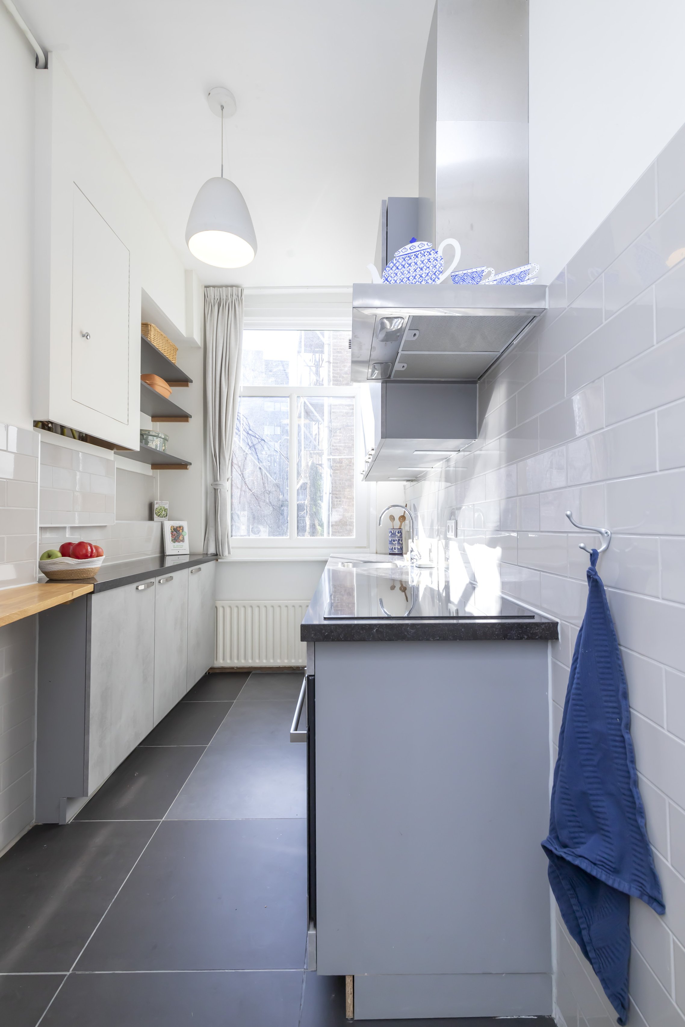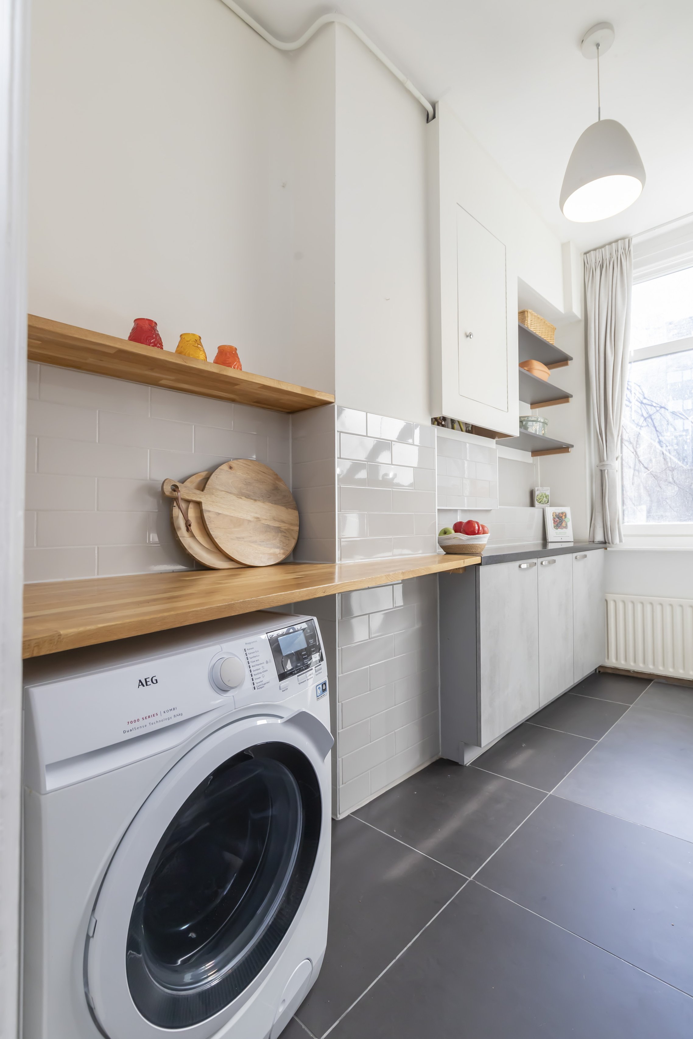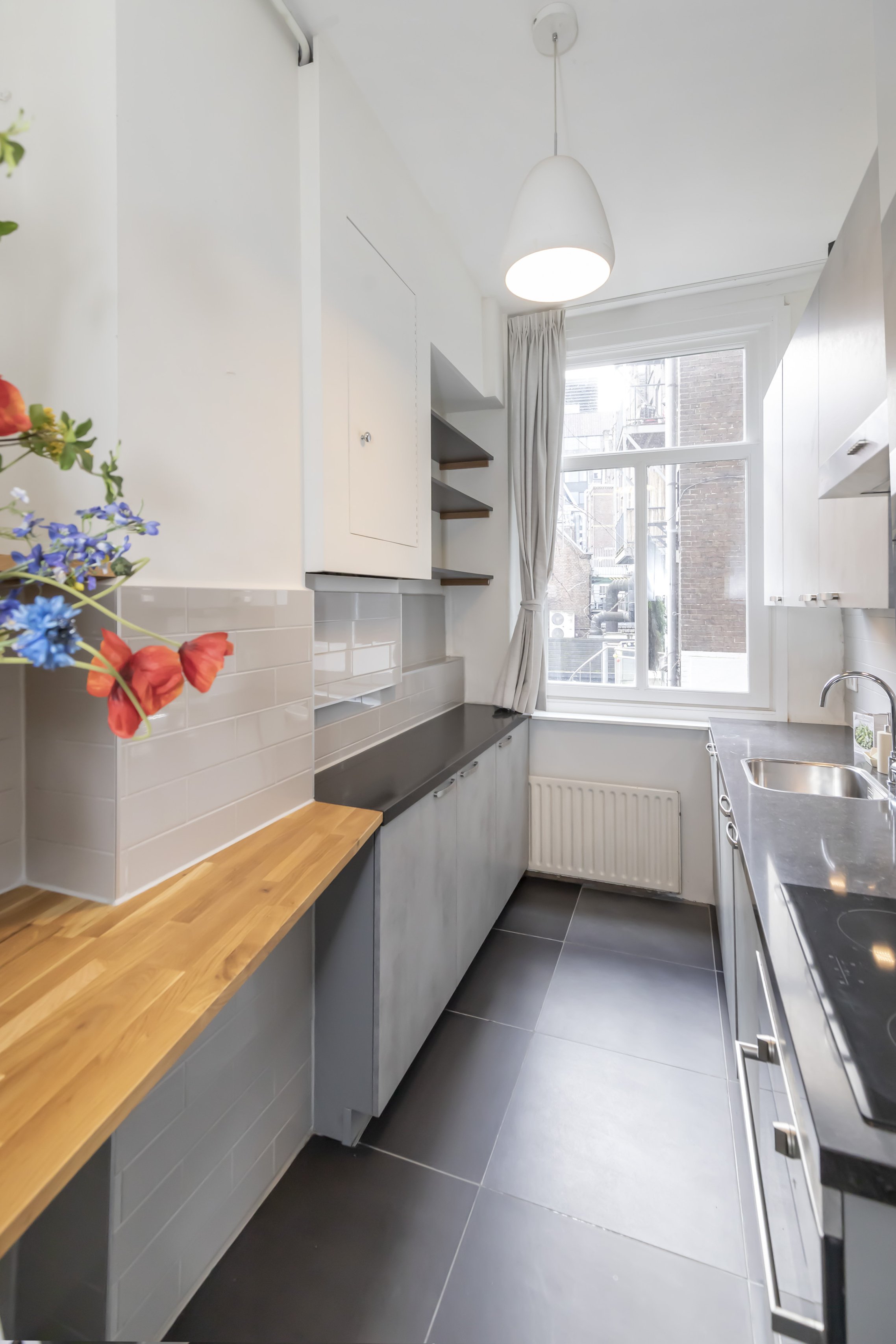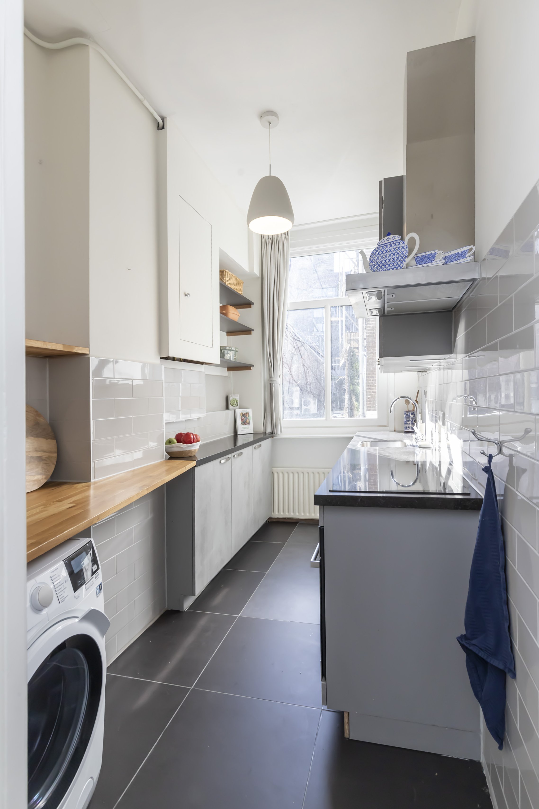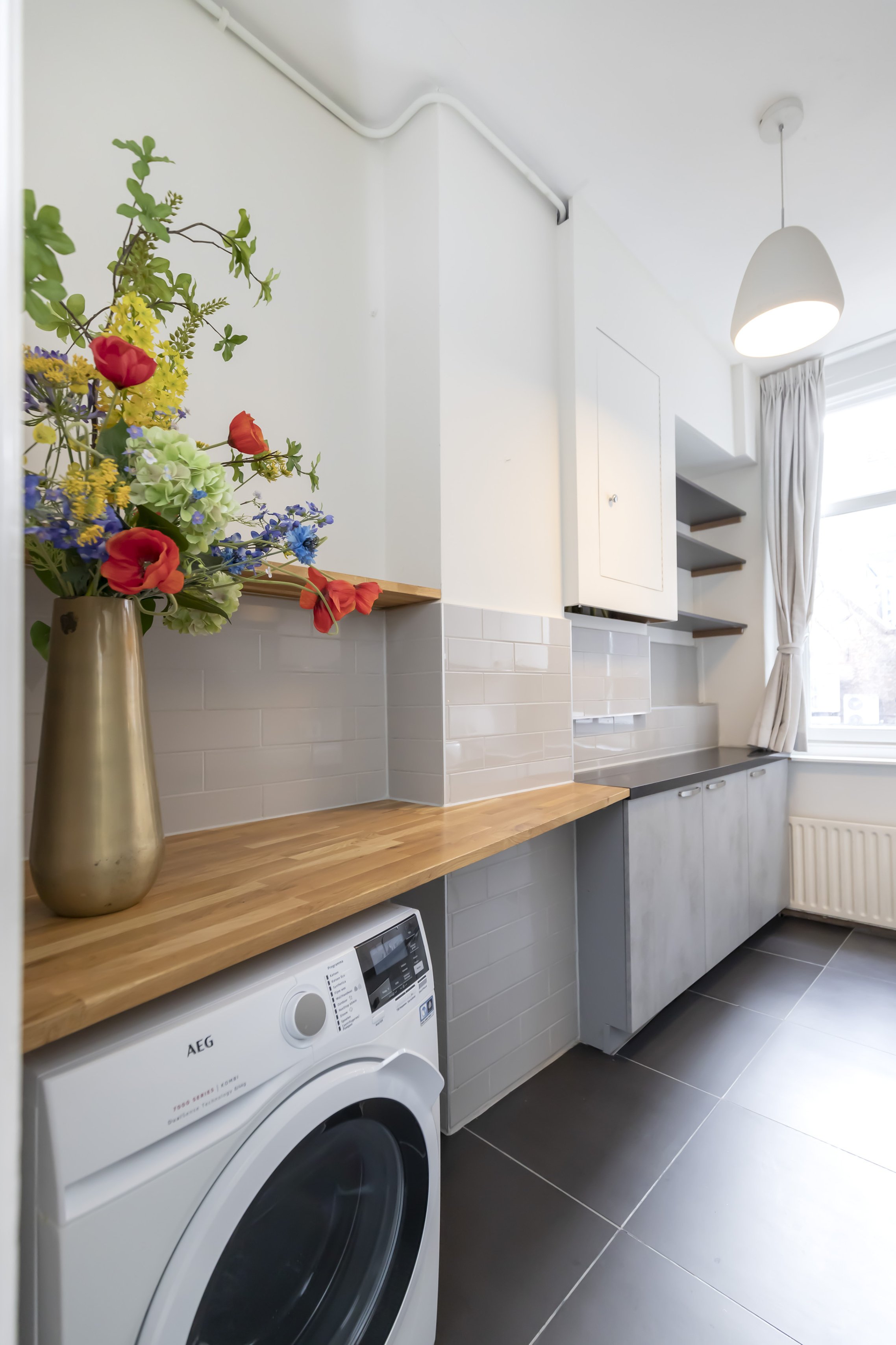 Aan de achterzijde bevindt zich de grote slaapkamer met openslaande deuren naar een balkon op het zuiden. Hier geniet je van een rustig moment met uitzicht op het binnenterrein en veel privacy. De keuken is strak en modern, voorzien van inbouwapparatuur en een wasmachine-aansluiting. De badkamer is smaakvol betegeld en uitgerust met inloopdouche, WC, wastafelmeubel en designradiator.