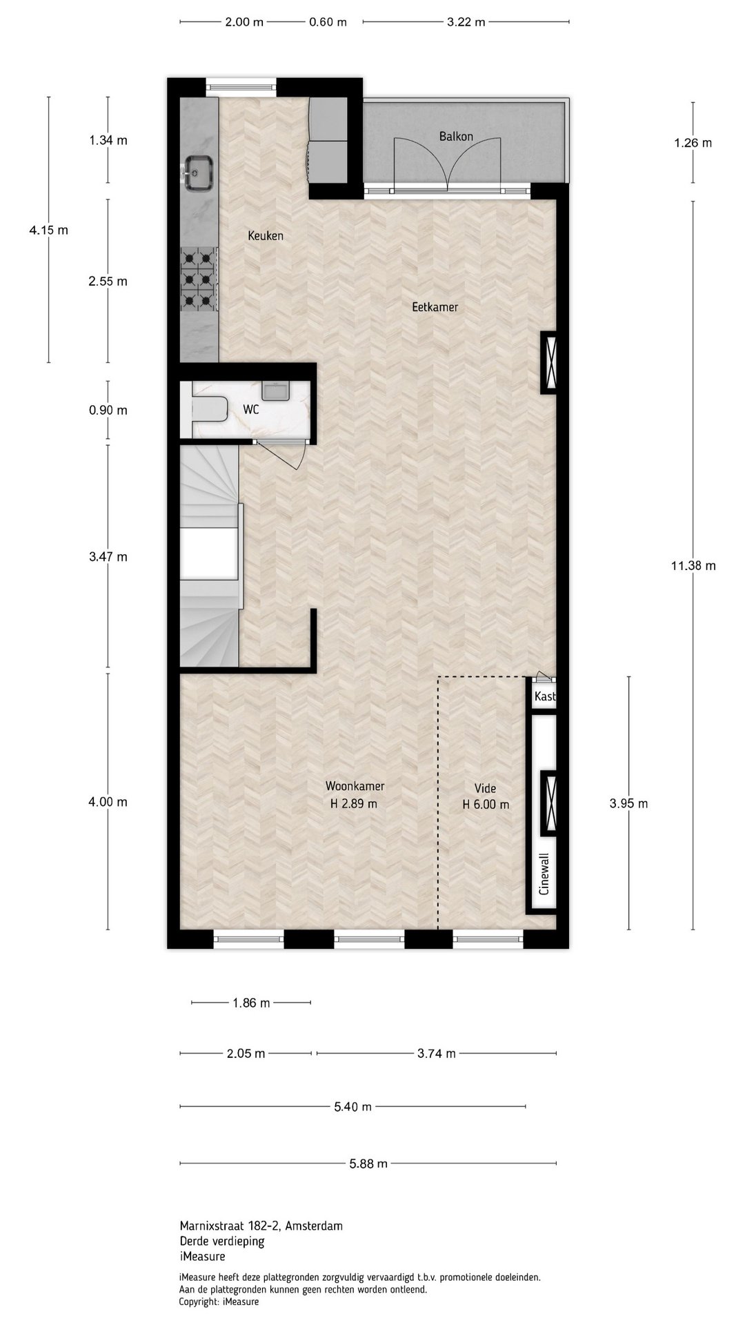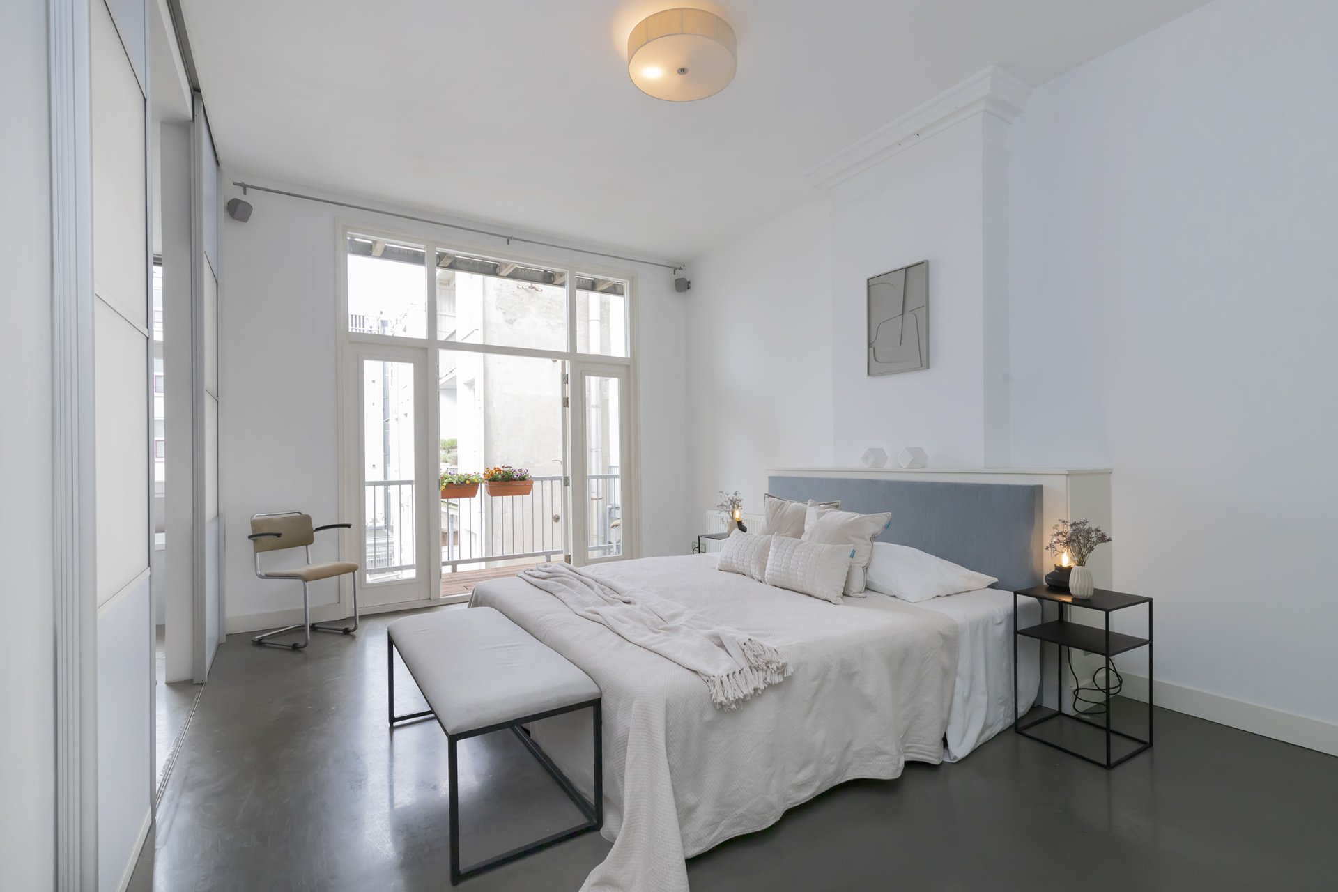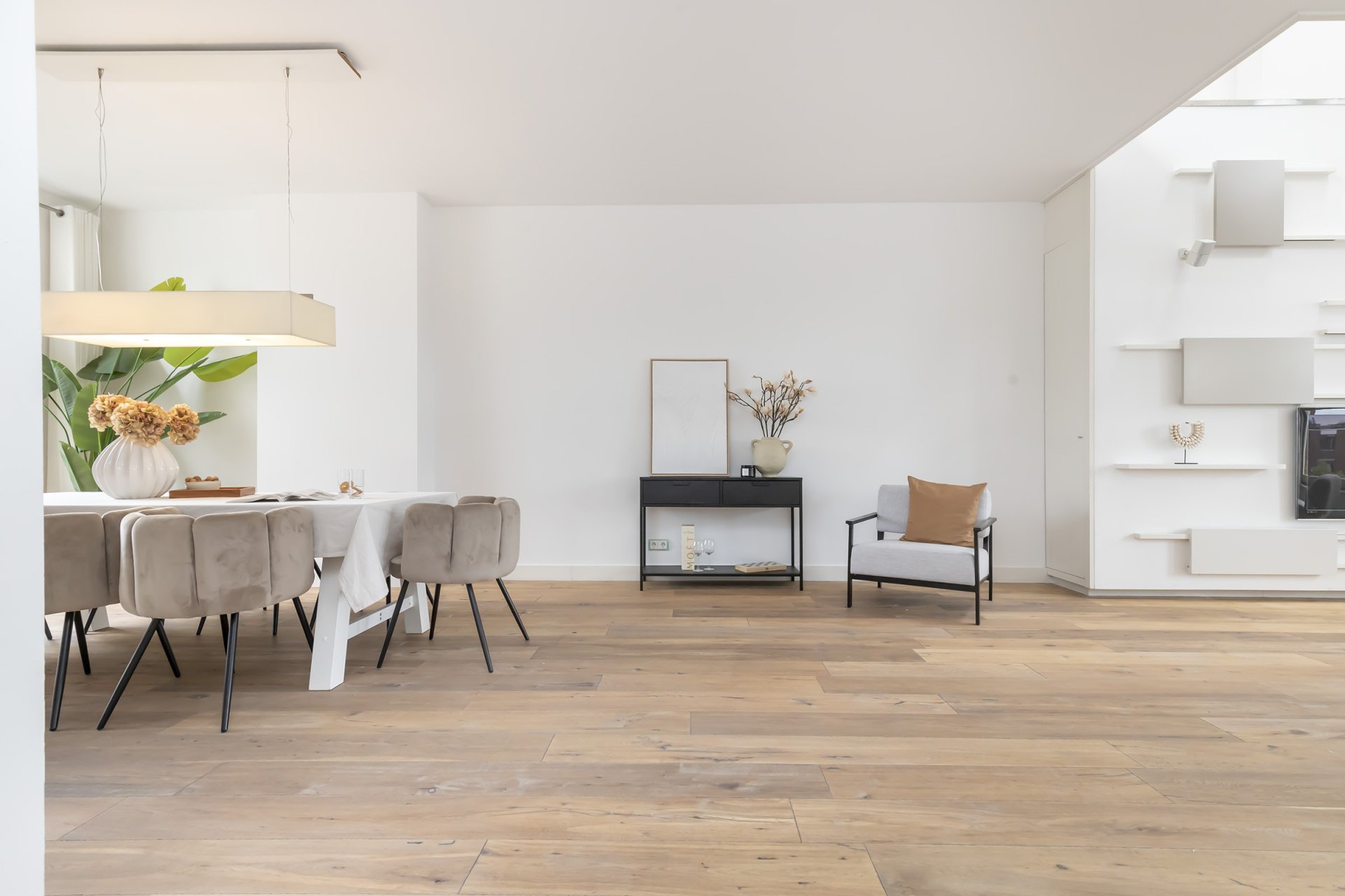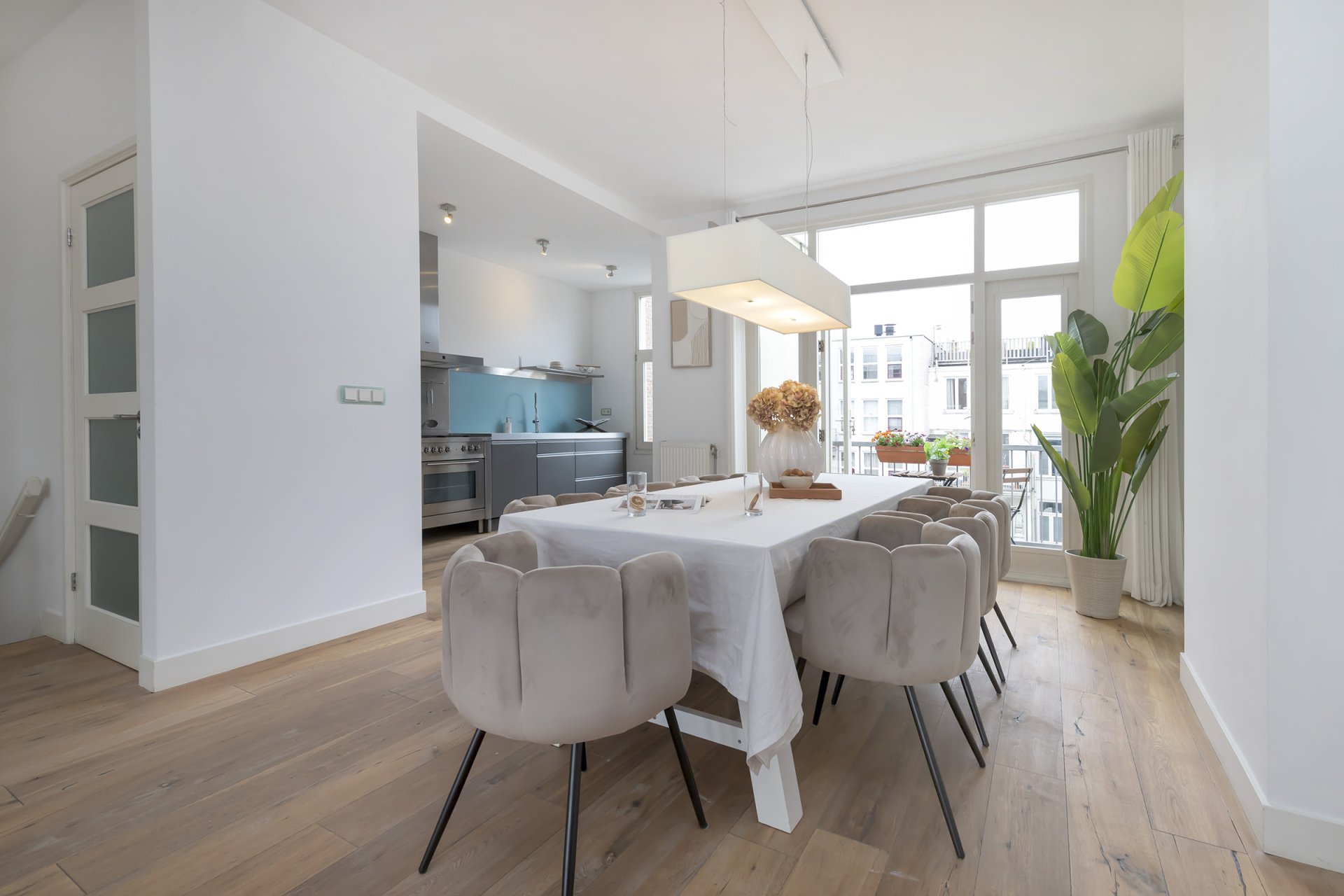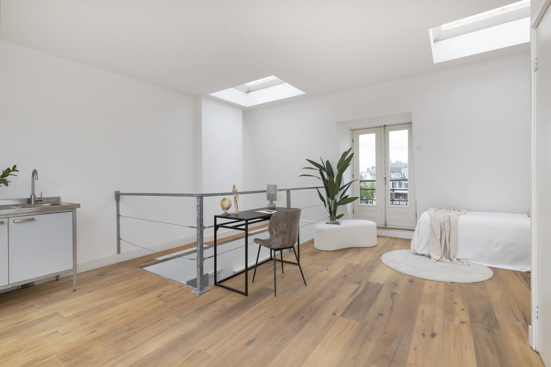 Een verdieping hoger ontvouwt zich de indrukwekkende leefruimte. De woonkamer aan de voorzijde, met vide en hoge ramen, baadt in het licht en heeft uitzicht over de levendige straat. Aan de achterzijde bevindt zich de eetkamer met aangrenzend balkon en de semi-open keuken, voorzien van diverse inbouwapparatuur. Een toilet met wastafel completeert deze verdieping.