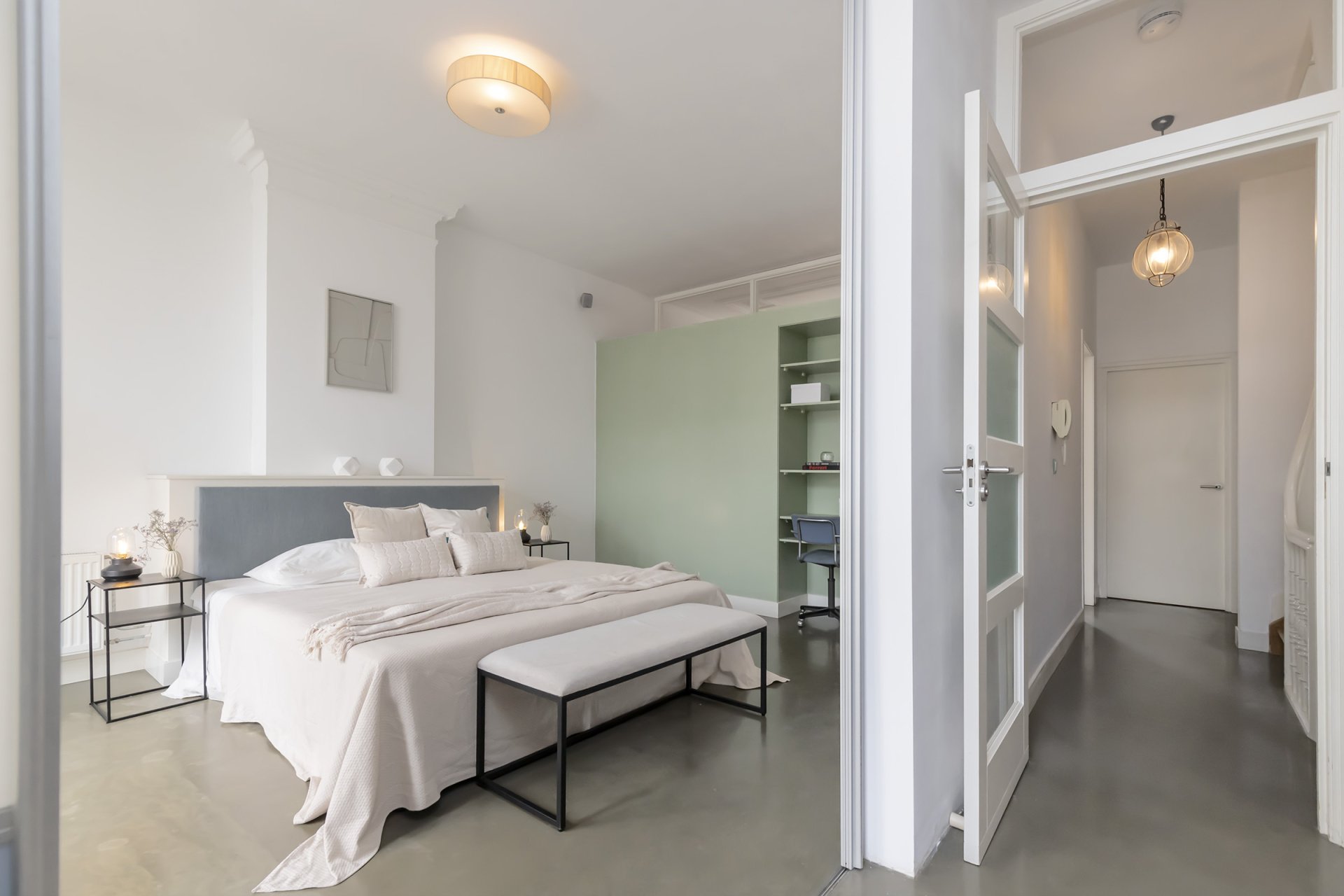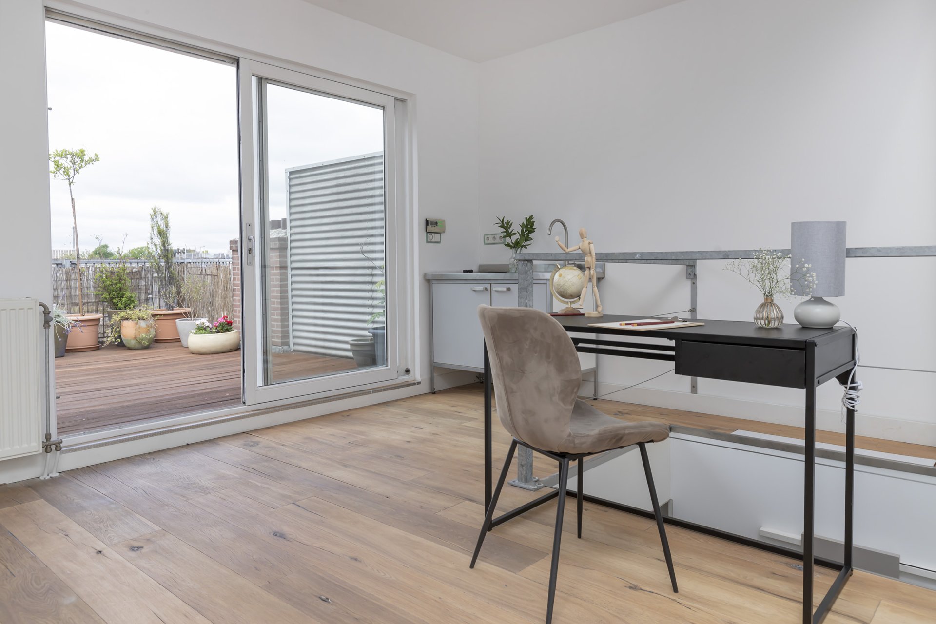 Op de bovenste etage bevindt zich een ruime slaap- of werkkamer met toegang tot het absolute hoogtepunt van dit huis: een royaal dakterras van 33 m², gunstig gelegen op het zuidwesten. Een plek om van de zon te genieten, met vrij uitzicht over de stad – inclusief een buitendouche voor de zomerse dagen.