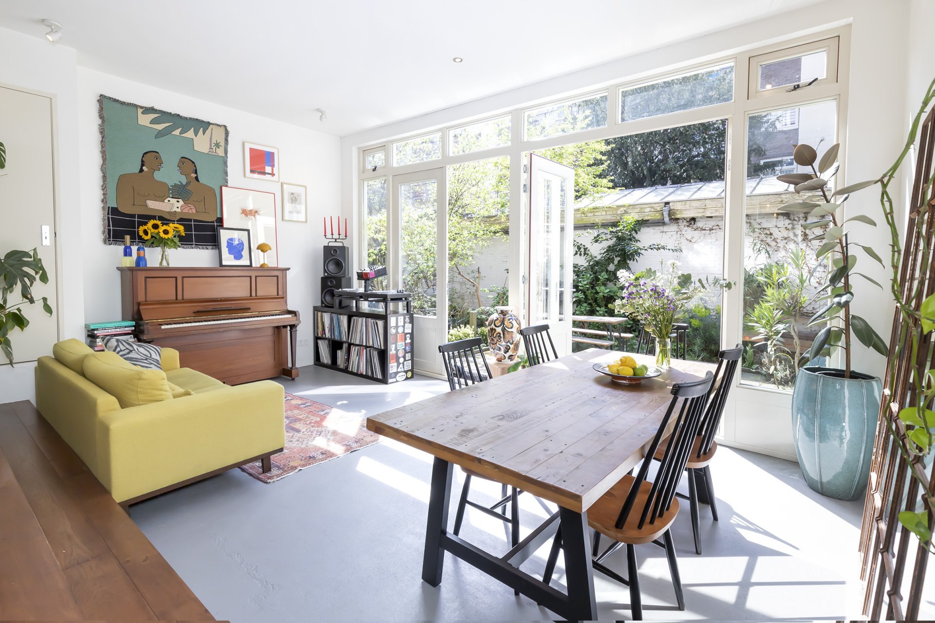 From the kitchen, there is access to the second bedroom, as well as to the living room, which is located a few steps lower in the rear extension — complete with underfloor heating! The split-level layout creates a playful effect and gives the apartment a unique character. The extension is wonderfully bright, thanks to the double French doors that open directly onto the garden. Facing southwest, the garden enjoys plenty of afternoon and evening sun.
