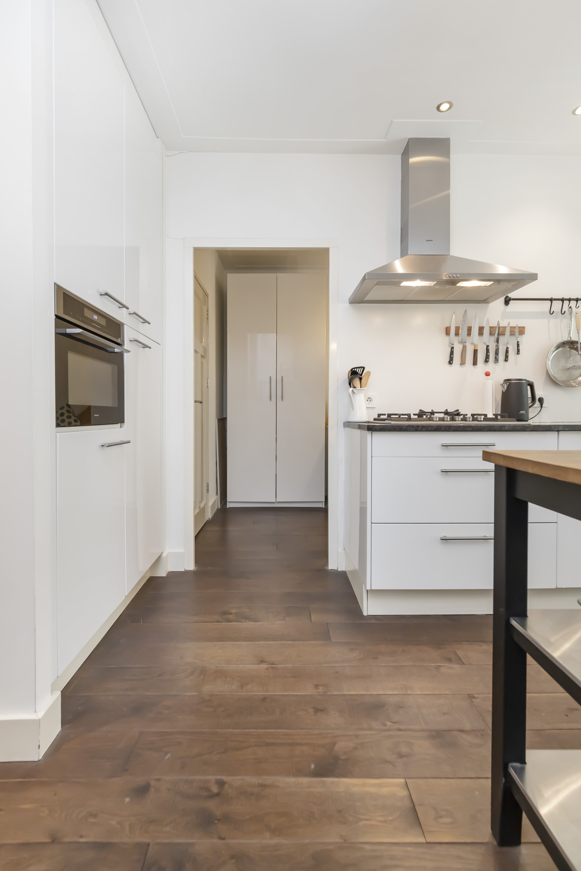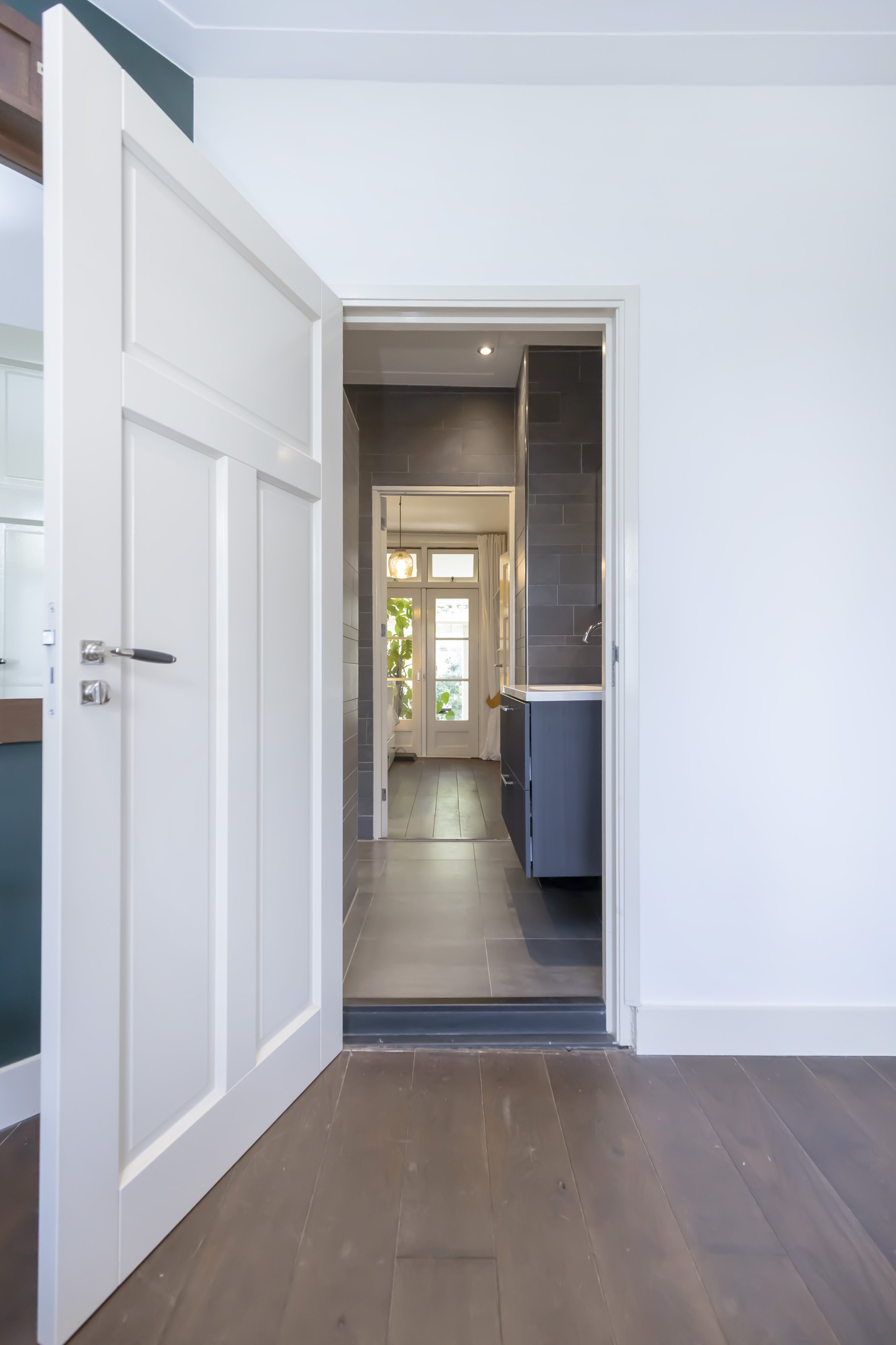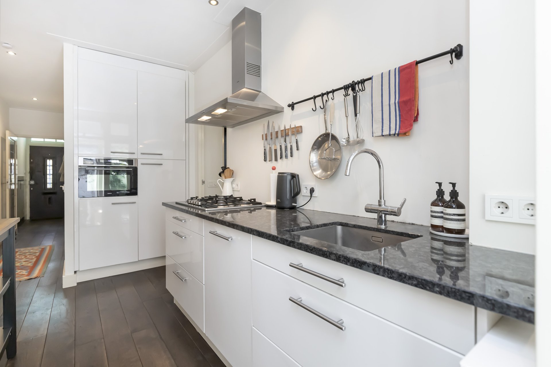 Via de eigen voordeur op straatniveau kom je binnen in de hal. Hier vind je direct de hoofdslaapkamer aan de voorzijde, een separate wc, een handige bergruimte met meterkast én een kast voor de wasmachine. Aan het einde van de hal opent zich de royale woonkeuken: een fijne, lichte ruimte met moderne inbouwapparatuur en genoeg plek voor een grote eettafel.