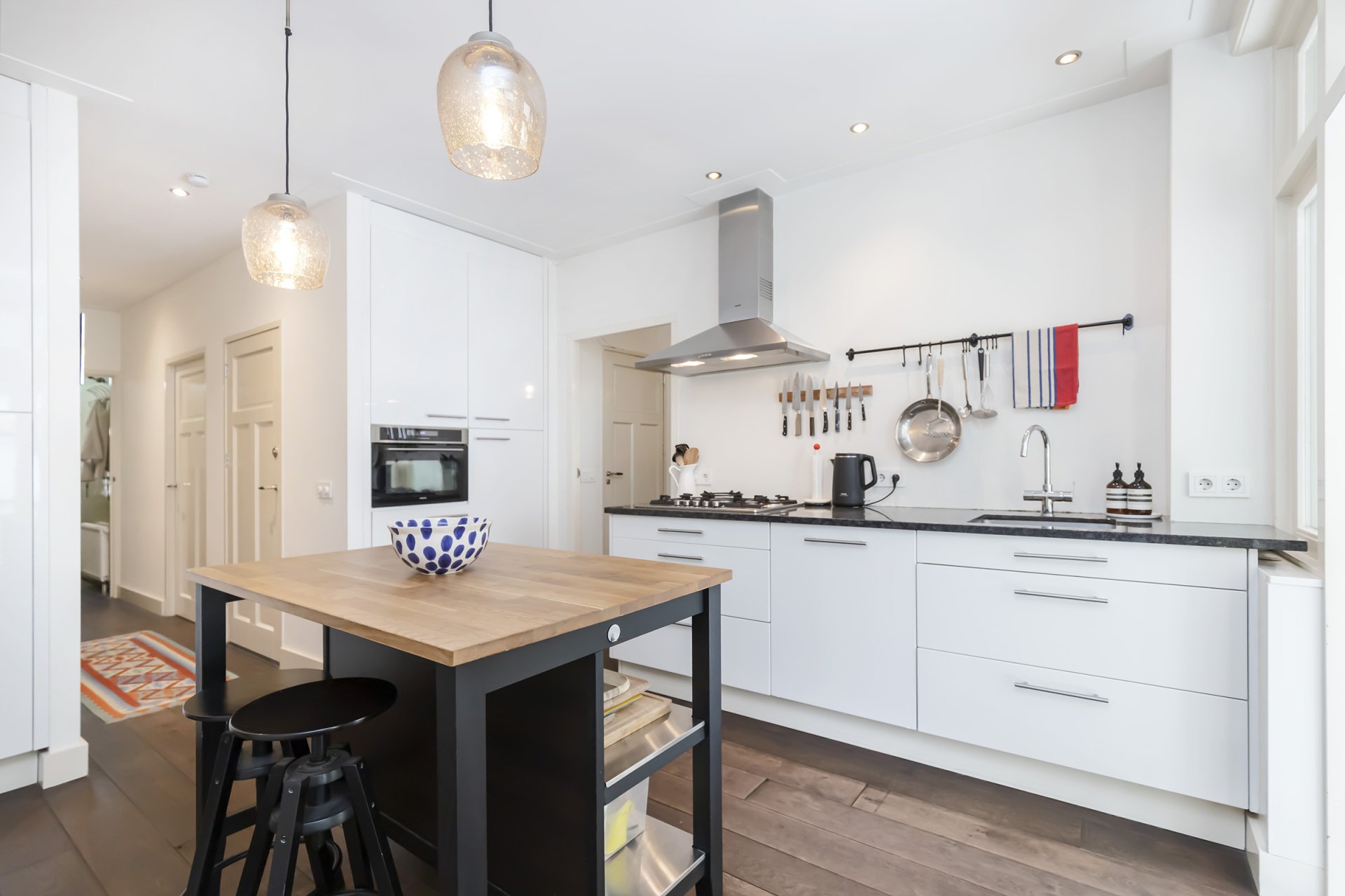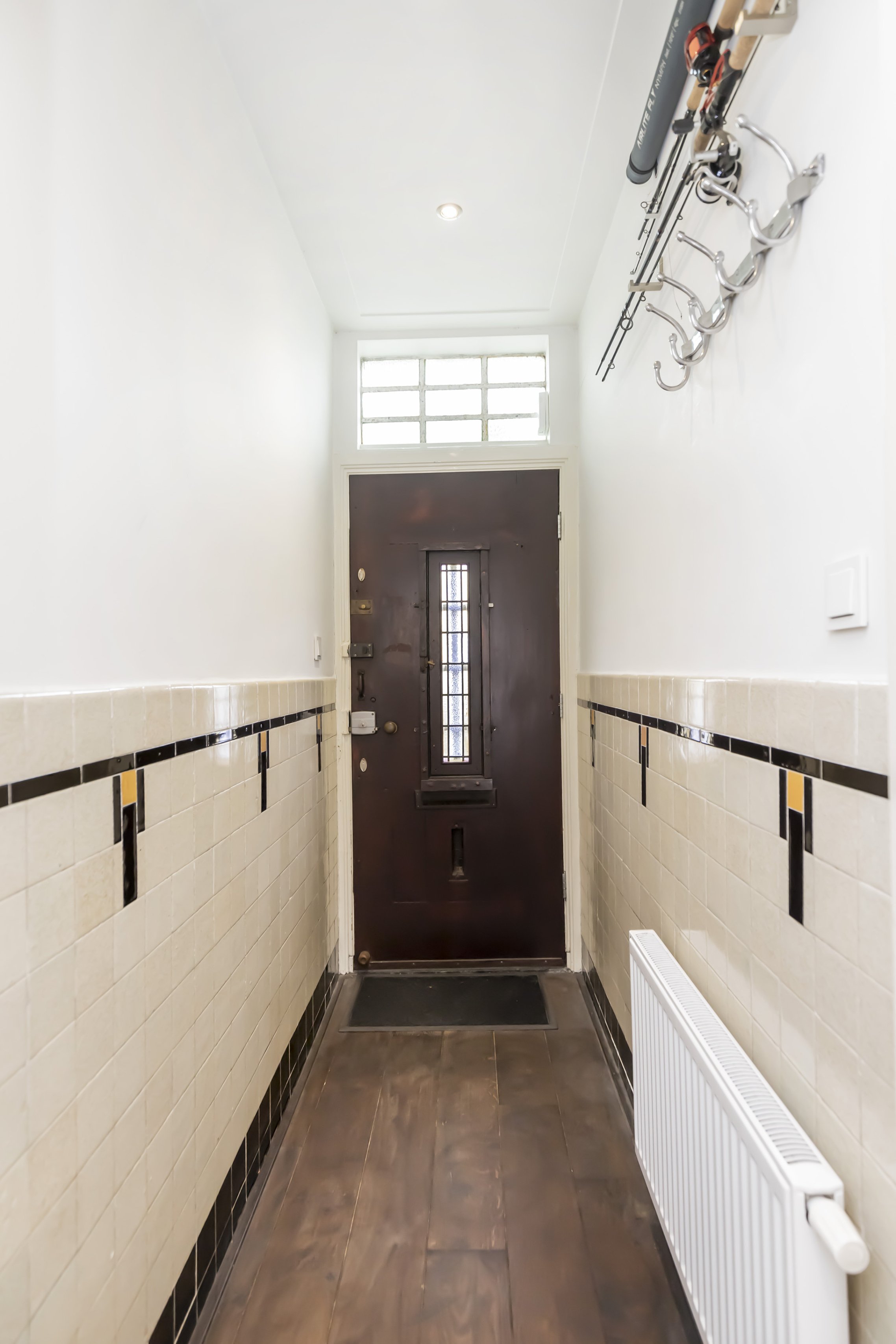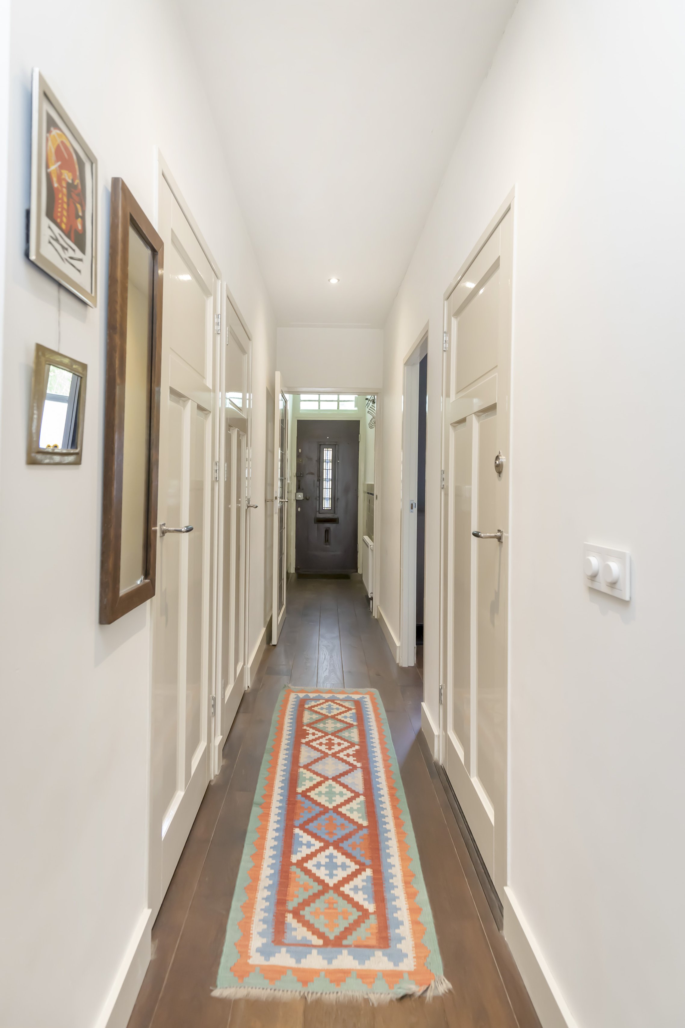 Via de eigen voordeur op straatniveau kom je binnen in de hal. Hier vind je direct de hoofdslaapkamer aan de voorzijde, een separate wc, een handige bergruimte met meterkast én een kast voor de wasmachine. Aan het einde van de hal opent zich de royale woonkeuken: een fijne, lichte ruimte met moderne inbouwapparatuur en genoeg plek voor een grote eettafel.