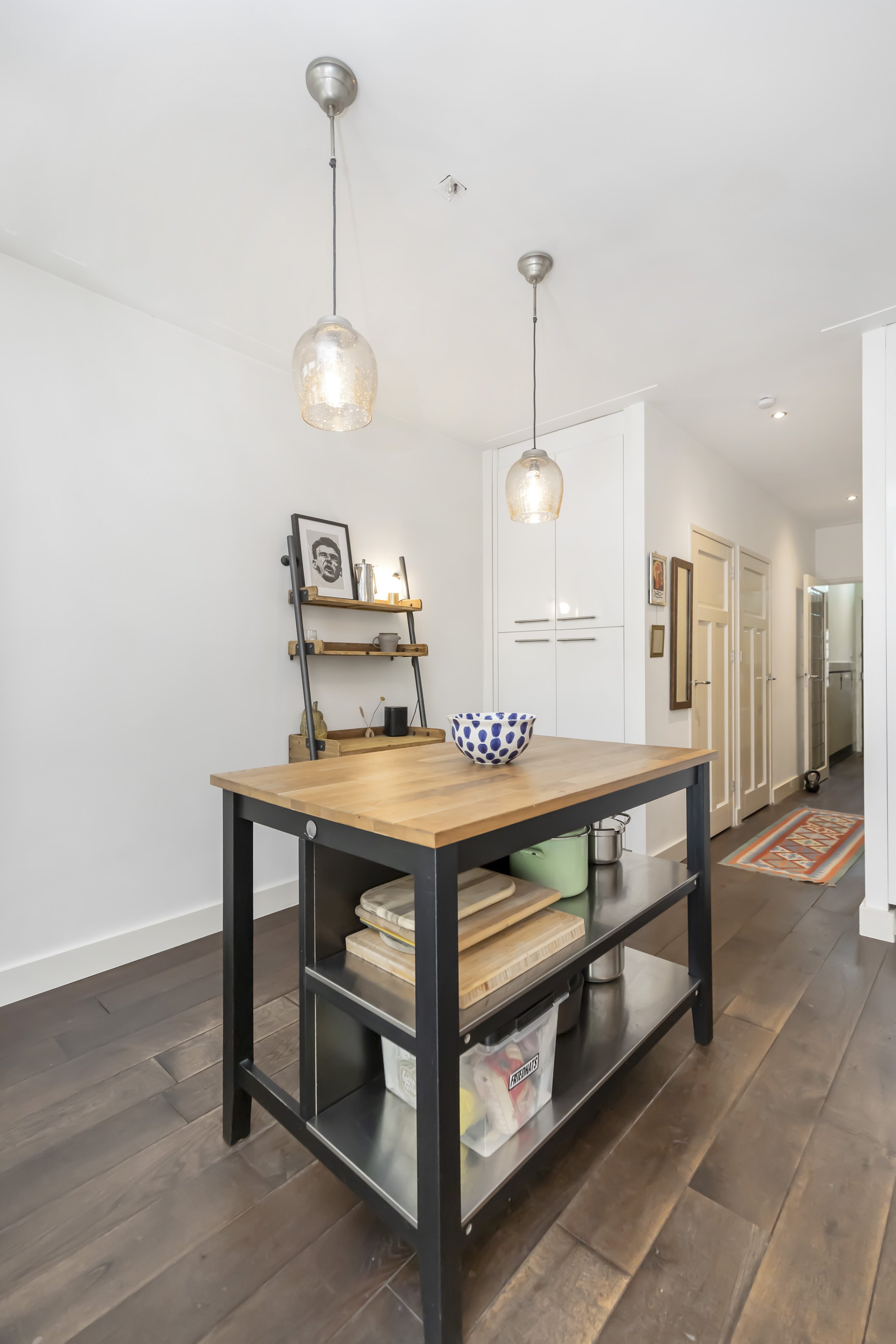 - Playful split-level layout between kitchen and living room