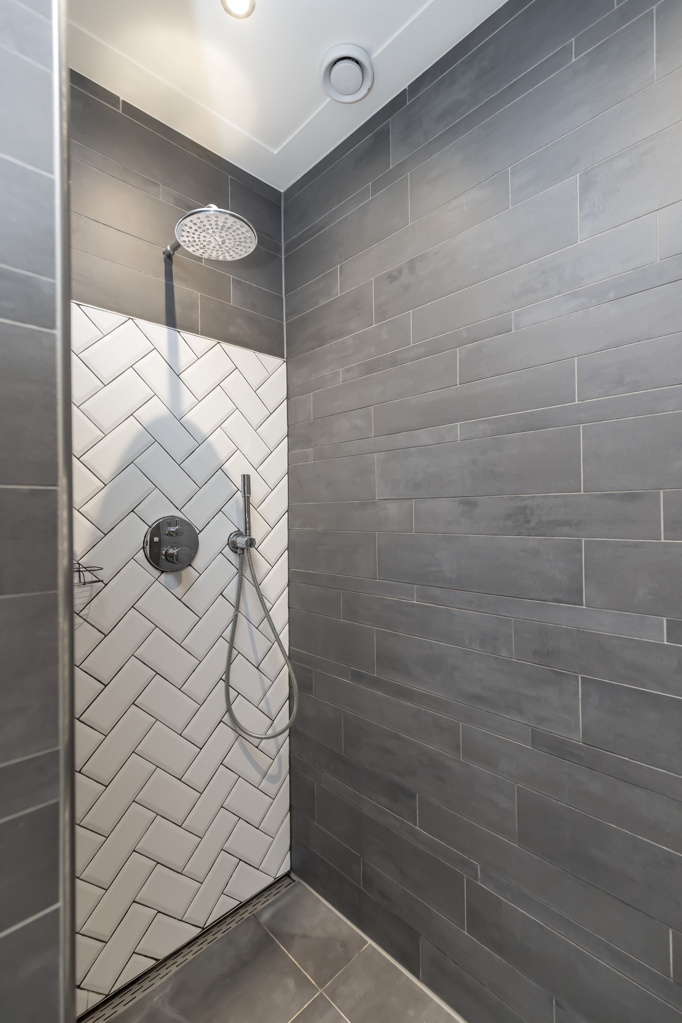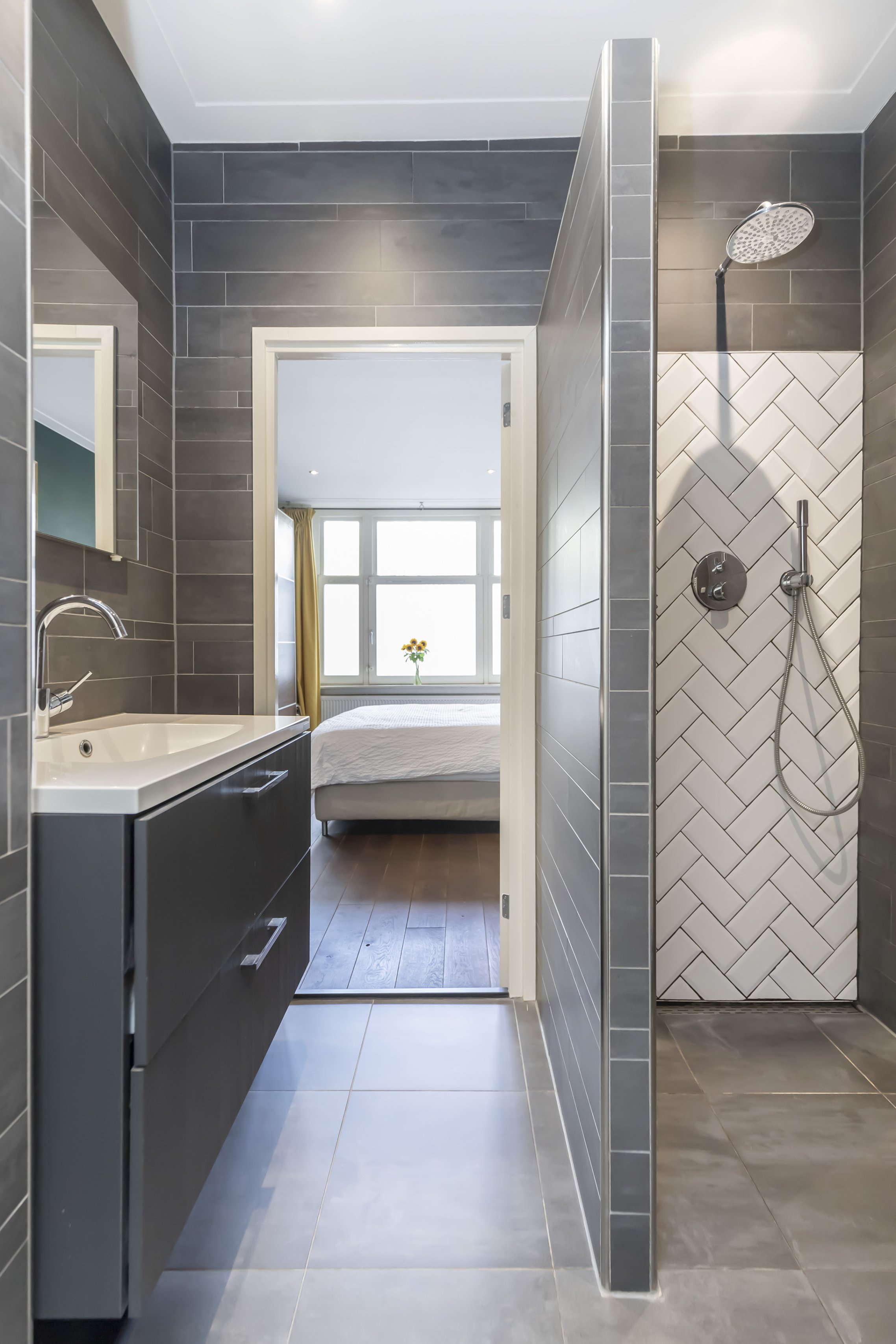 De badkamer ligt centraal tussen beide slaapkamers en is bereikbaar vanuit de beide slaapkamers.
