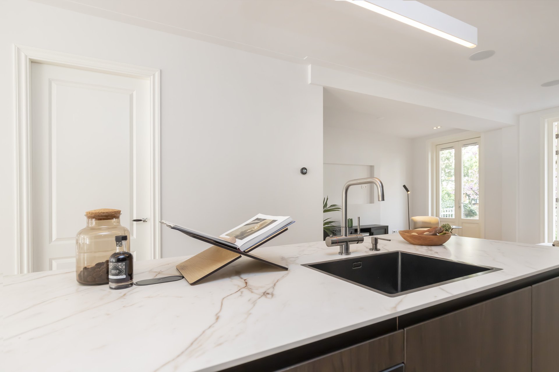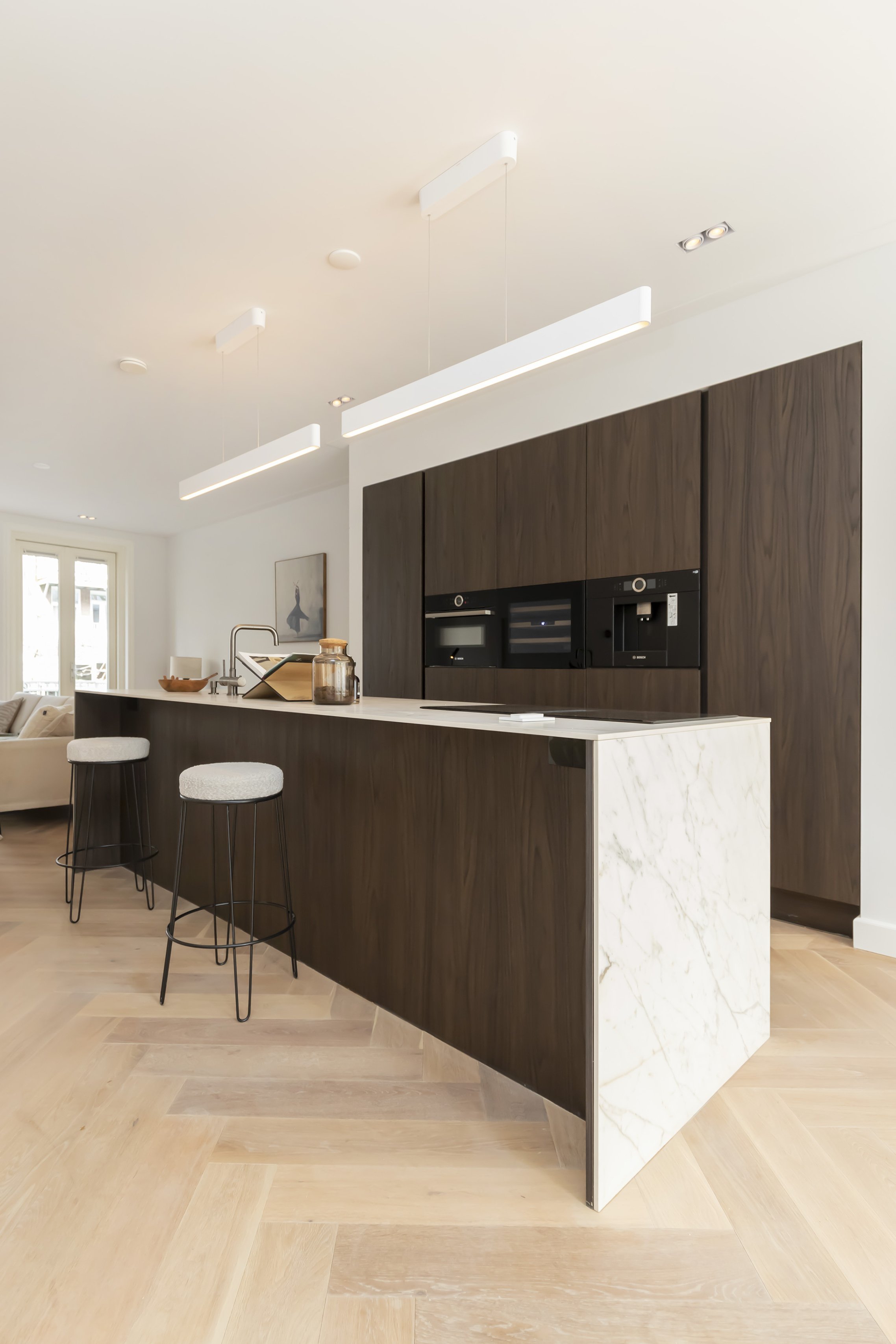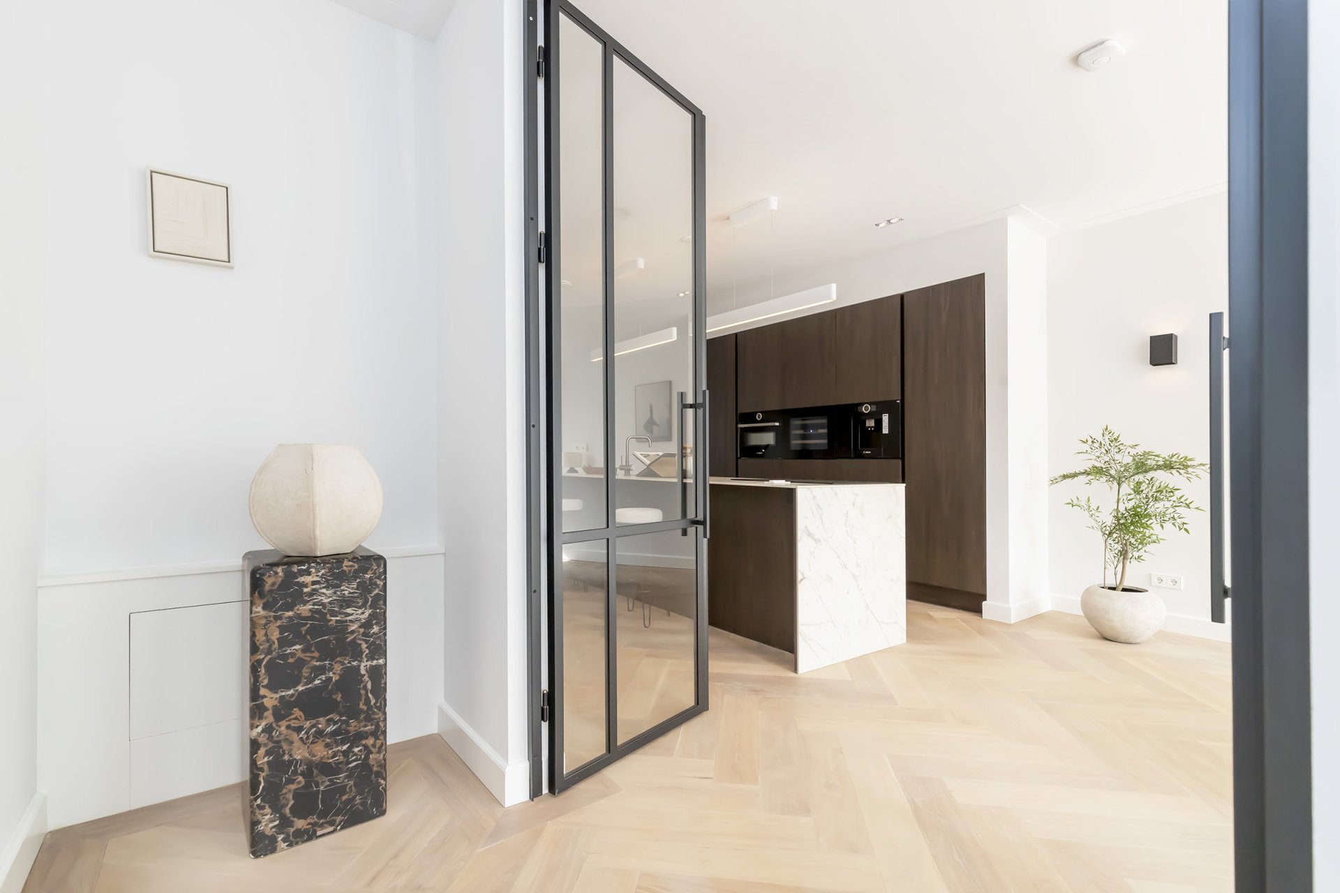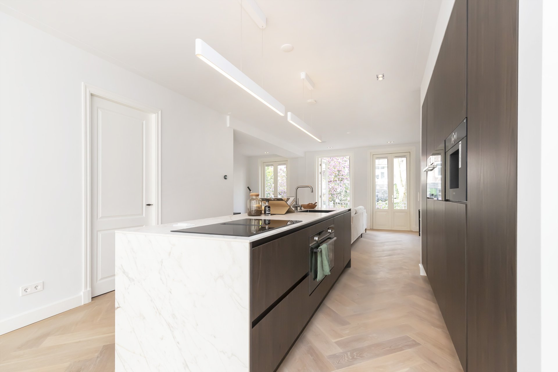 Entree op de bel-etage, hal met garderobe en royale deuren naar de woonkamer; Ruime L-vormige woonkamer met open keuken voorzien van diverse inbouwapparatuur (o.a. extra brede 90 cm oven, een wijnklimaatkast, een vaatwasser, een inductiekookplaat met afzuigsysteem, een koffiezet apparaat, een koeldiepvries combi, een tweede combi oven en een Quooker). Vanuit de woonkamer heb je middels 3 openslaande (dubbele deuren) toegang tot het grote verhoogde terras aan de achterzijde.