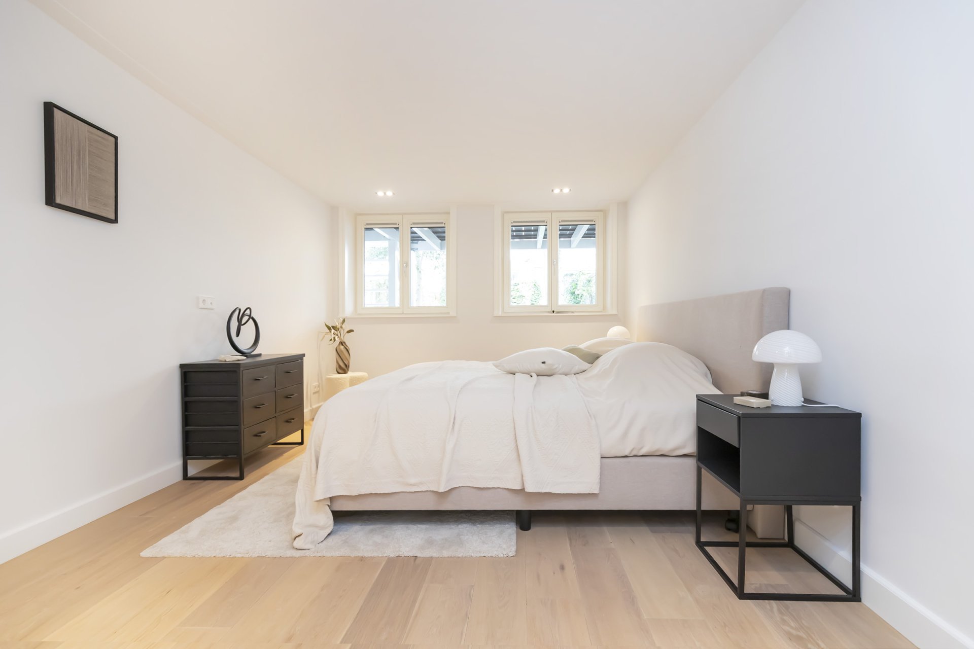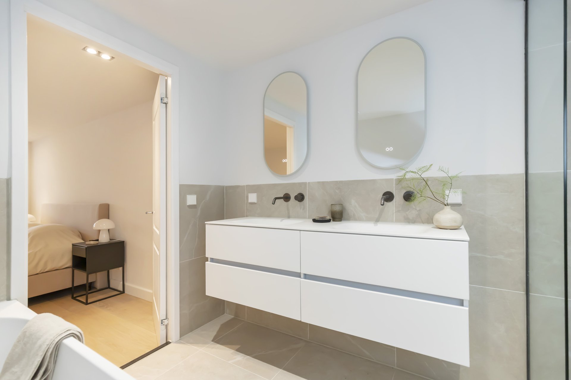 Via de overloop bereik je de ruime slaapkamer aan de voorzijde; in het midden een tweede badkamer met douche en vaste wastafel. Aan de overzijde een separaat toilet met fontein. De Master bedroom aan de achterzijde heeft toegang tot een eigen badkamer voorzien van ligbad, luxe meubel met dubbele wastafel en een dubbele inloopdouche, daarnaast nog een tweede ruime slaapkamer aan de achterzijde.