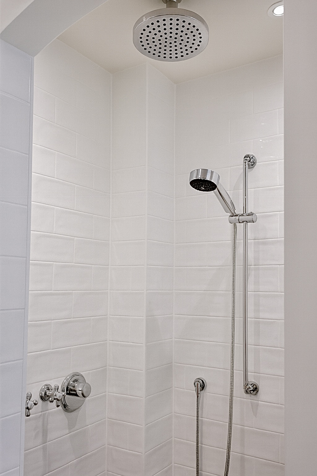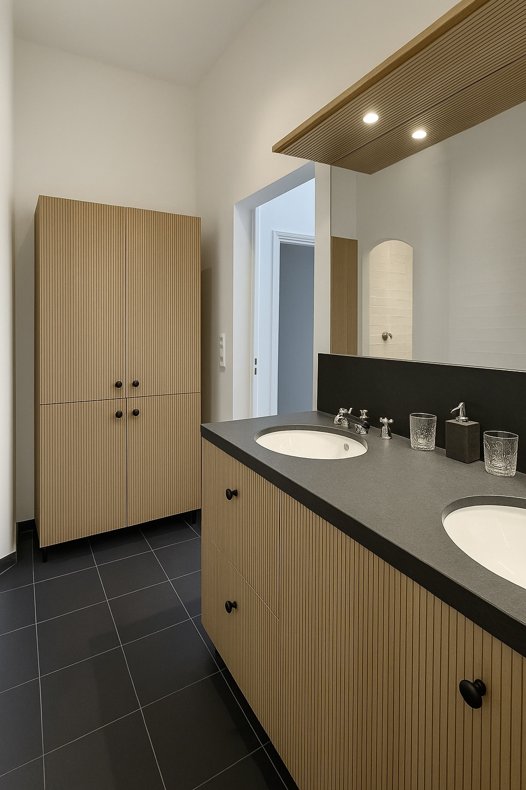 Badkamer: Luxe uitgevoerd met ligbad, inloop-regendouche, dubbele wastafel in natuursteen, Dornbracht kranen en kastruimte.