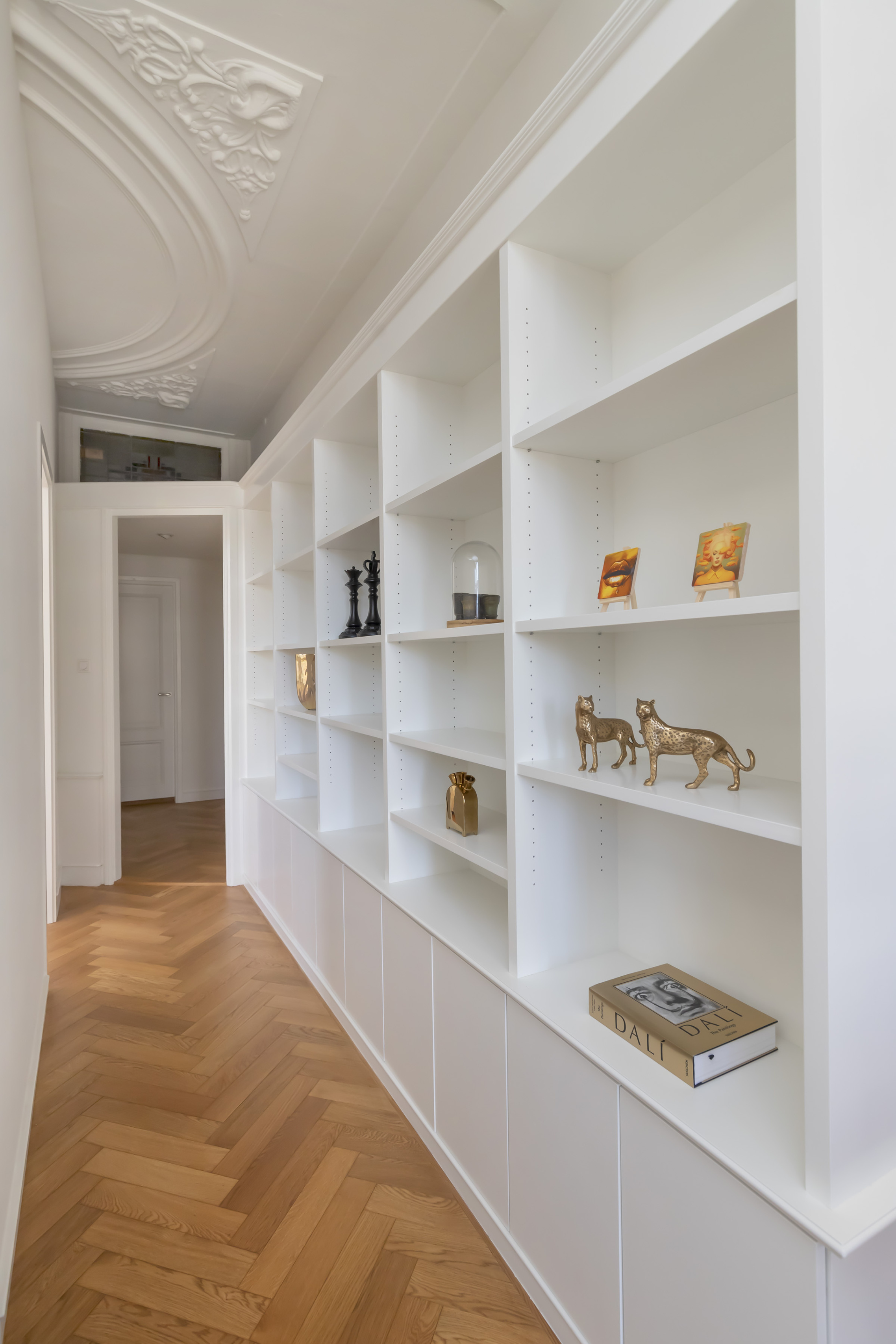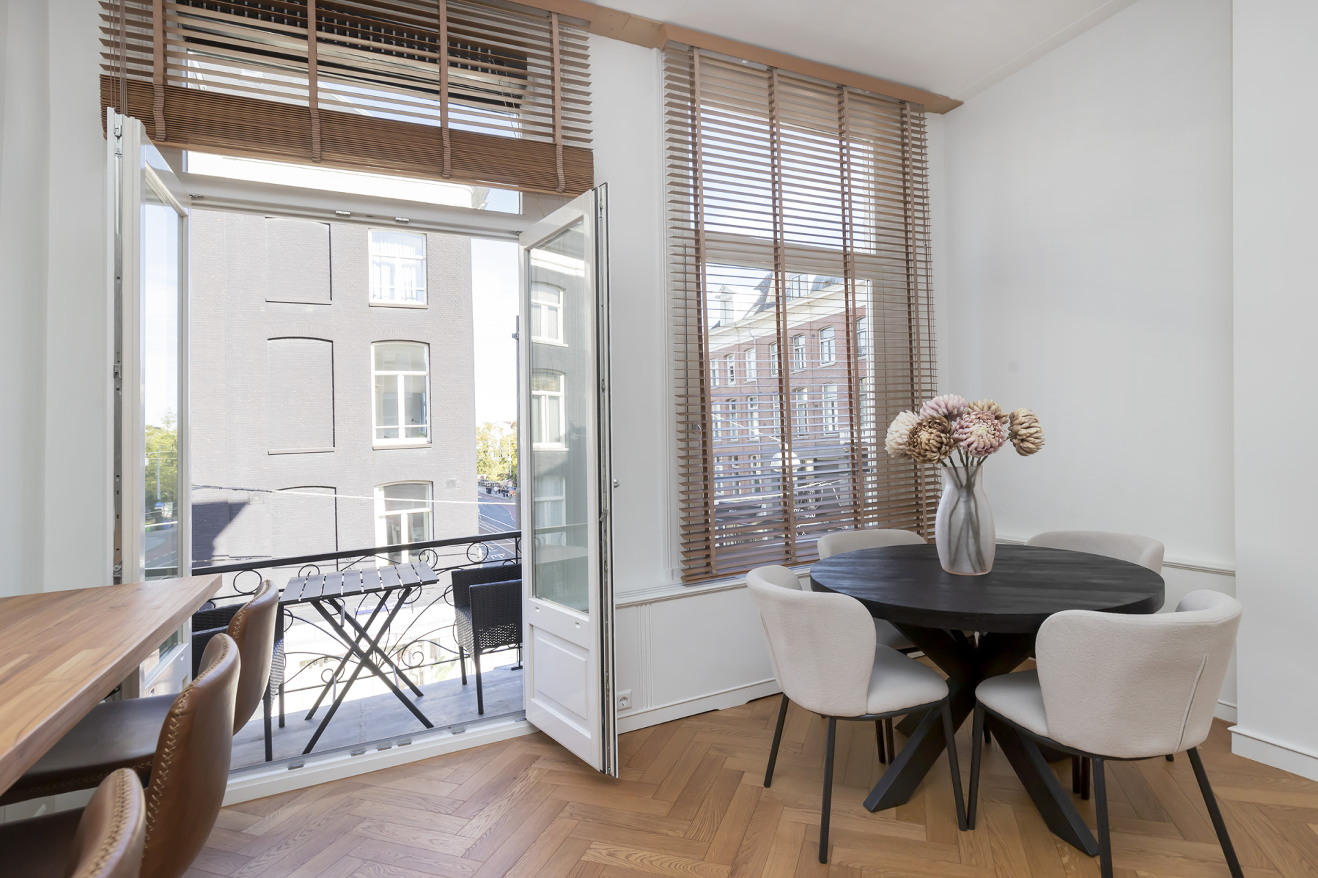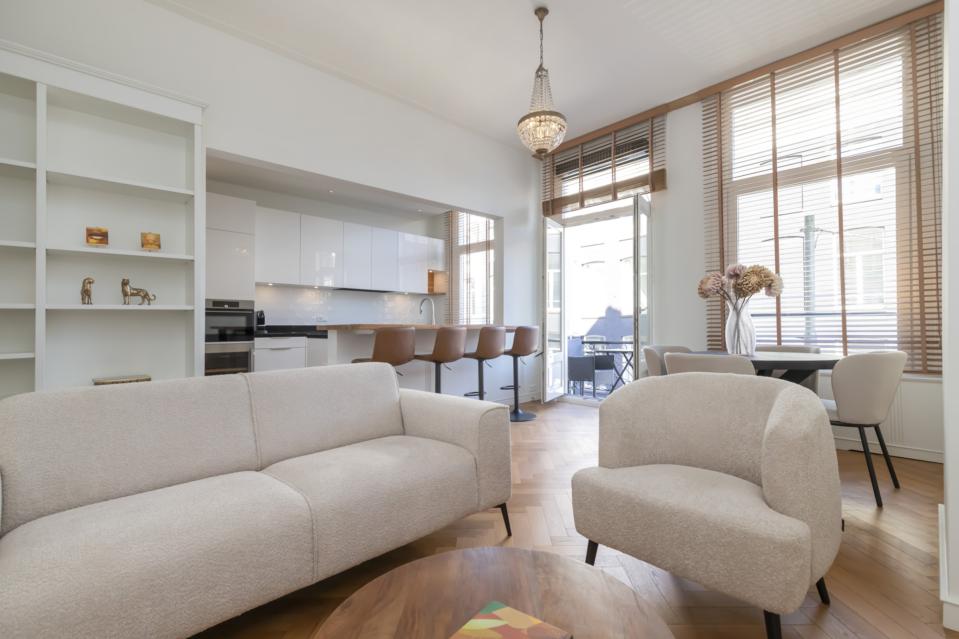 Woonkamer: Elegante lambrisering, op maat gemaakte kastenwand en dubbele openslaande deuren naar het balkon met fraai uitzicht.