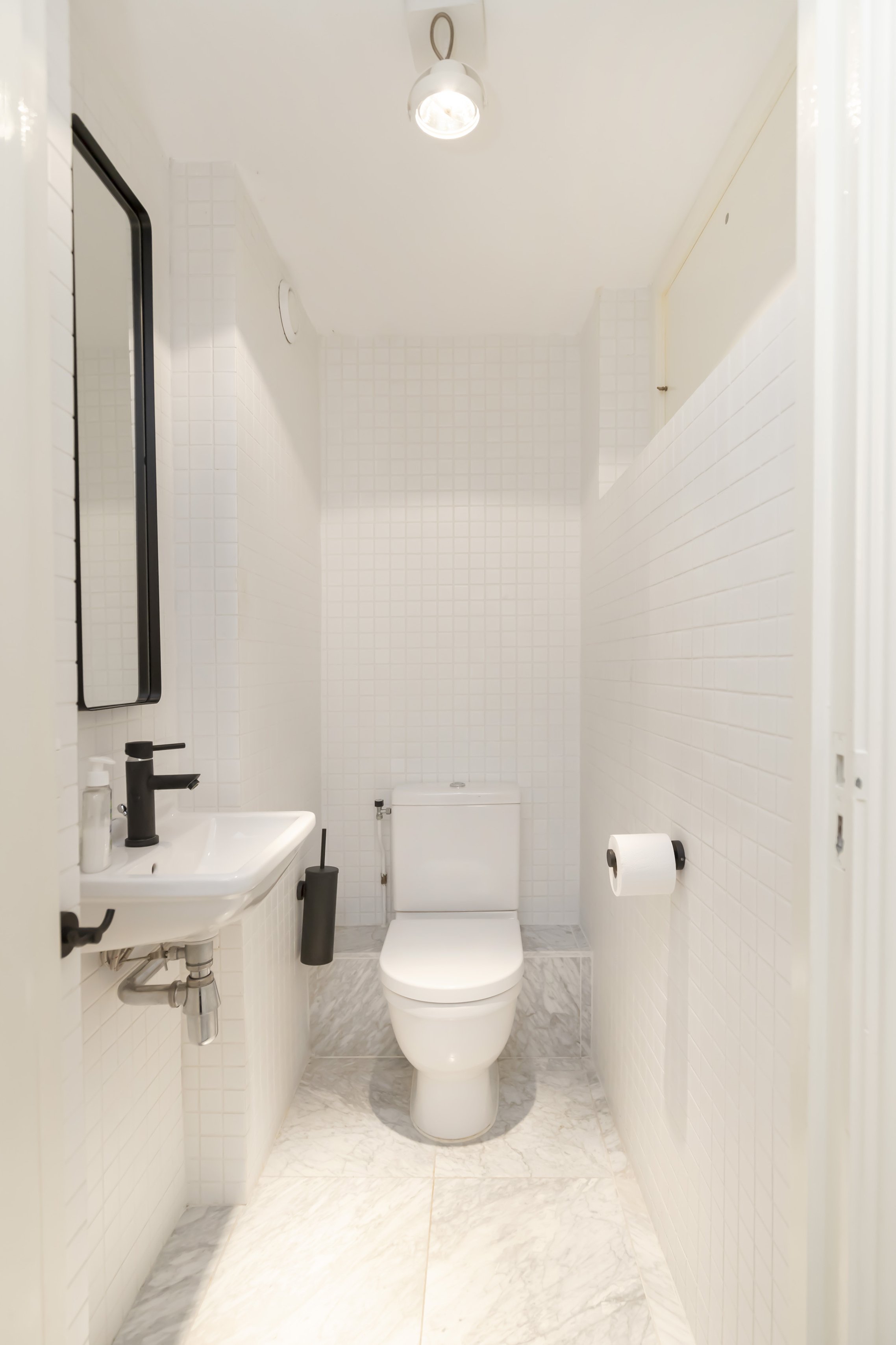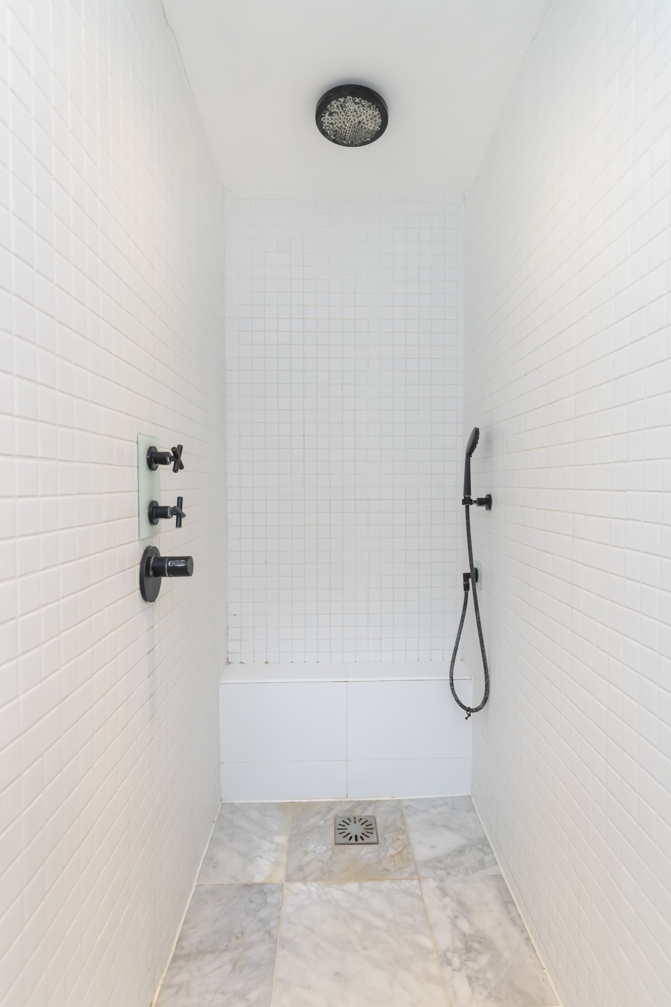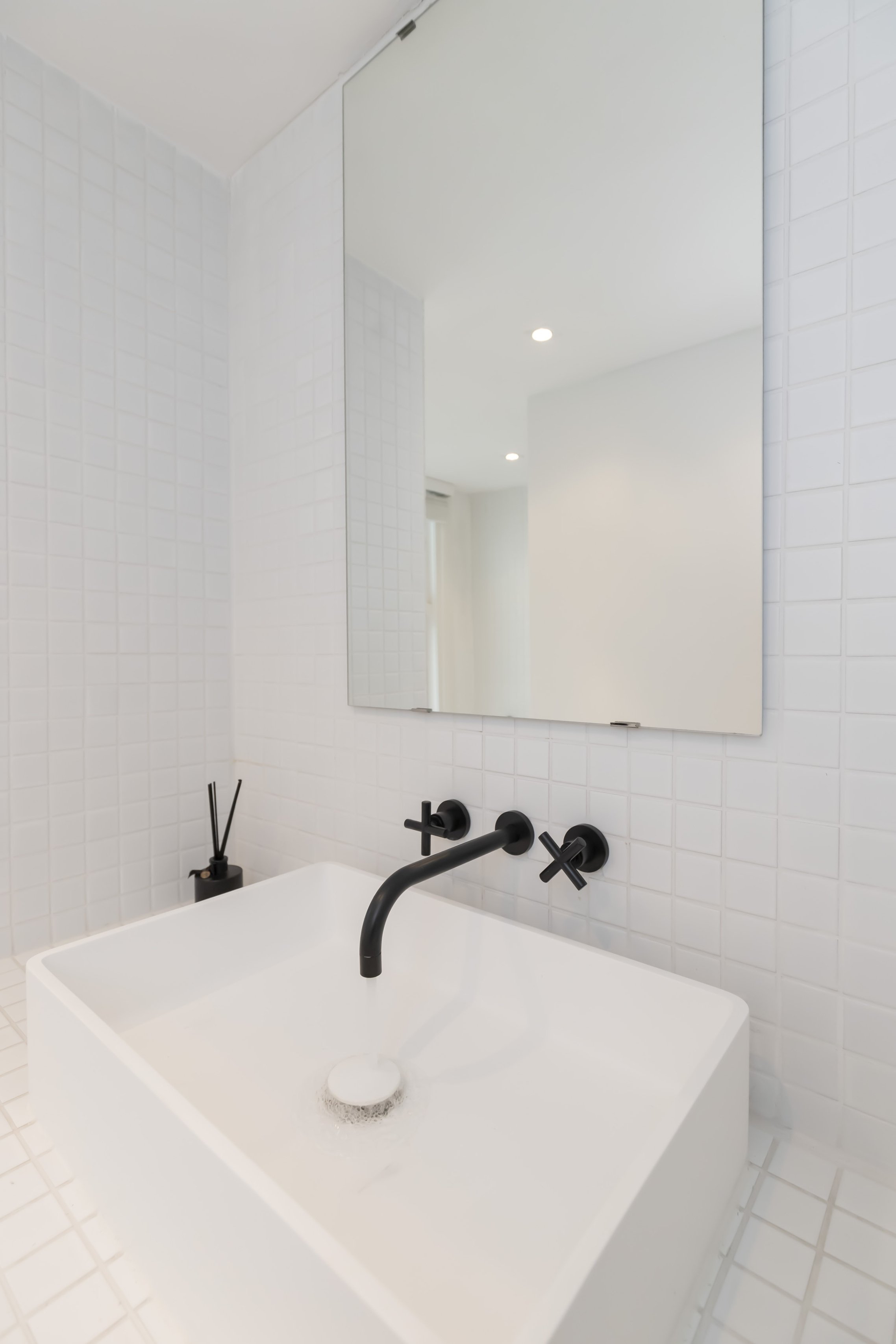 Op de tweede verdieping is de grote slaapkamer met en-suite badkamer. Deze badkamer heeft een inloopdouche, wastafel en een wc.