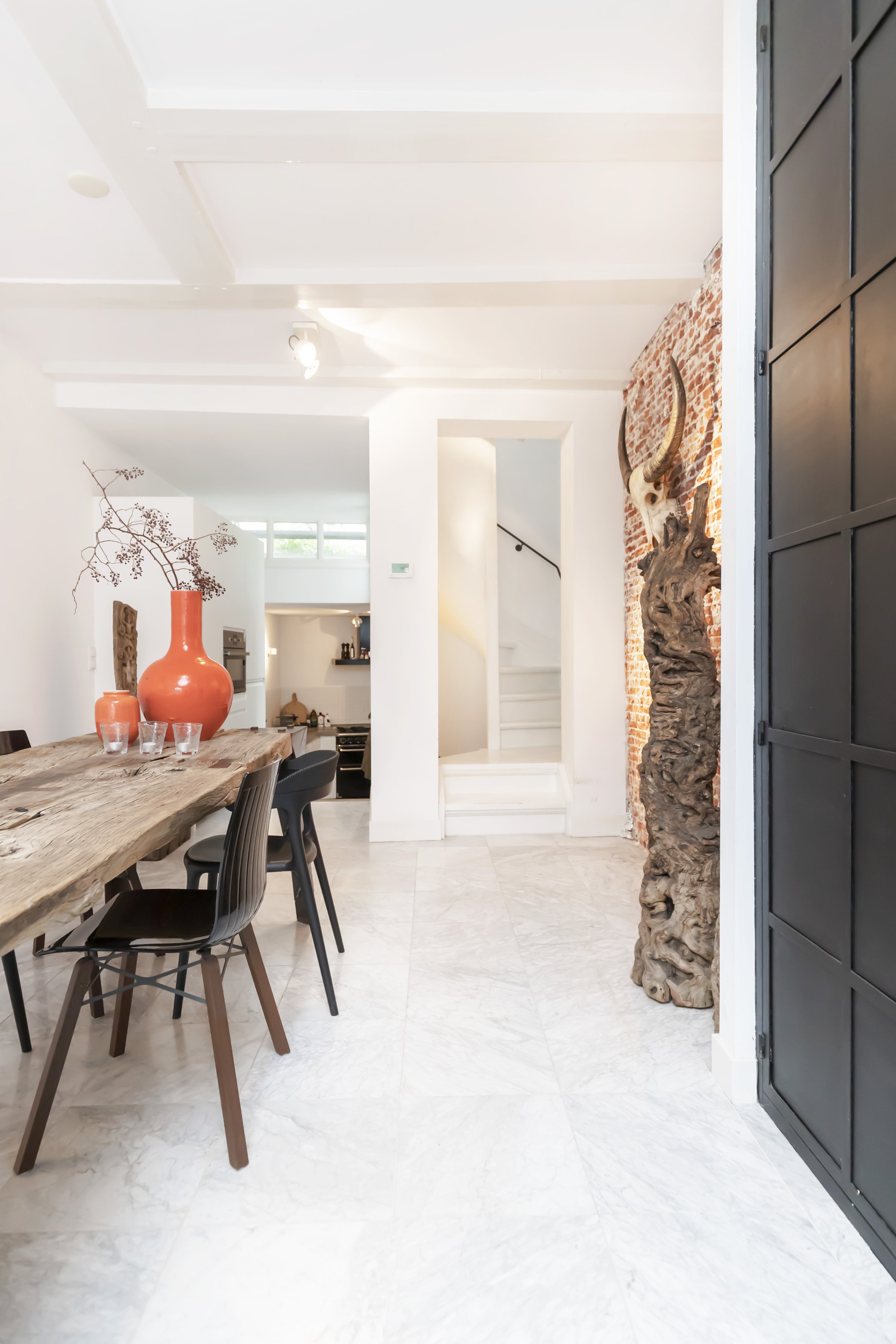 De entree is op de beletage. Dit is een mooie eetkamer met marmeren vloer, balkenplafond en een ”Brick” muur. De halfopen keuken is 3 treden lager gelegen en goed geoutilleerd met een groot gasfornuis met dubbele oven, afzuigkap, vaatwasser, lade vriezer, 2 ijskasten en een magnetron.