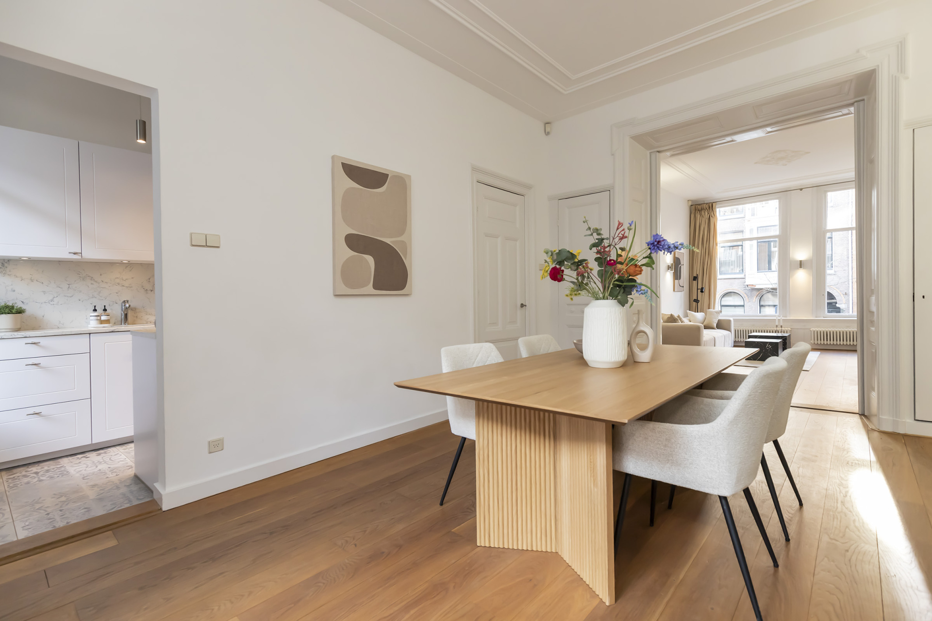 De bel-etage, waar zich tevens de entree bevindt, is royaal opgezet met een woonkamer met twee grote ramen aan de voorzijde en een plafondhoogte van ca. 3,26 m. De klassieke kamer-en-suite creëert een fraaie zichtlijn van voor- naar achterzijde en versterkt het gevoel van ruimte en diepte.