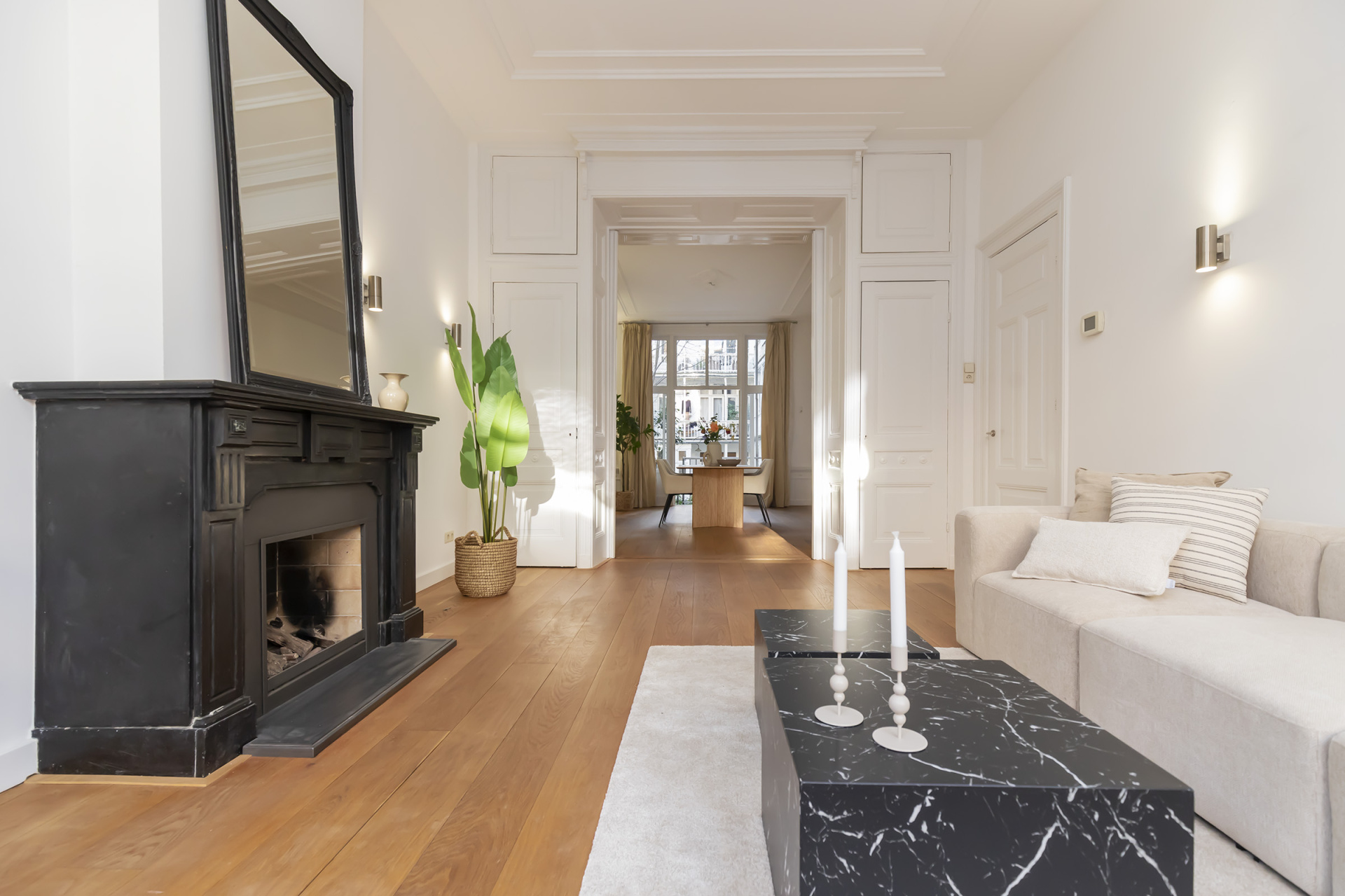 Rijk lijstwerk, paneeldeuren, vaste kasten en een karakteristieke schouw met gashaard geven de ruimte een statige en elegante uitstraling. Aan de voorzijde bevindt zich de zitkamer met grote raampartijen en vrij uitzicht over de straat.